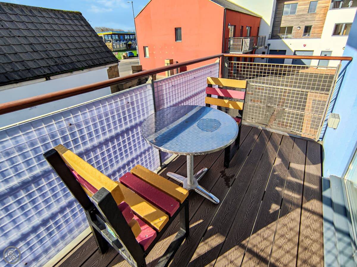 You get your own little detached garden area out the front, which looks over the harbour. There's also a balcony off the living room. It's sunny in the afternoon. Inside, it's all open plan.