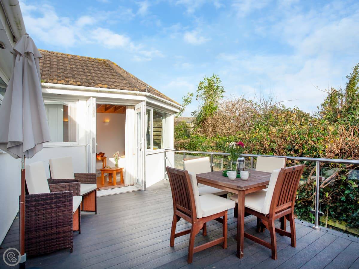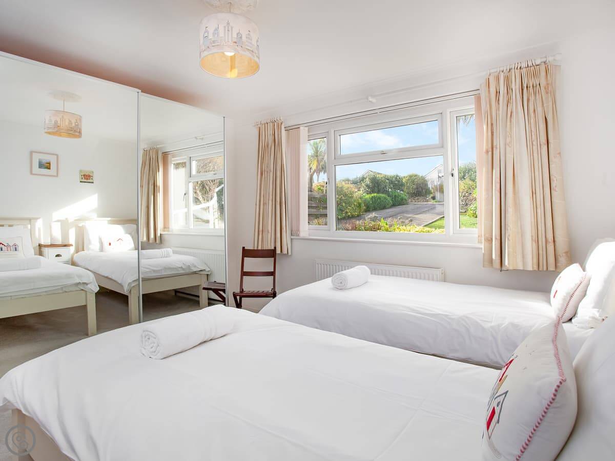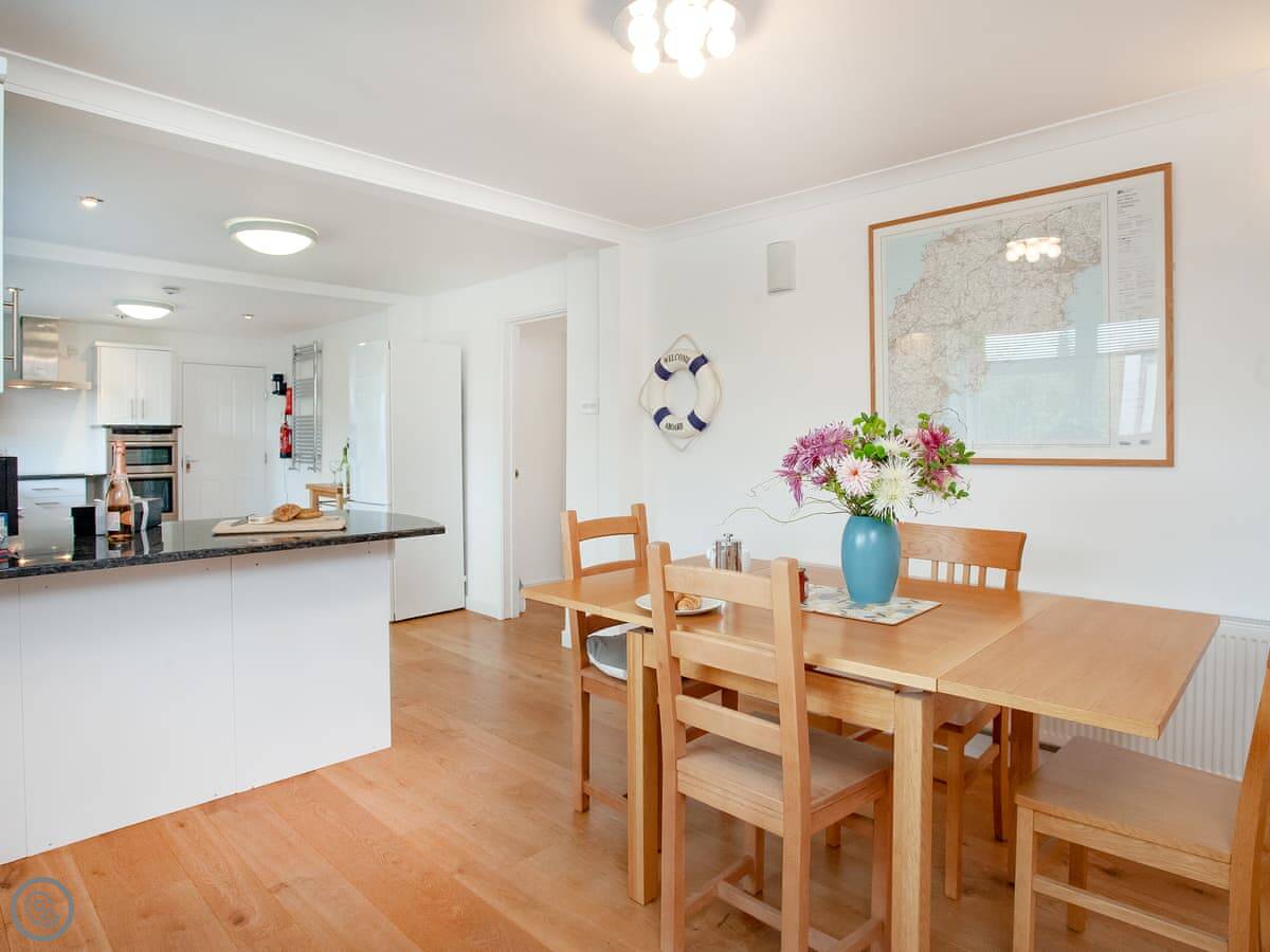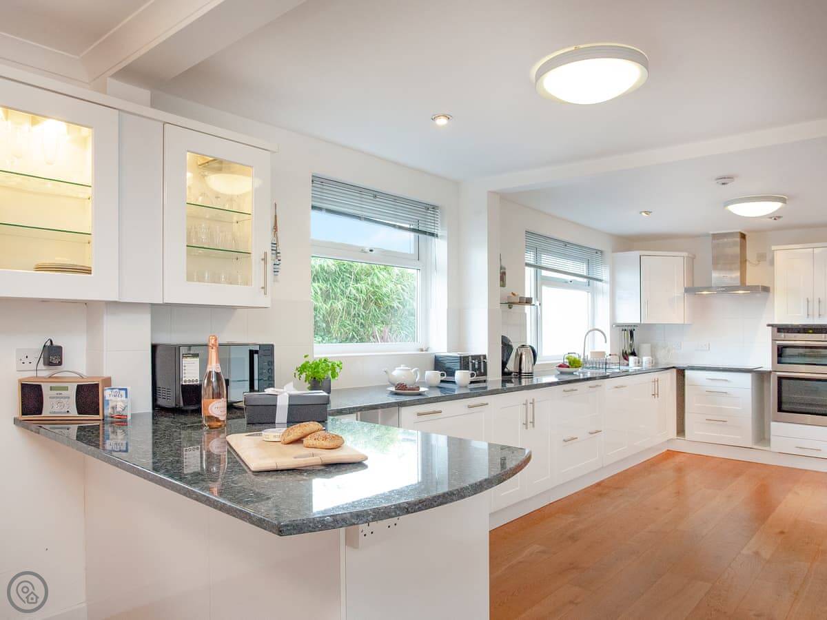 It sleeps four. There are two bedrooms and two bathrooms. It's got a 5 Star rating, which means it's recently refurbished and well-equipped. A lot of storage. The garage is big. You can fit surfboards or kayaks in there.