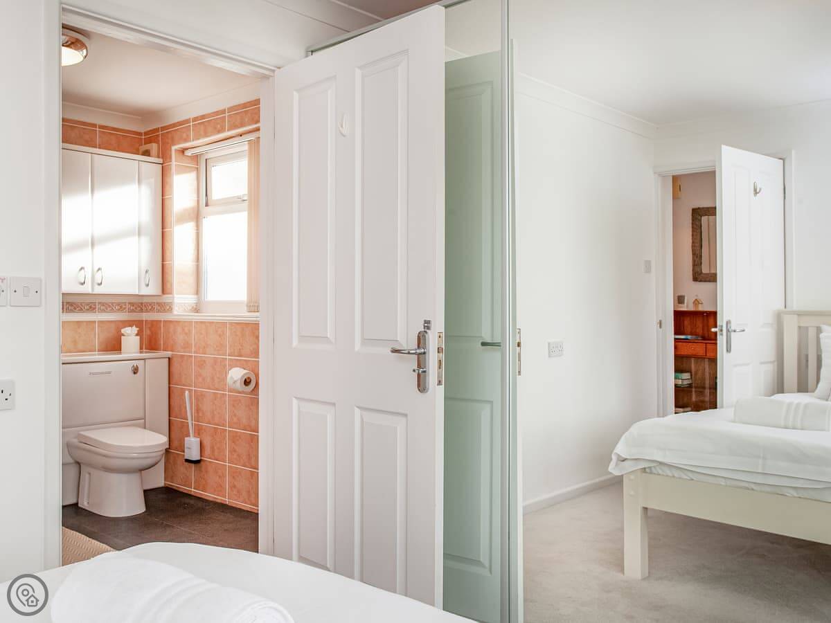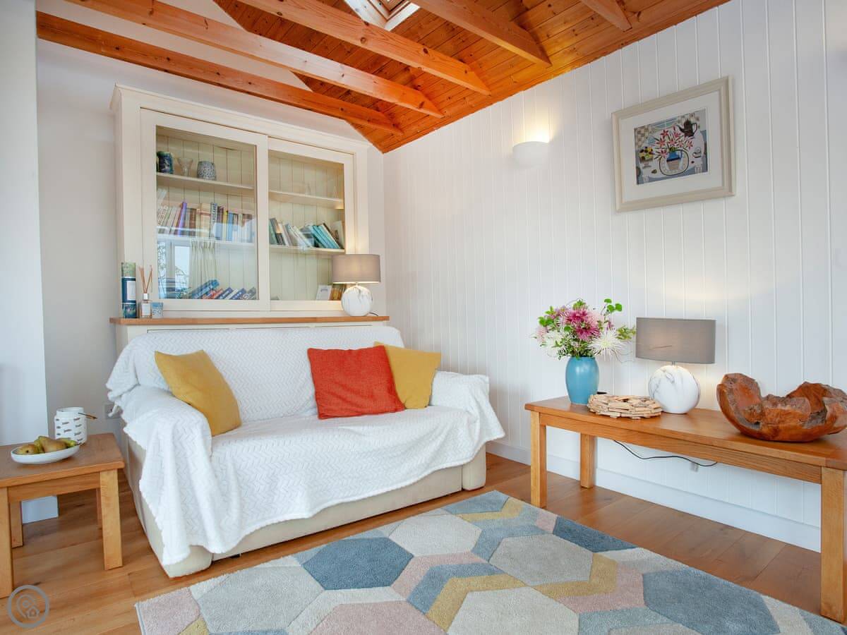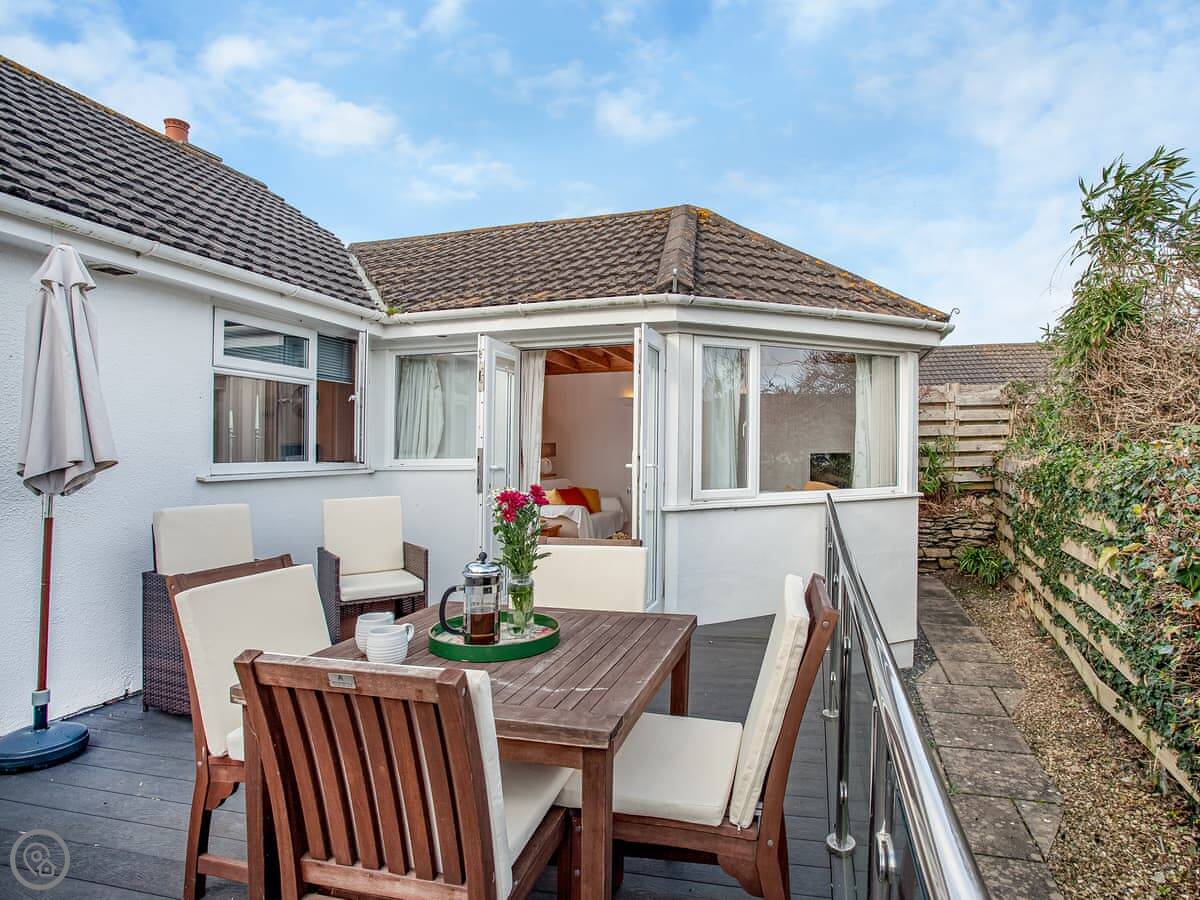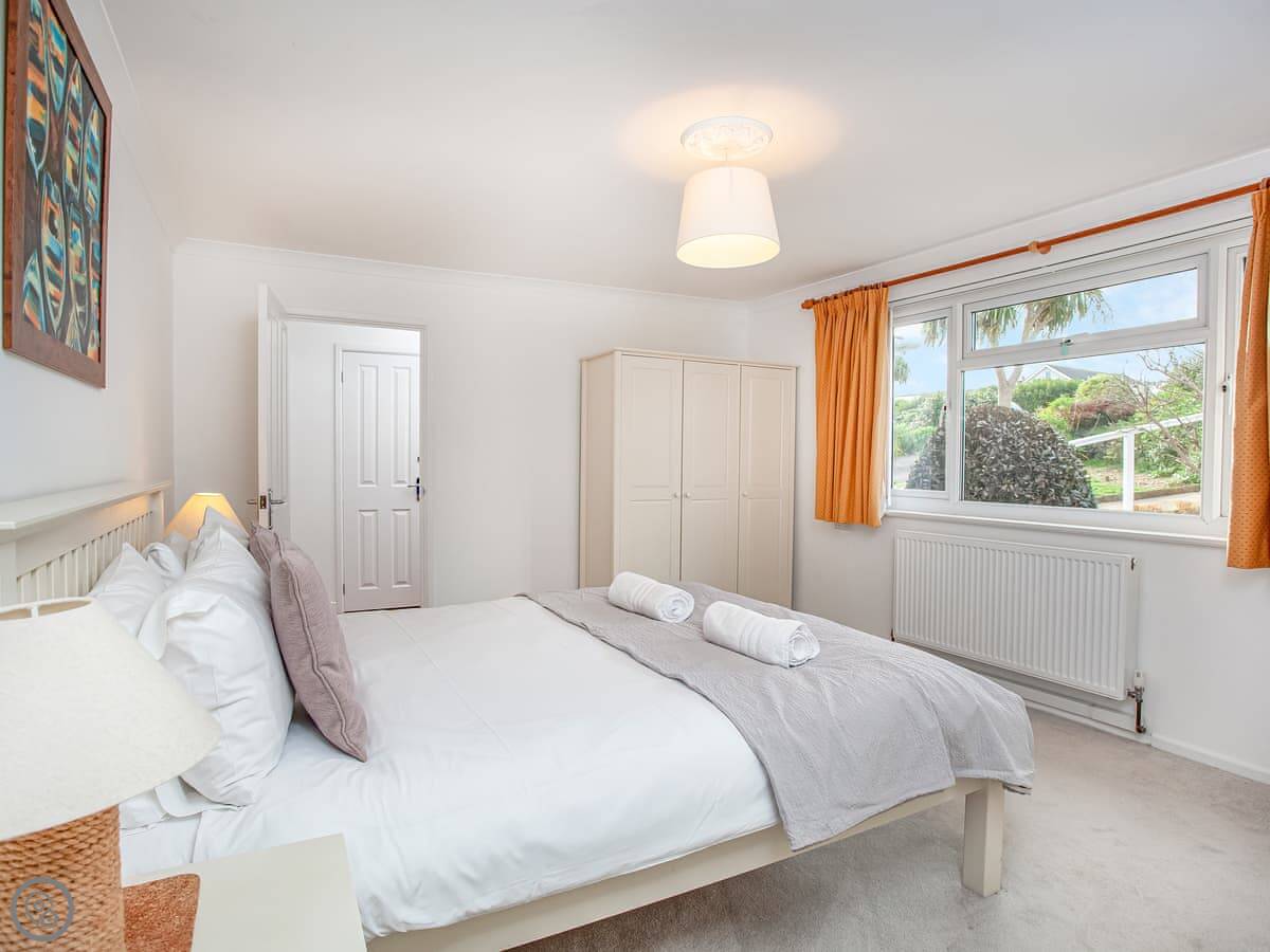 It sleeps four. There are two bedrooms and two bathrooms. It's got a 5 Star rating, which means it's recently refurbished and well-equipped. A lot of storage. The garage is big. You can fit surfboards or kayaks in there.