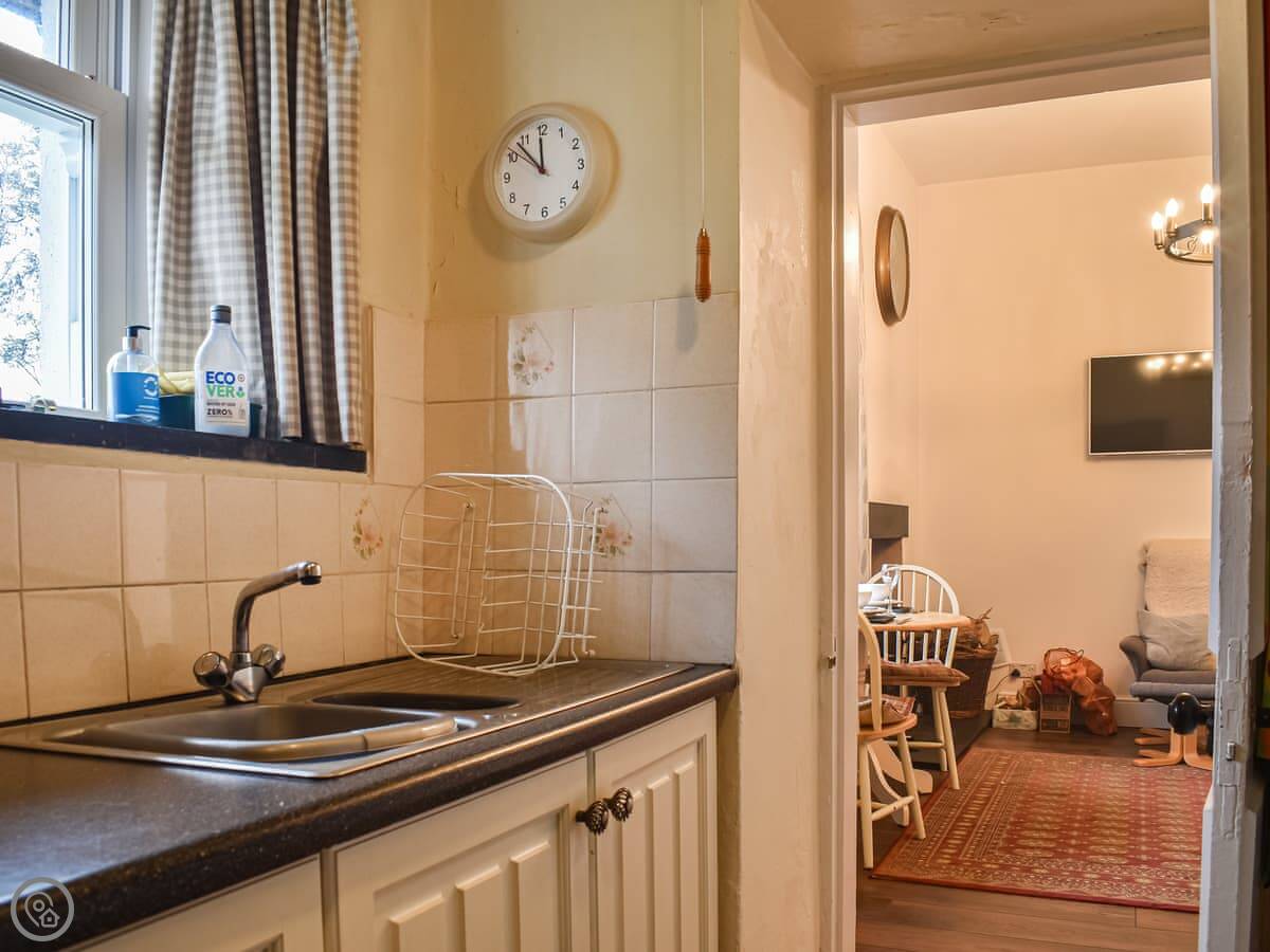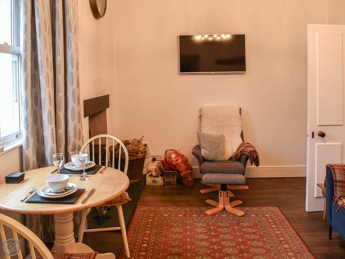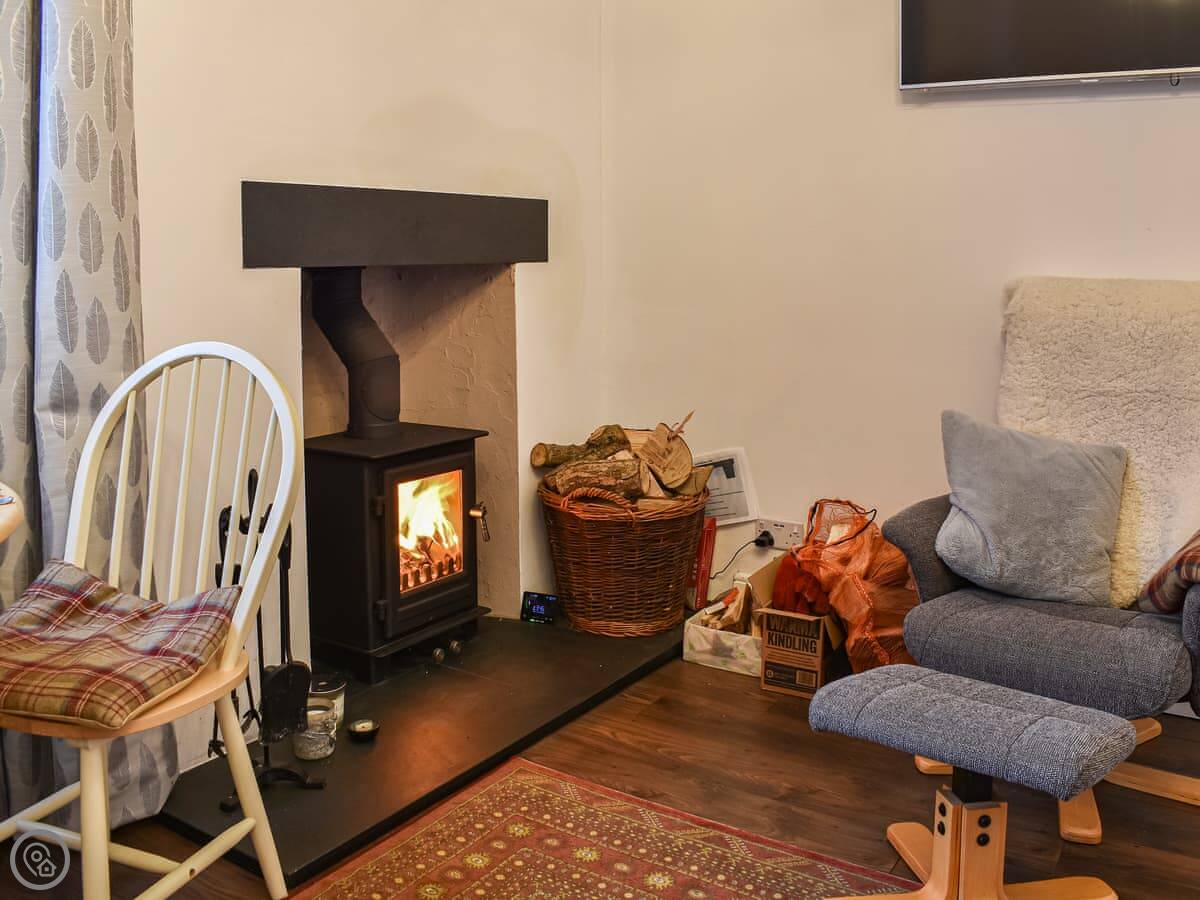 Inside, there's one main living space with the kitchen, dining area, and sitting area all together. There's a wood burner which keeps it cosy. There's a recliner chair as well as the sofa.