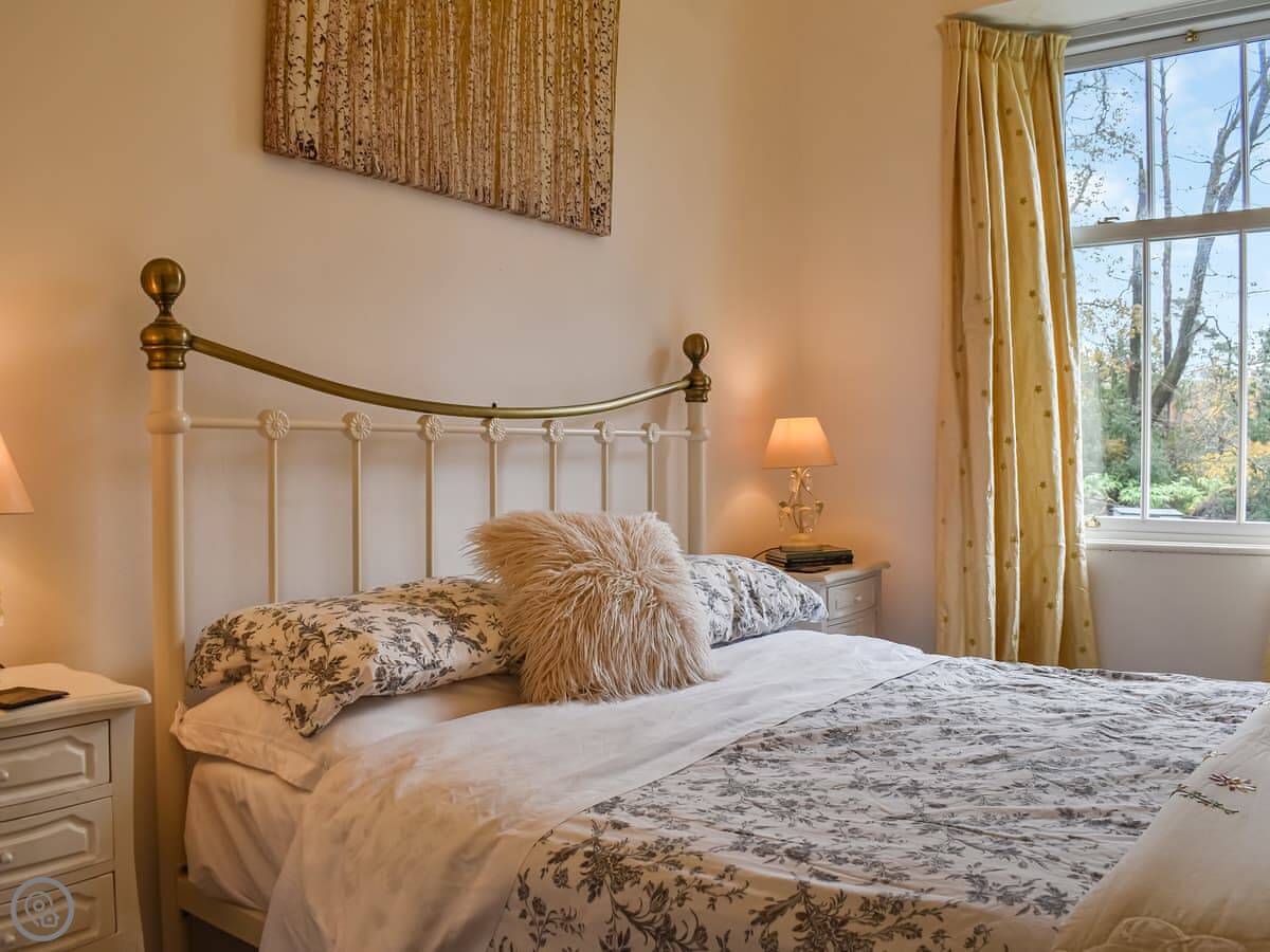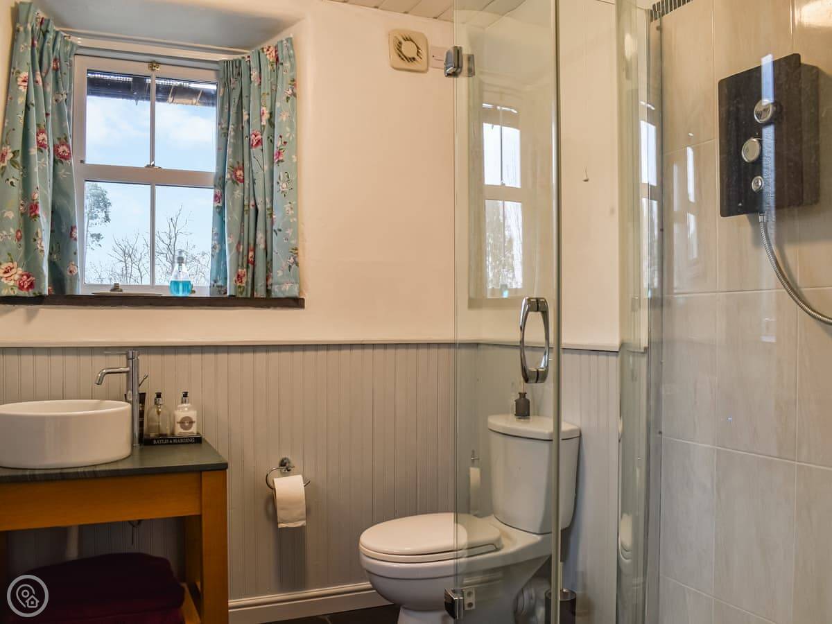 It sleeps five. Three bedrooms: one king size, one with twin beds, and a single. They all look out onto the trees. There's one bathroom with a shower.