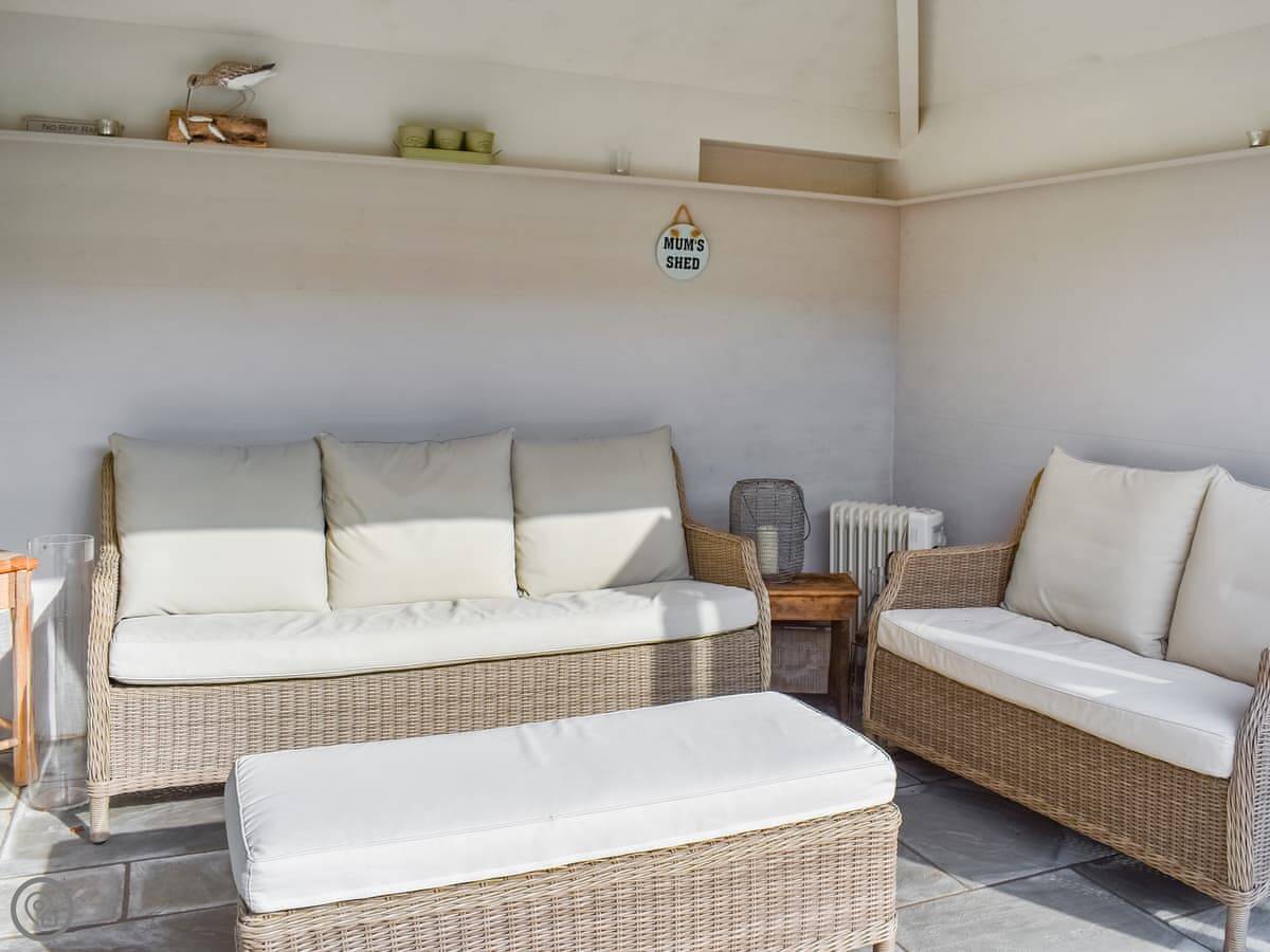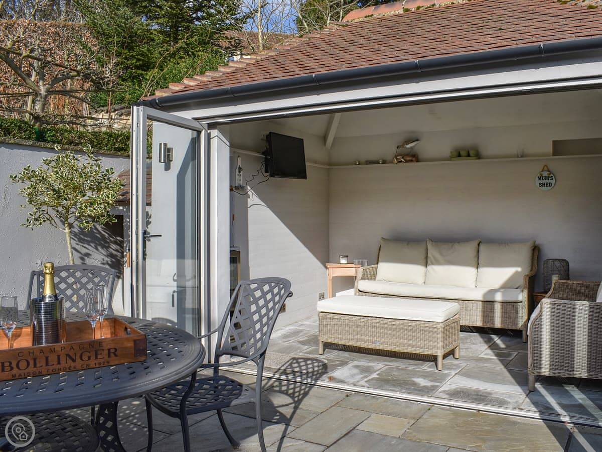 Outside, there's a private patio with a table and a barbecue. And there's a separate sun room too, which is a nice extra space with another sofa and a wine cooler.