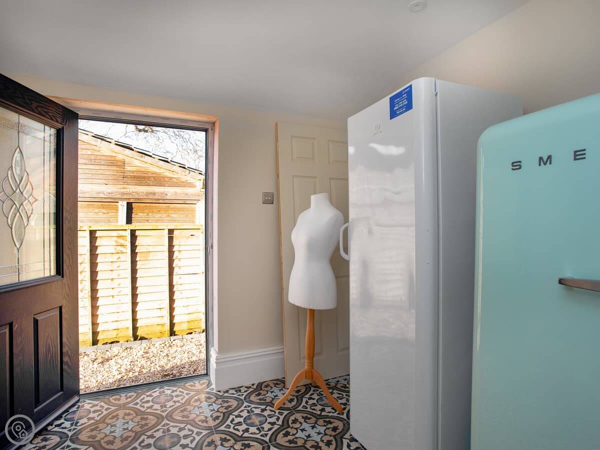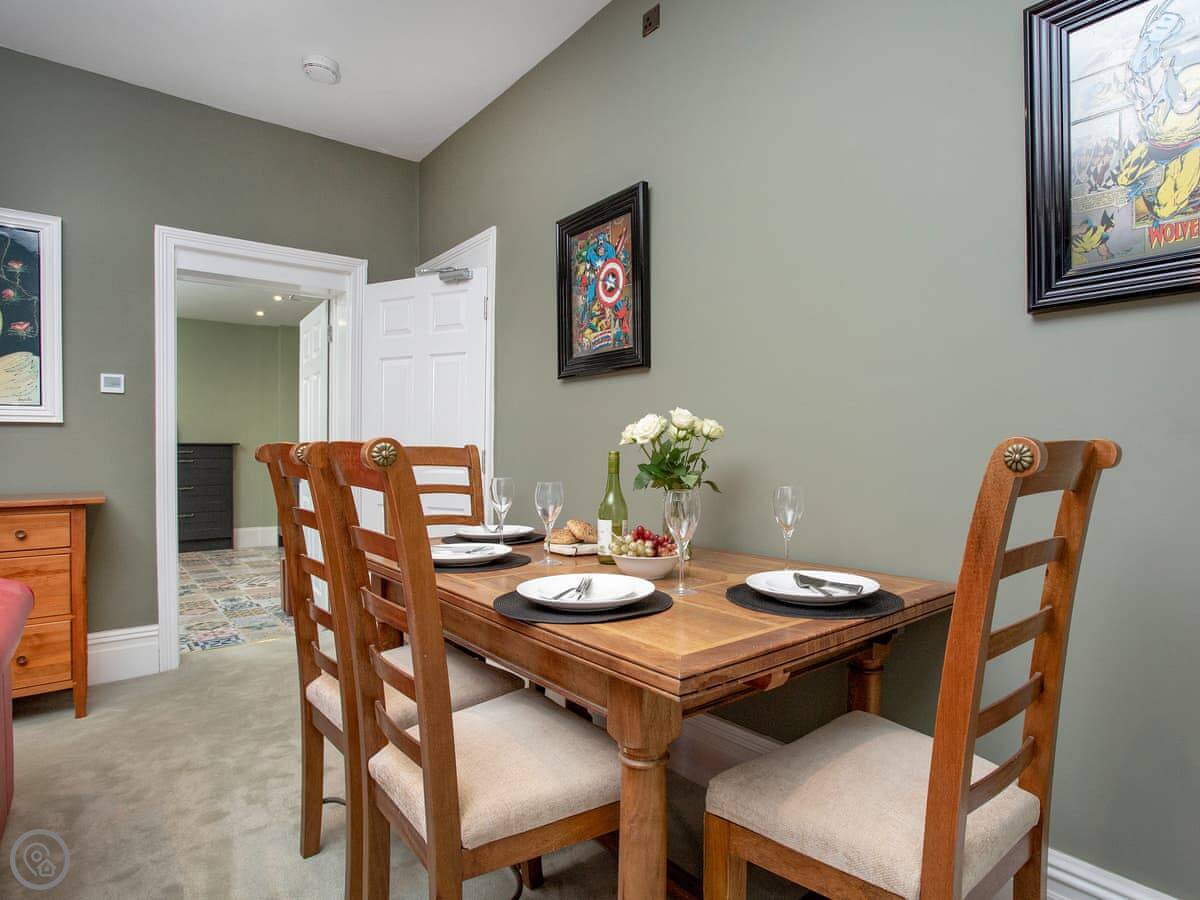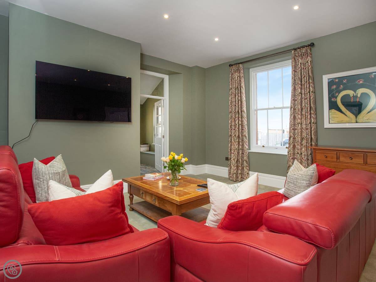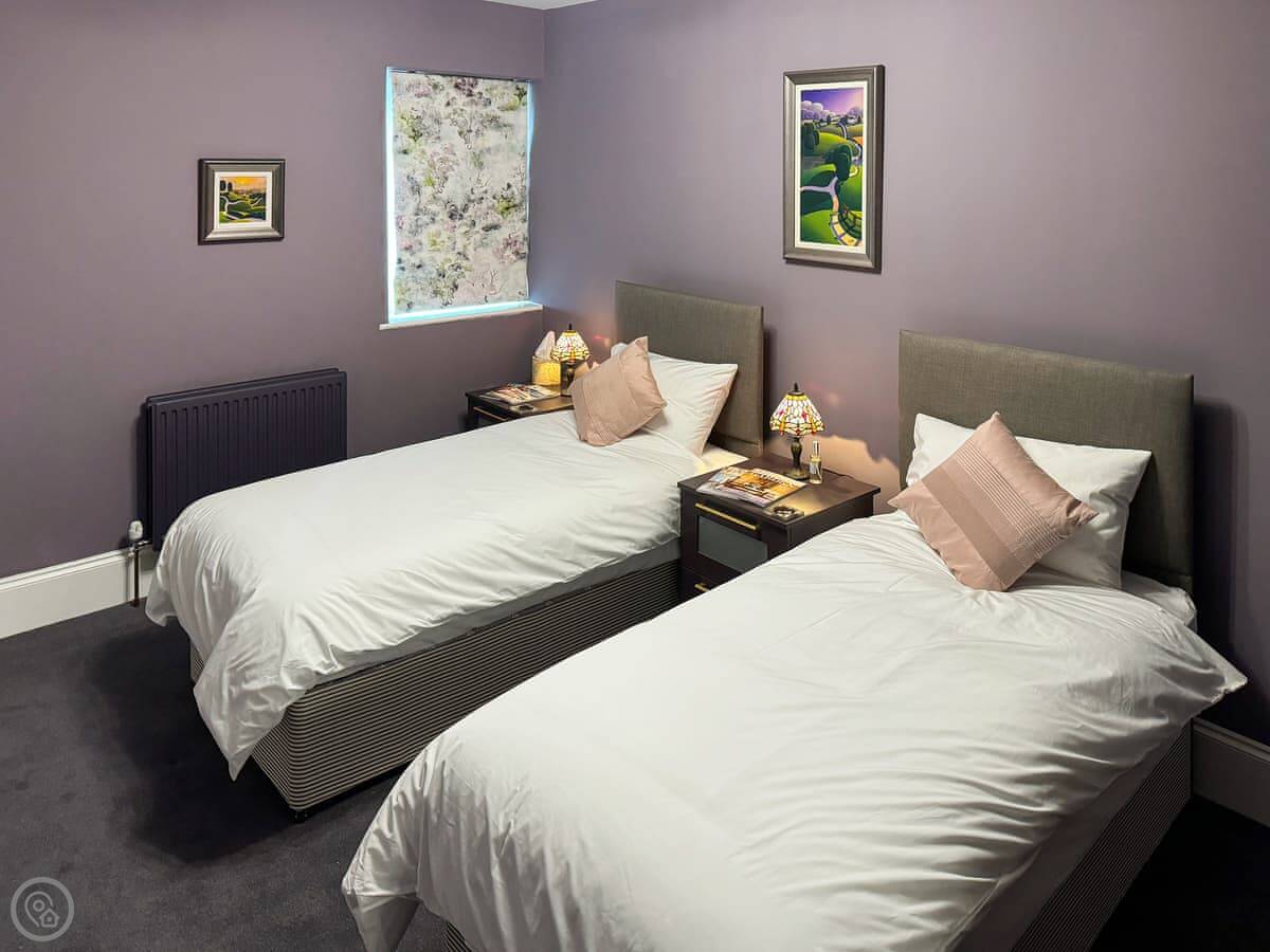 It's the grand west wing of an old vicarage. It's been recently done up to a high standard, a five-star rating. Doesn't feel like a typical cottage. It's more of a smart, modern holiday home. Underfloor heating downstairs, that sort of thing. Sleeps four, two bedrooms upstairs. One kingsize, one twin. Both have TVs.