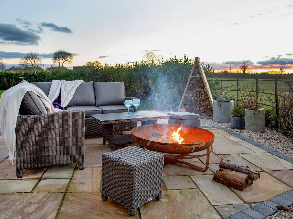 Downstairs there's a living and dining area that opens into the kitchen. It's well equipped: dishwasher, washing machine, coffee machine. There's a Smart TV and a PlayStation 5. Outside the back there's a private patio with a firepit. There's also a shared lawn area to the side you can use.