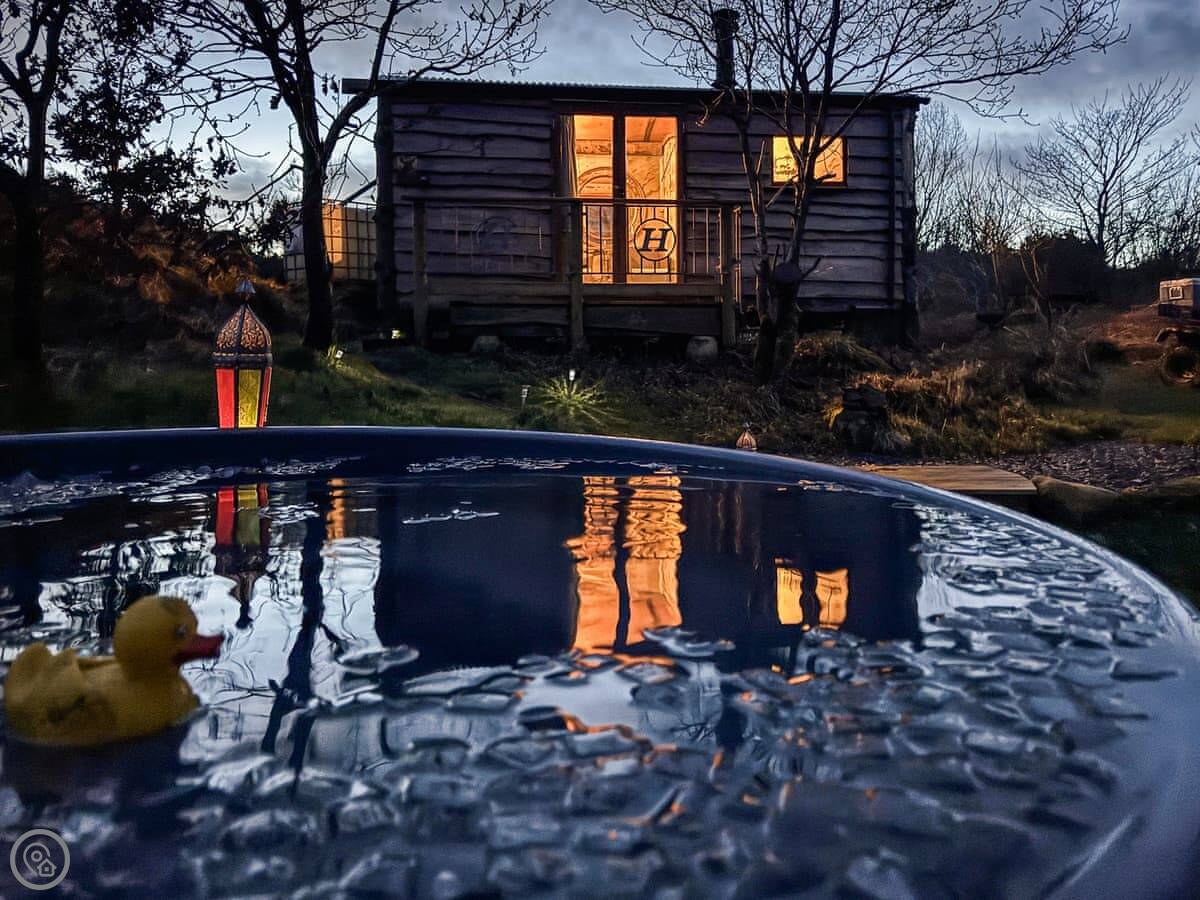 Outside, there's a wood-burning hot tub.