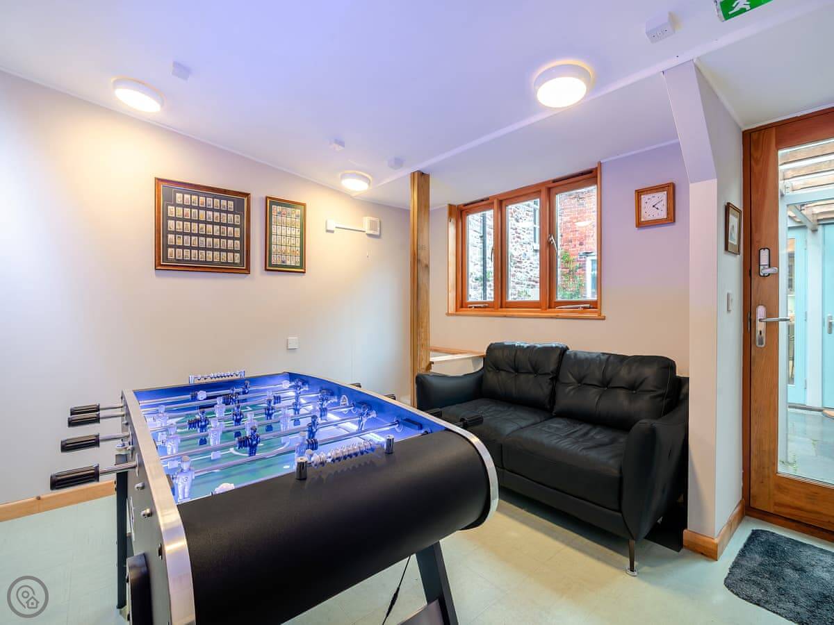 The kitchen is a good size, with a dishwasher and washing machine. The living room is on the first floor. Outside there's a courtyard garden with a summer house. The summer house has a football table and darts board inside it.