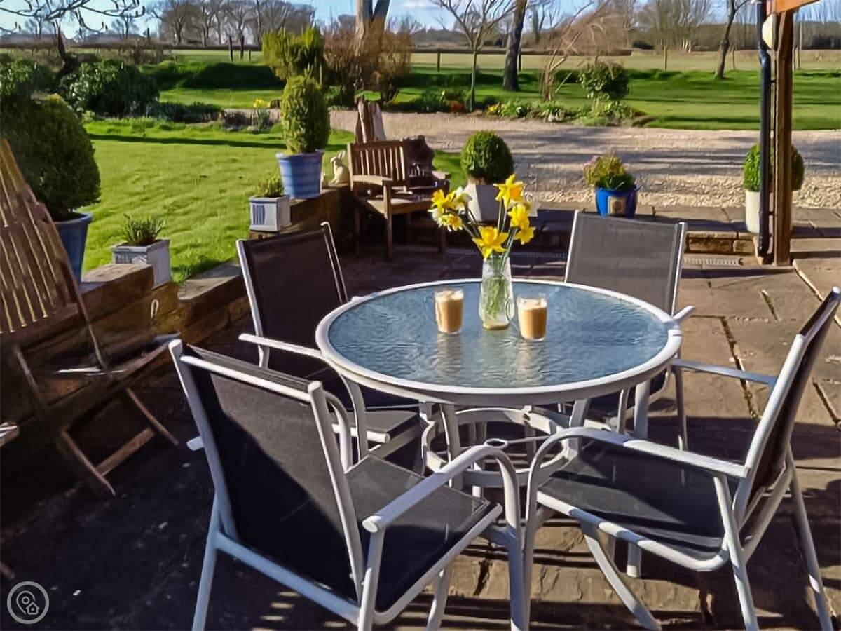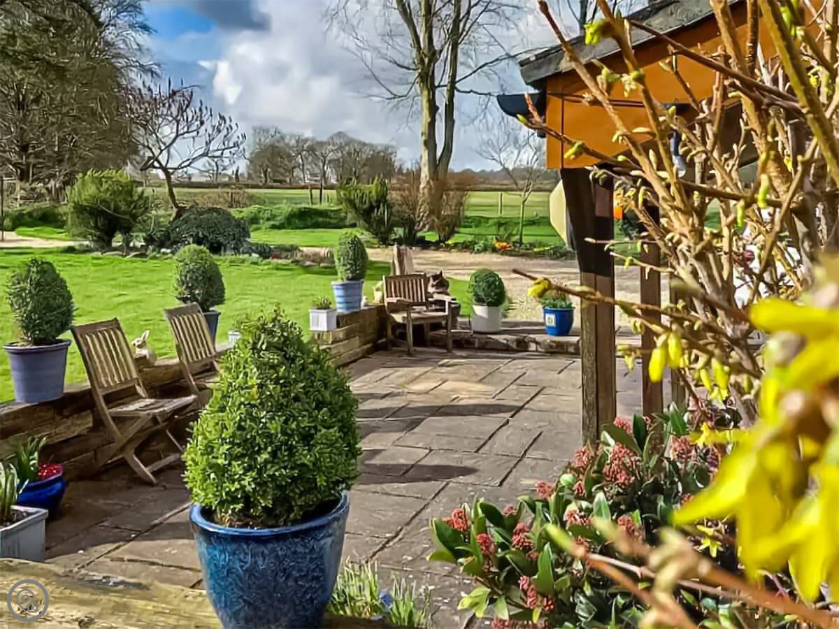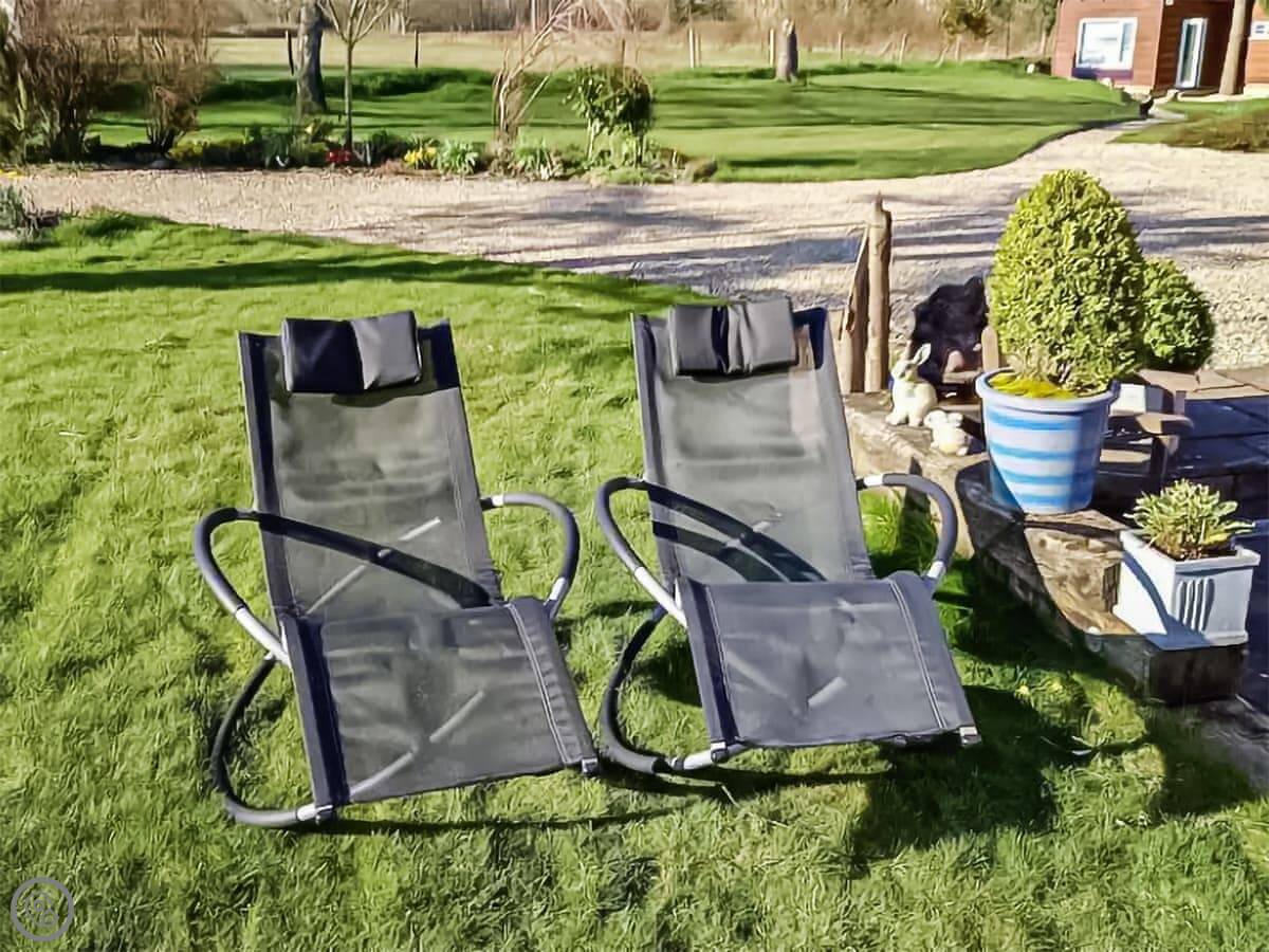 You get a big private patio with chairs, sun loungers and a fire pit. Wood is available to buy here. There's also a lawn next to it you can use. The garden isn't enclosed. We have cats that wander about.