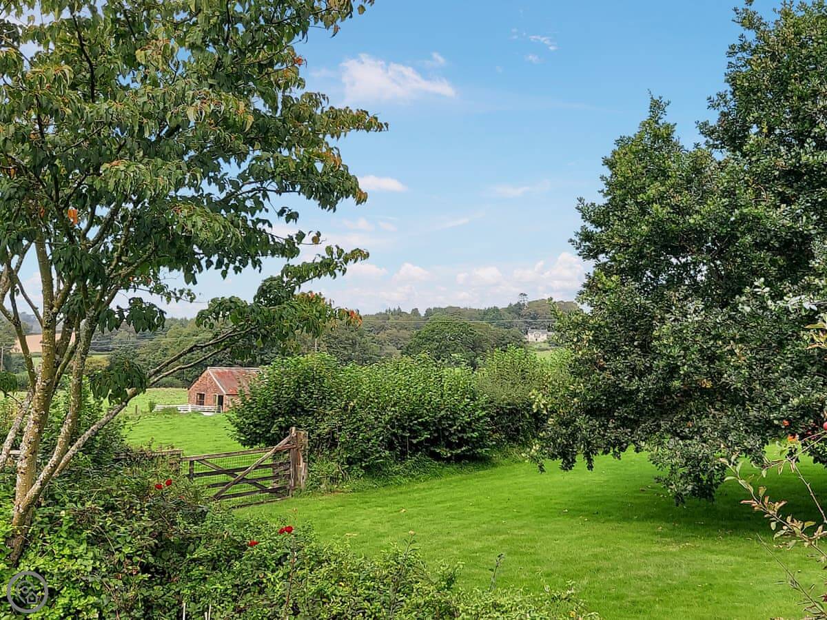 Outside, there's about an acre of enclosed orchard garden. It's fully fenced, so it's safe for dogs and children. There's a Wendy house, a picnic table, and a barbecue. You can also get access to the fields next door if you want a longer walk on the land.