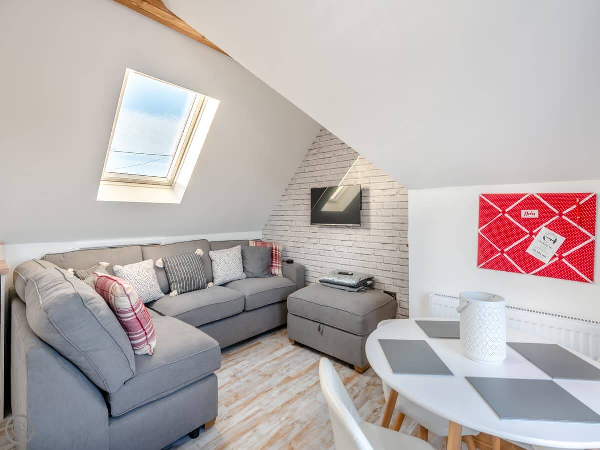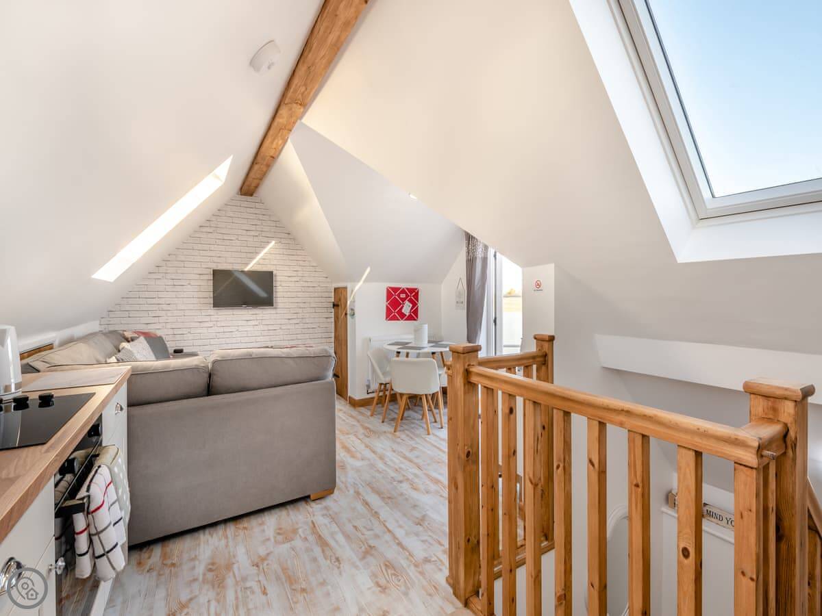 It sleeps four. Two bedrooms, one bathroom. It's got a 4 Star rating. The living space upstairs is open plan with French doors leading out onto a sitting area. It's a good spot for a morning coffee.