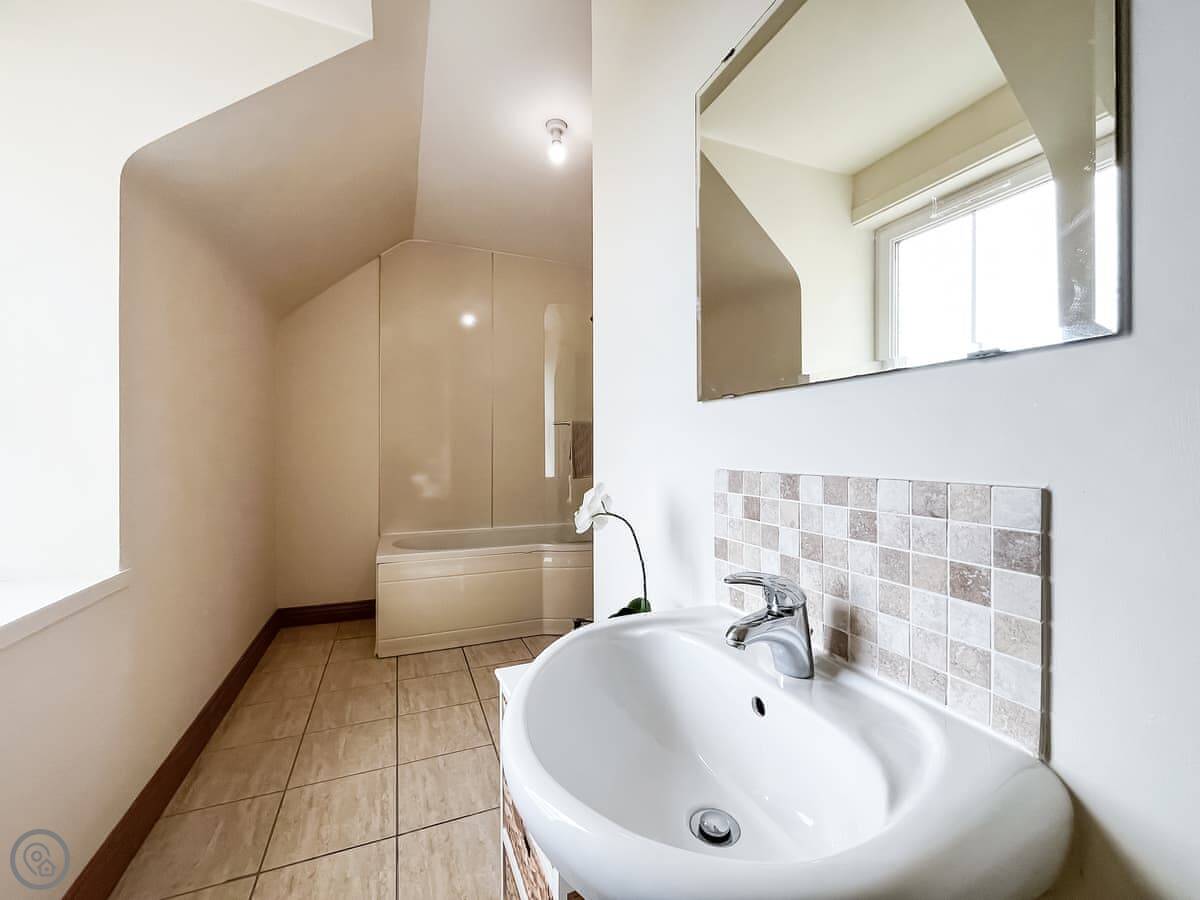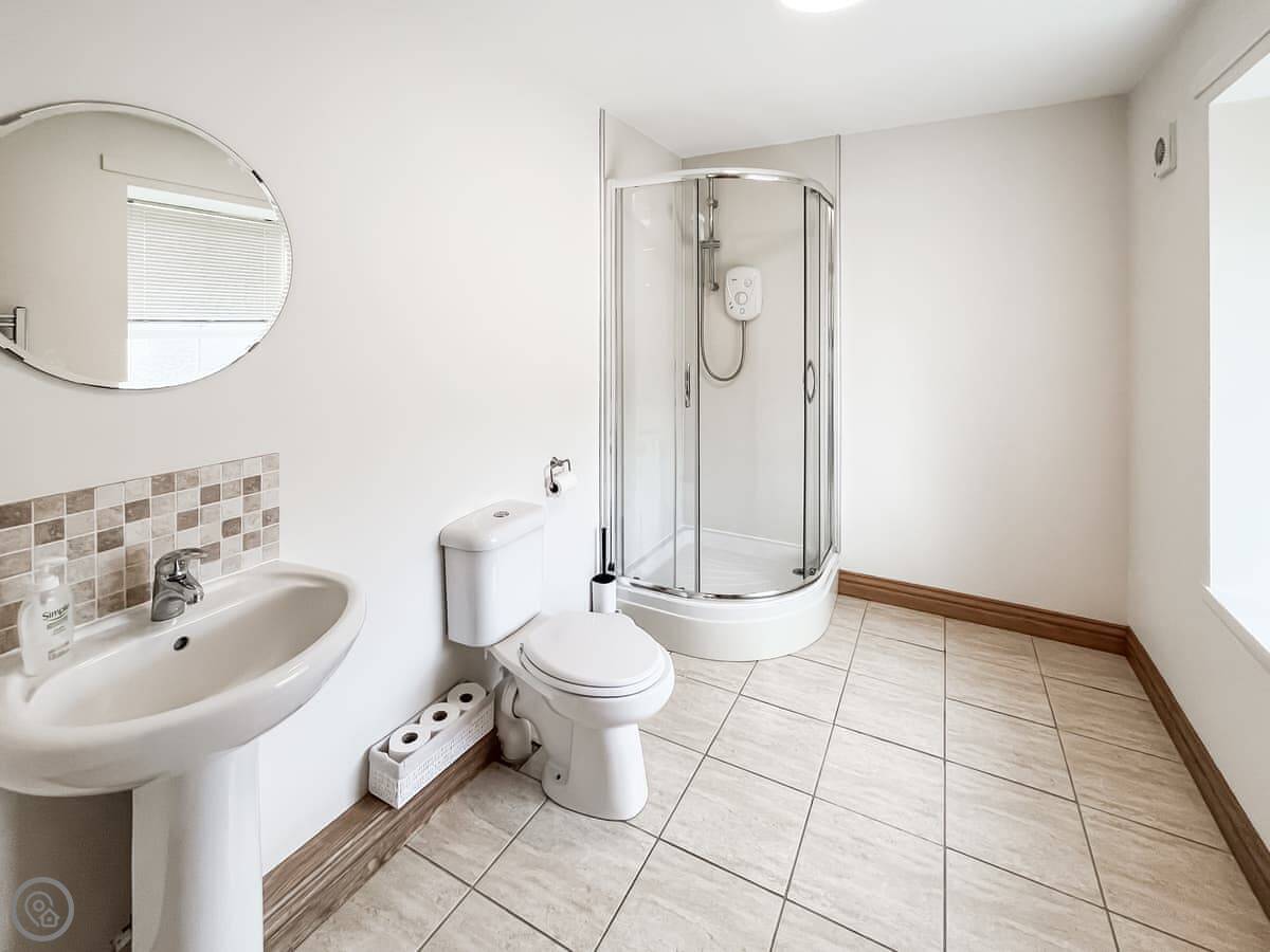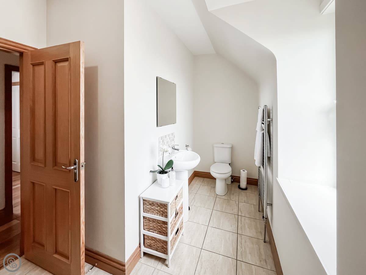 It sleeps five. Three bedrooms upstairs, two bathrooms (one shower room downstairs, one family bathroom up). It's a 4 Star place, so it's comfortable and well-equipped. The stairs are the original farm building stairs, so they're a bit steep and turn a corner.