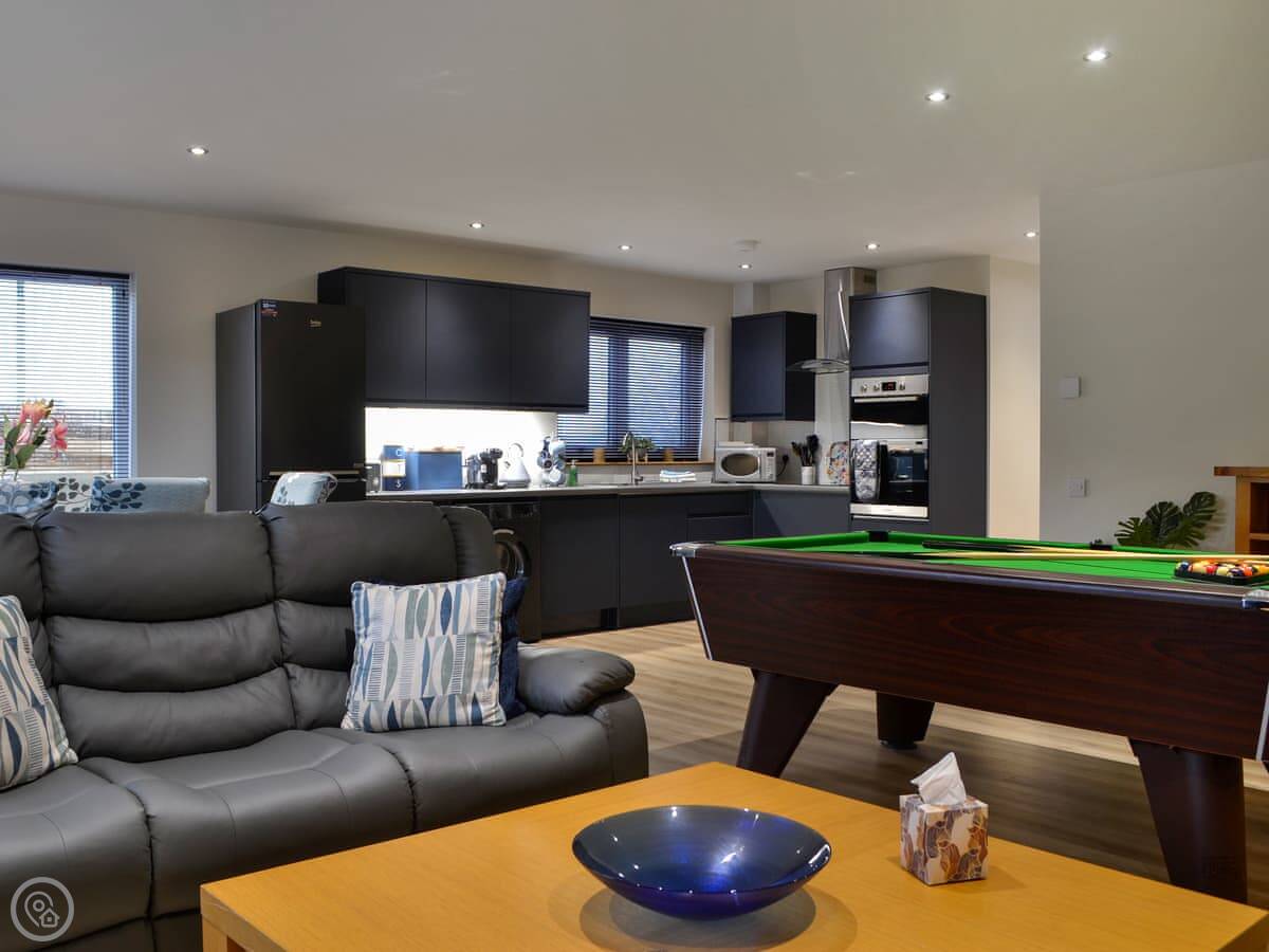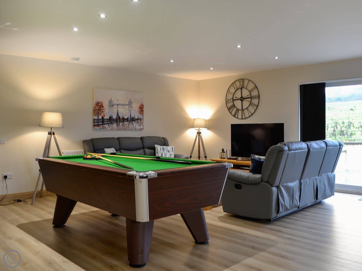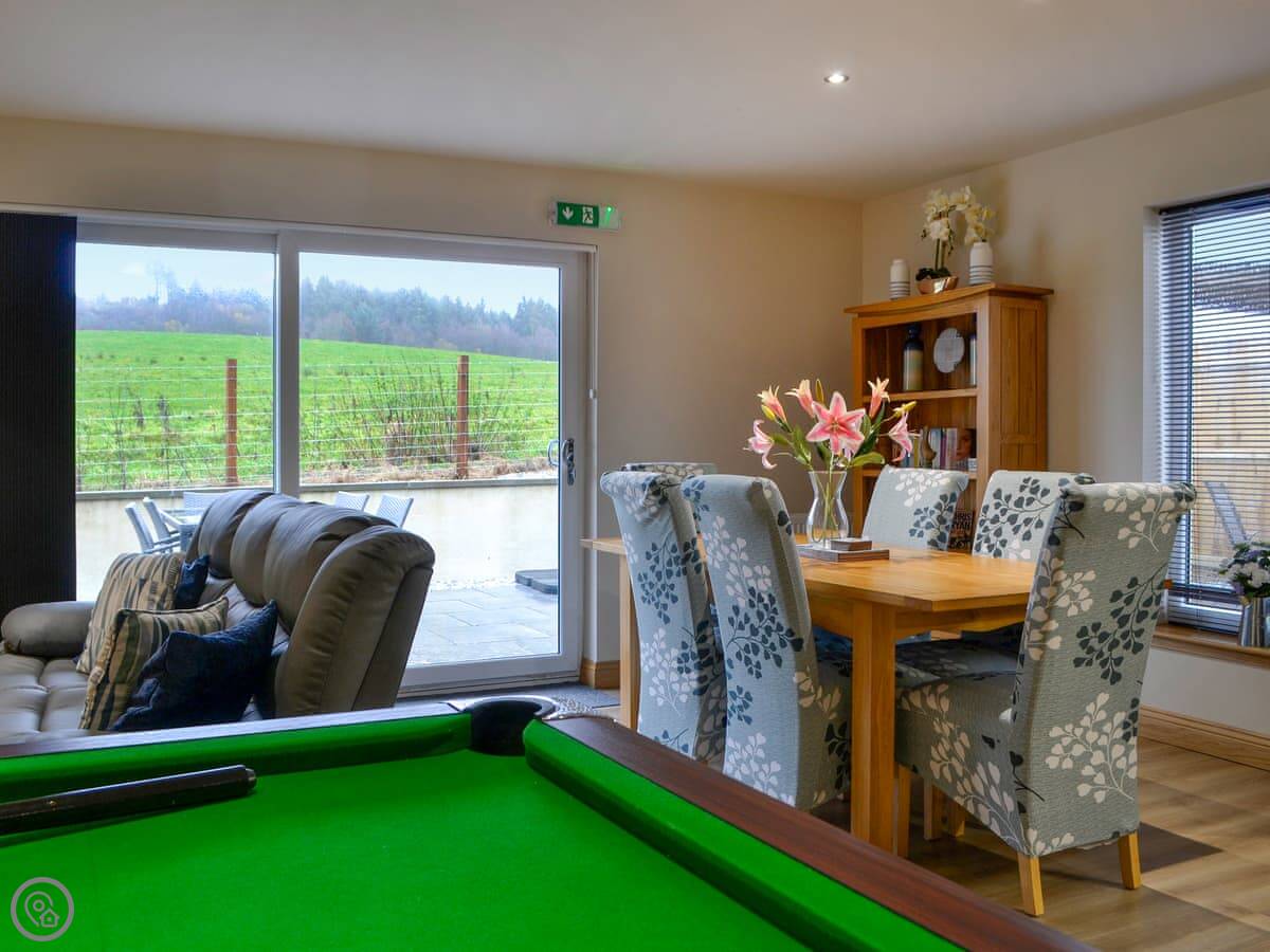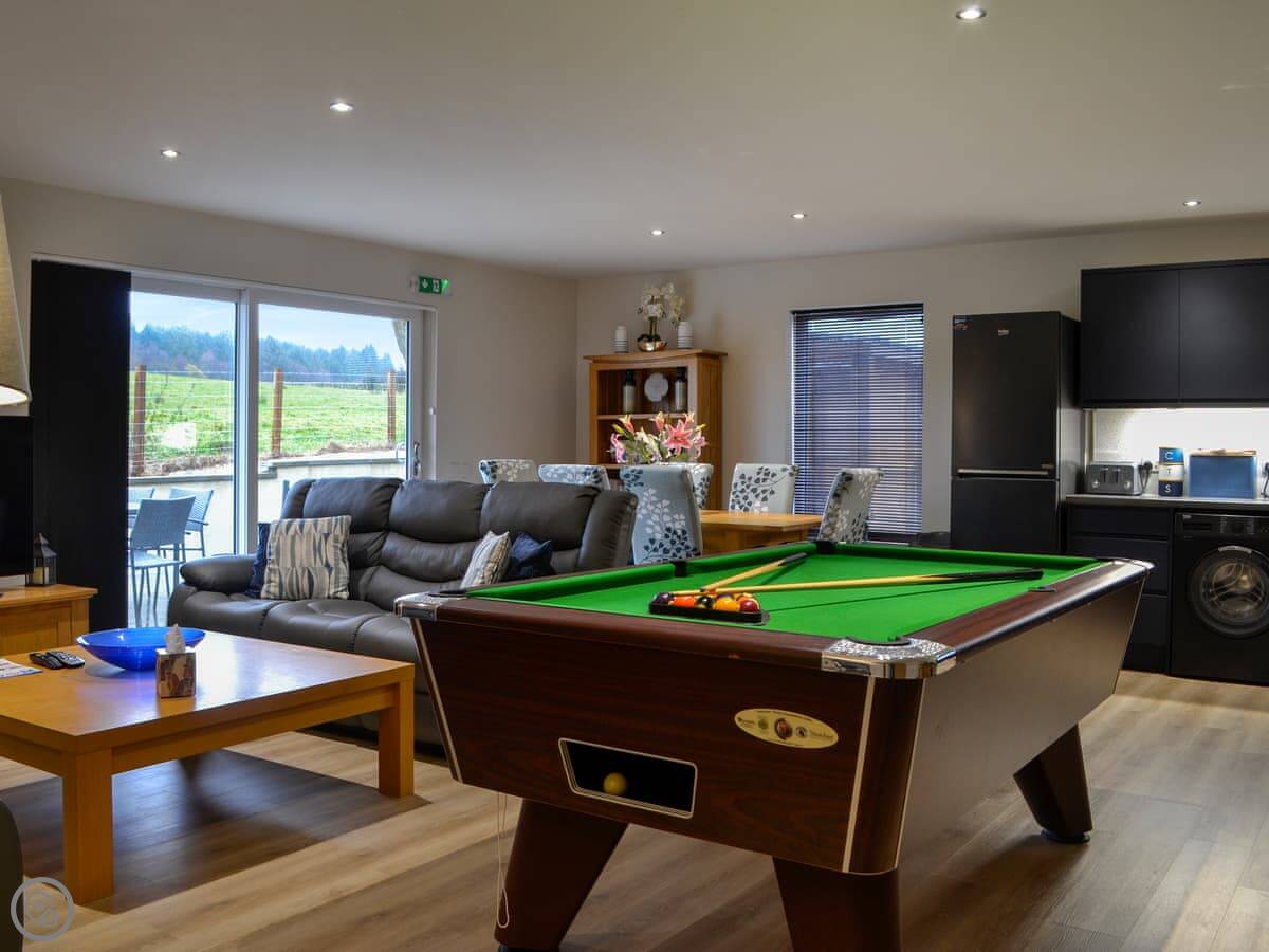 The main room is open plan. Kitchen, dining area, and living space all together. There's a pool table in there. Outside, there's a covered seating area and a hot tub.