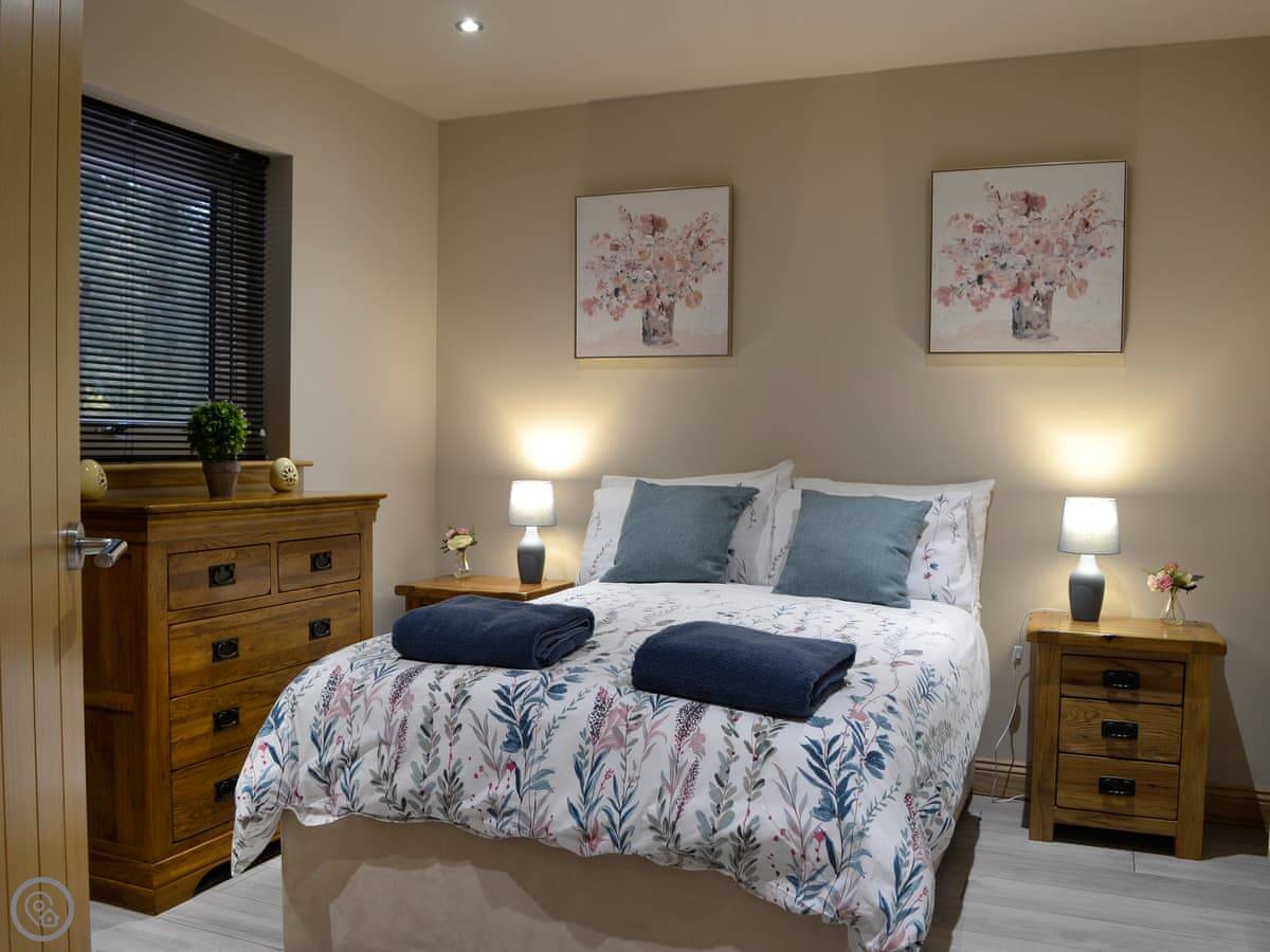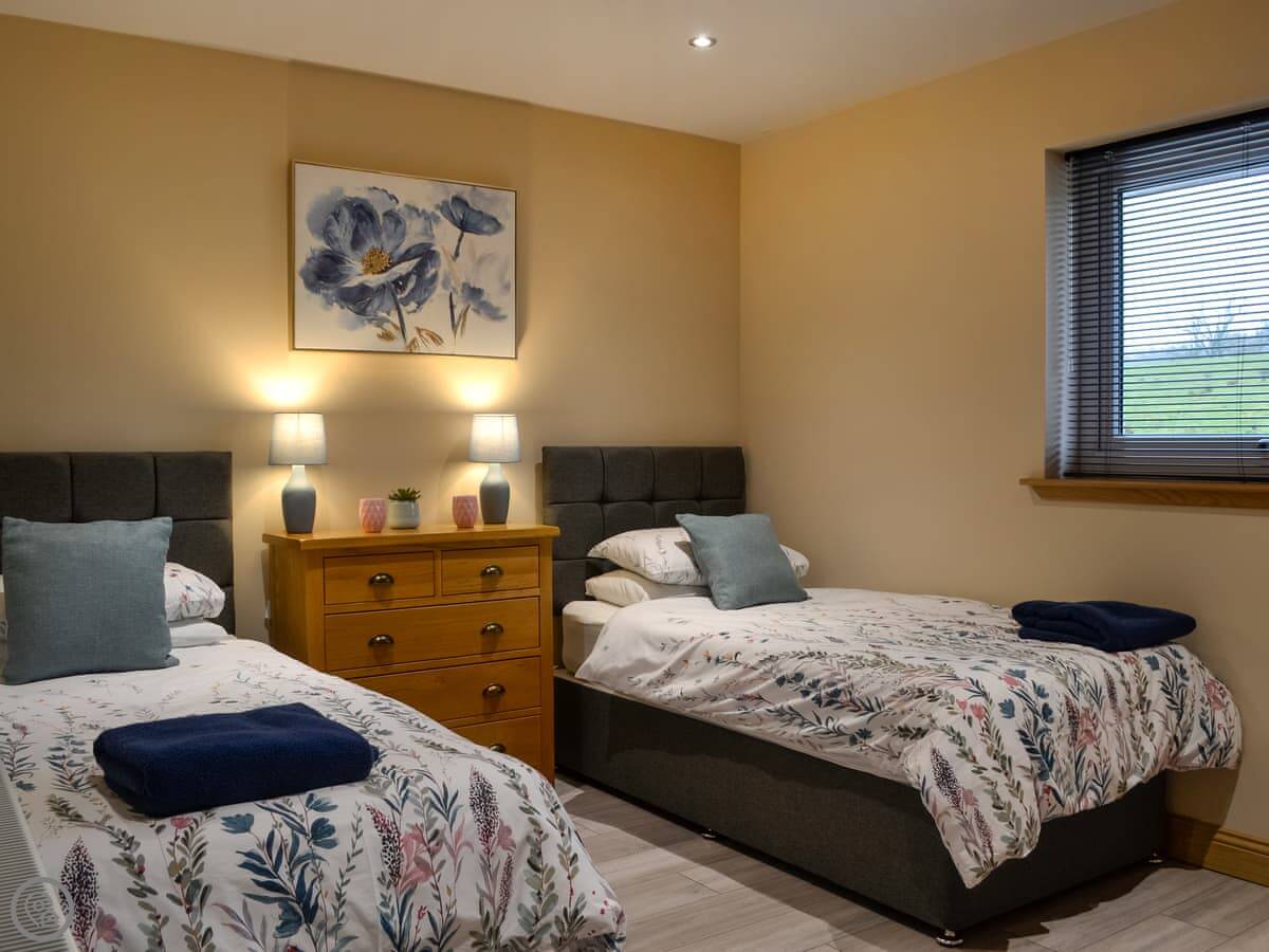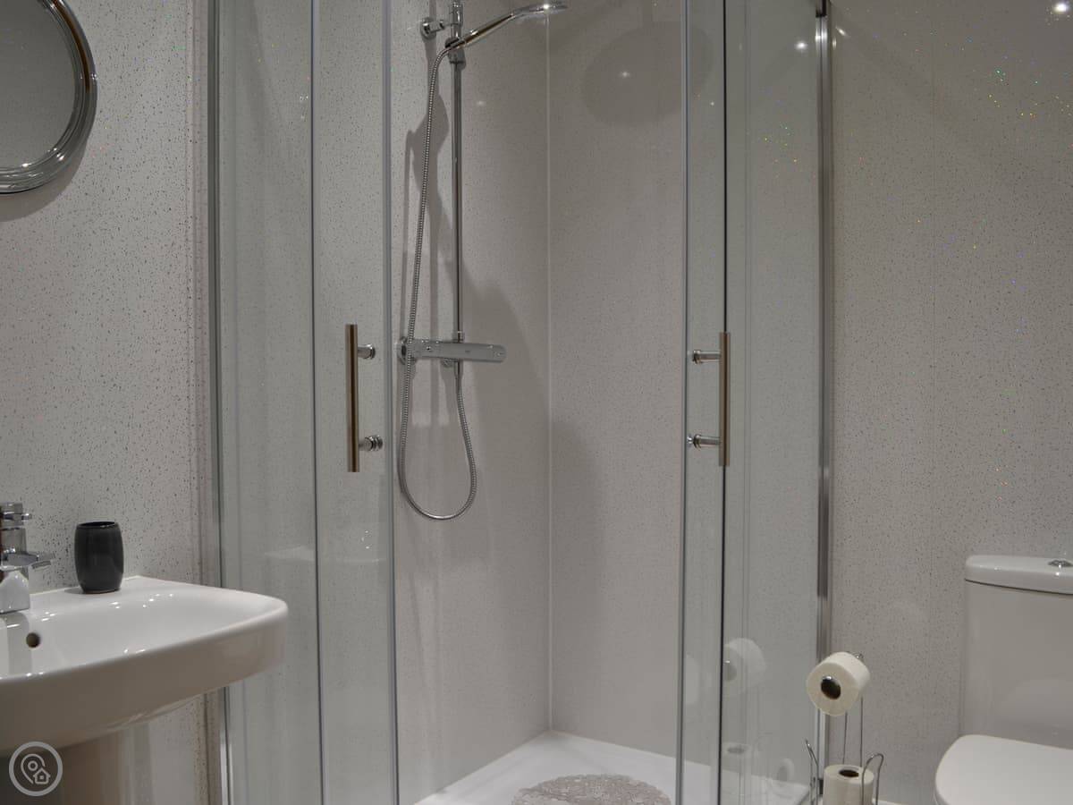It's a detached lodge, all on the ground floor. It's new-build, so it's modern and spacious inside. Sleeps six in three bedrooms. There are two bathrooms, which is handy with that many people. It's got a 4 Star rating.