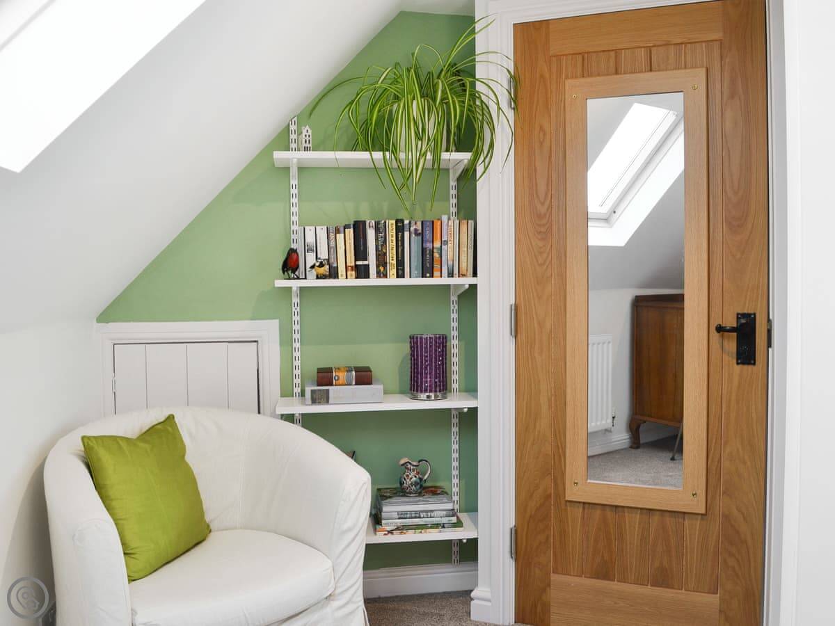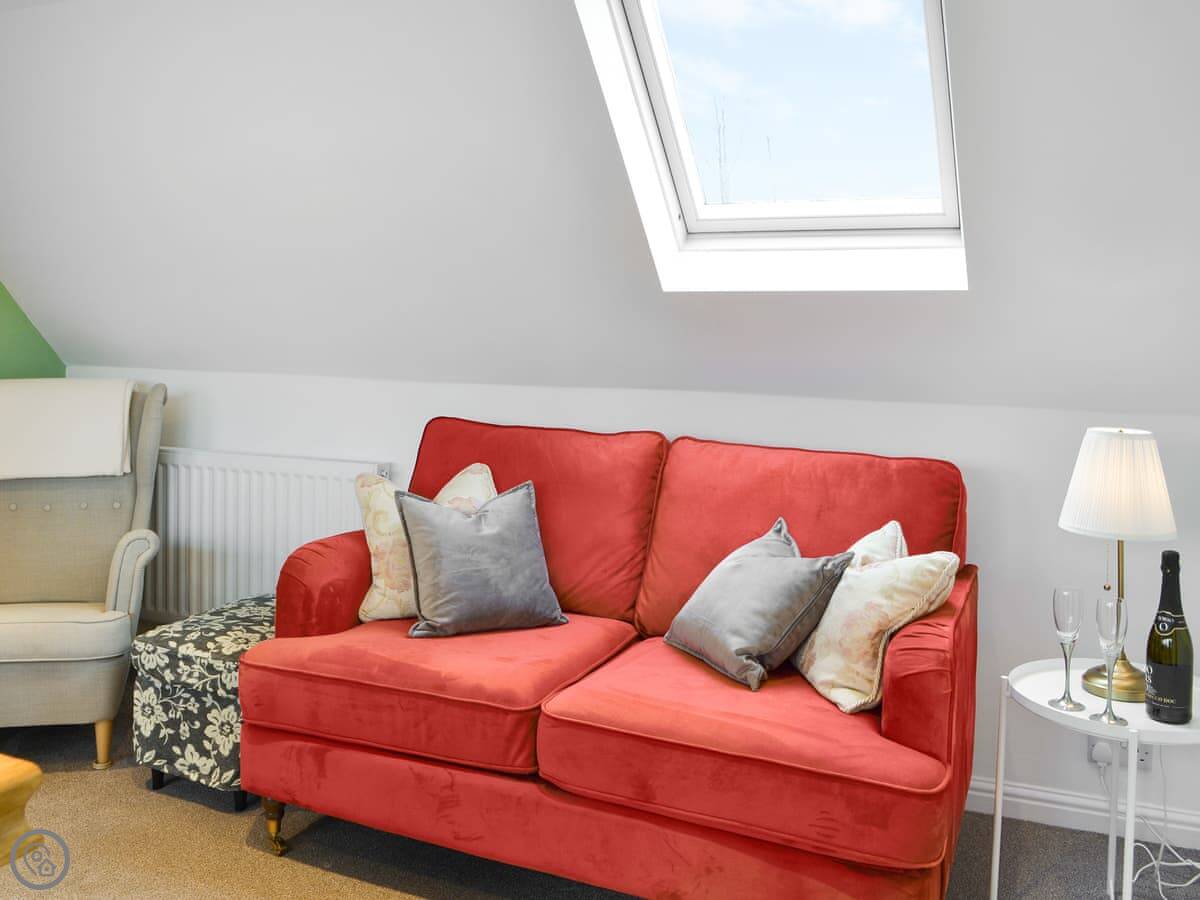 Cartwheel Cottage is on the edge of Burnby village. It's an upside-down layout, so the living room is upstairs and the kitchen is downstairs. It sleeps three, but it's really one bedroom with a kingsize bed and a day bed in the same room. The ceiling slopes in there.