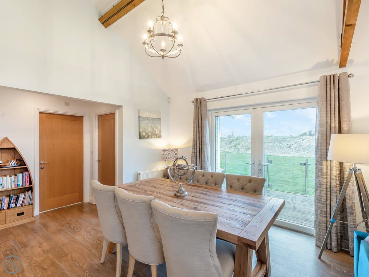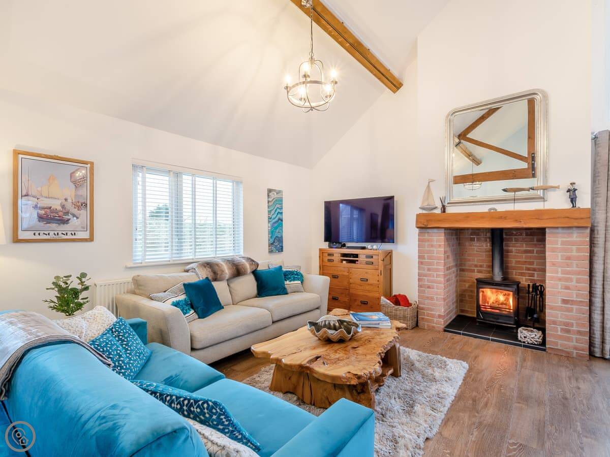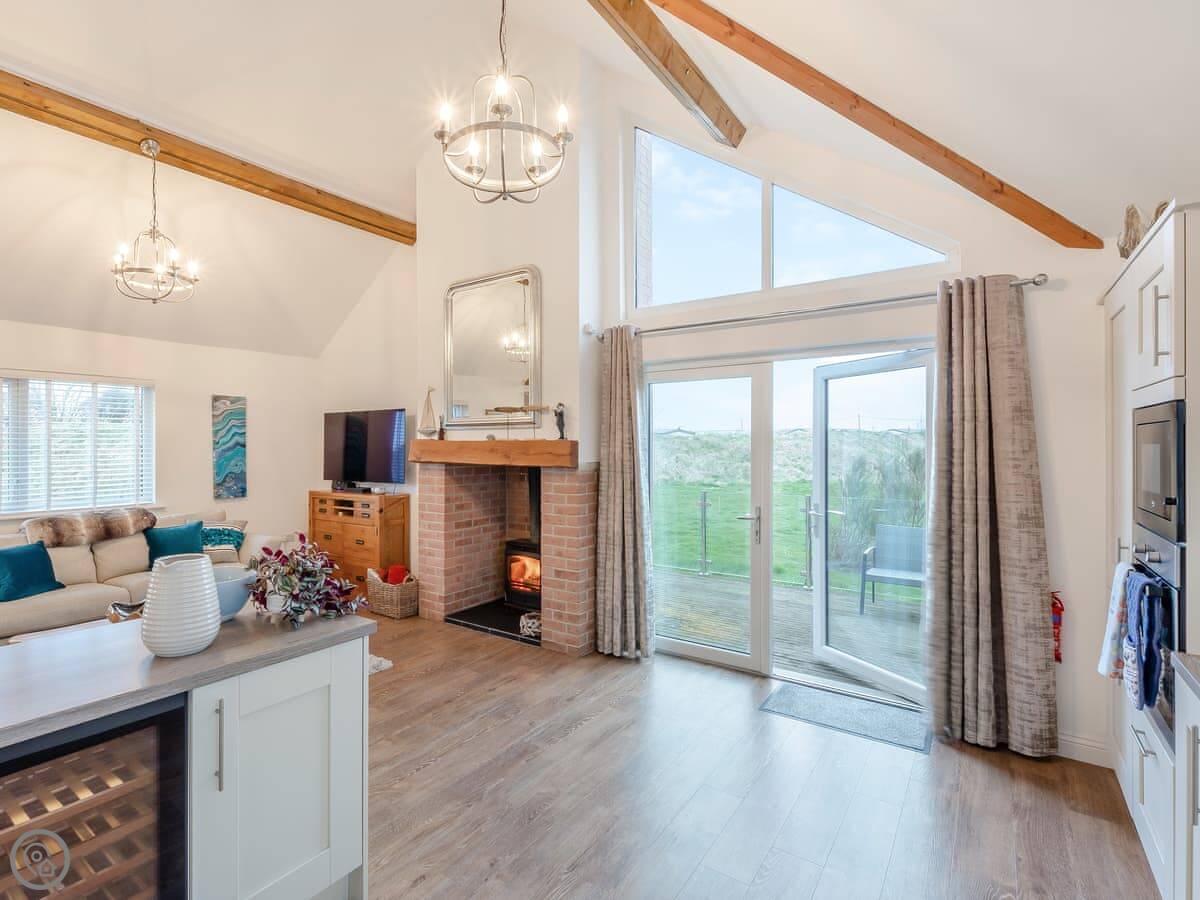 It sleeps four. Two bedrooms, one bathroom. It's got a 5 Star rating, which means it's well-equipped and finished to a high standard. There's a wood-burning stove for cooler evenings. The living space is open plan and the French doors open onto the patio.