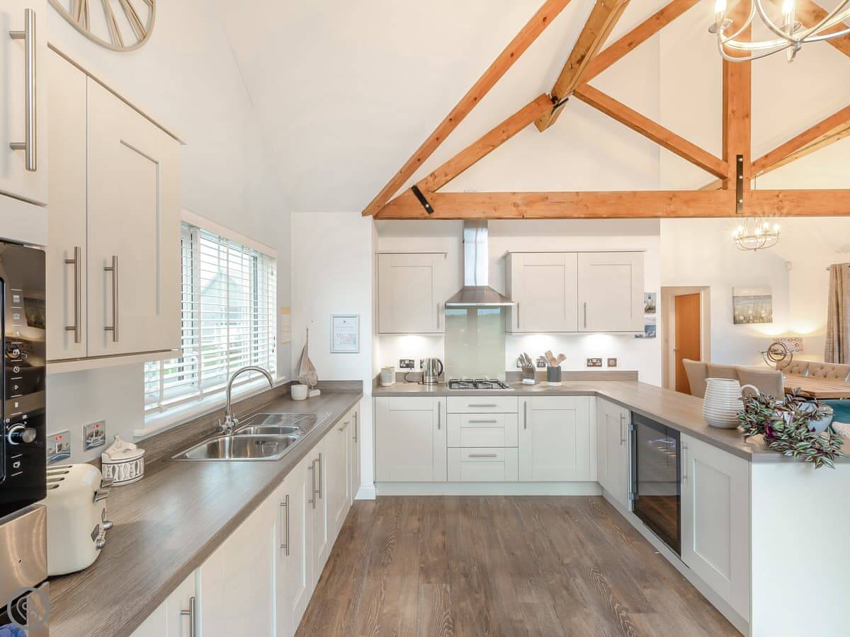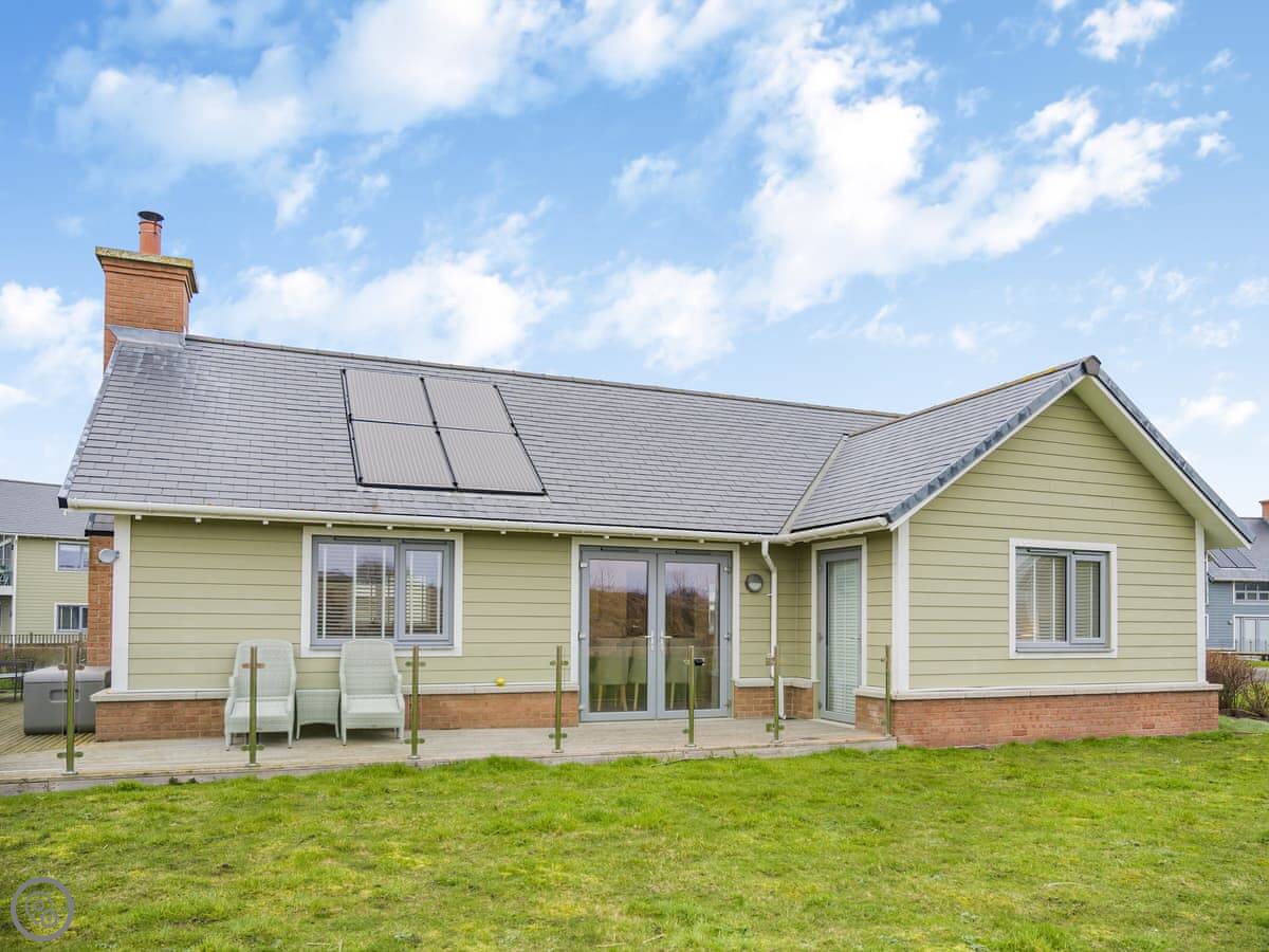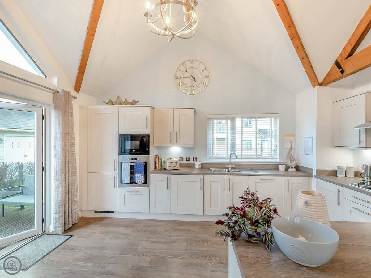 It sleeps four. Two bedrooms, one bathroom. It's got a 5 Star rating, which means it's well-equipped and finished to a high standard. There's a wood-burning stove for cooler evenings. The living space is open plan and the French doors open onto the patio.