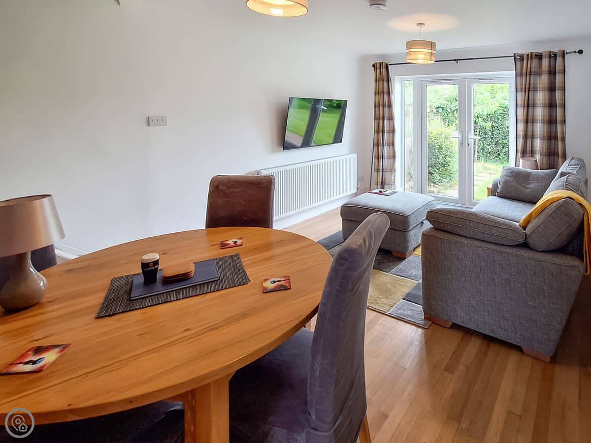 Downstairs is open plan. The French doors from the living area open onto the patio. The kitchen has what you need: oven, hob, fridge, washing machine. There's a TV and WiFi. Parking is on the driveway for one car.