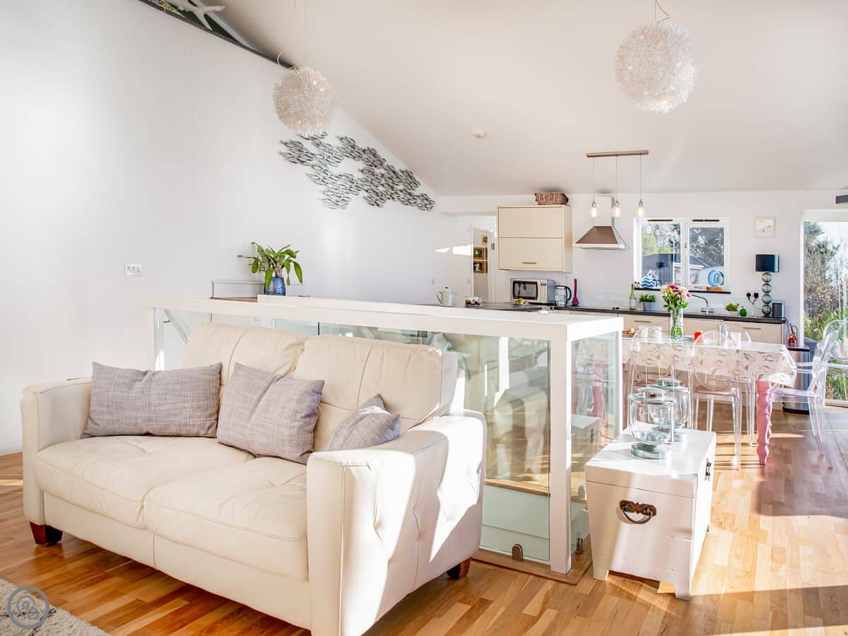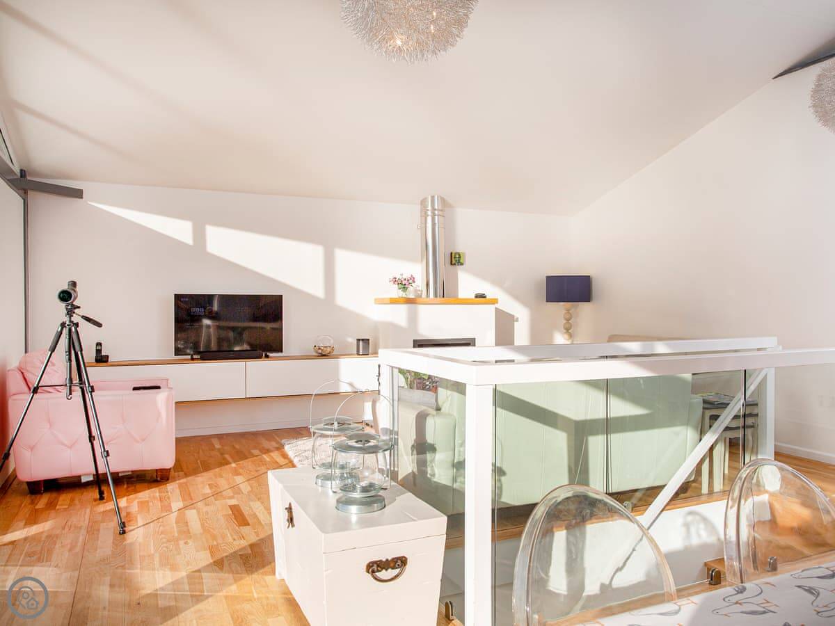 The main living area is upstairs. Big glass doors open onto a large balcony. There's a wood burner and a TV for the evenings. The kitchen is there as well. There's a toilet on that level.