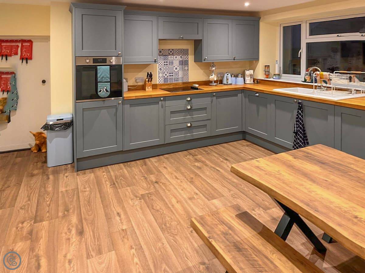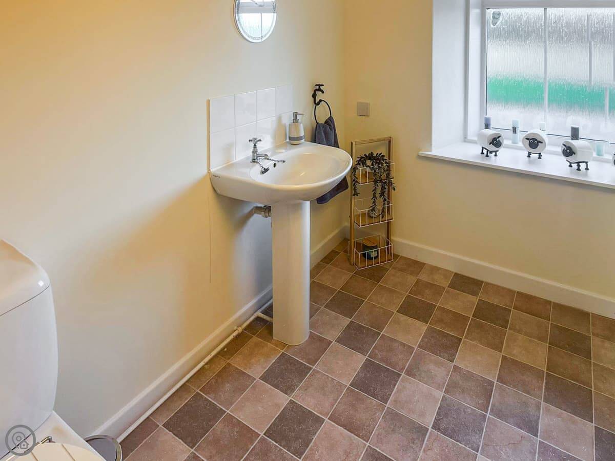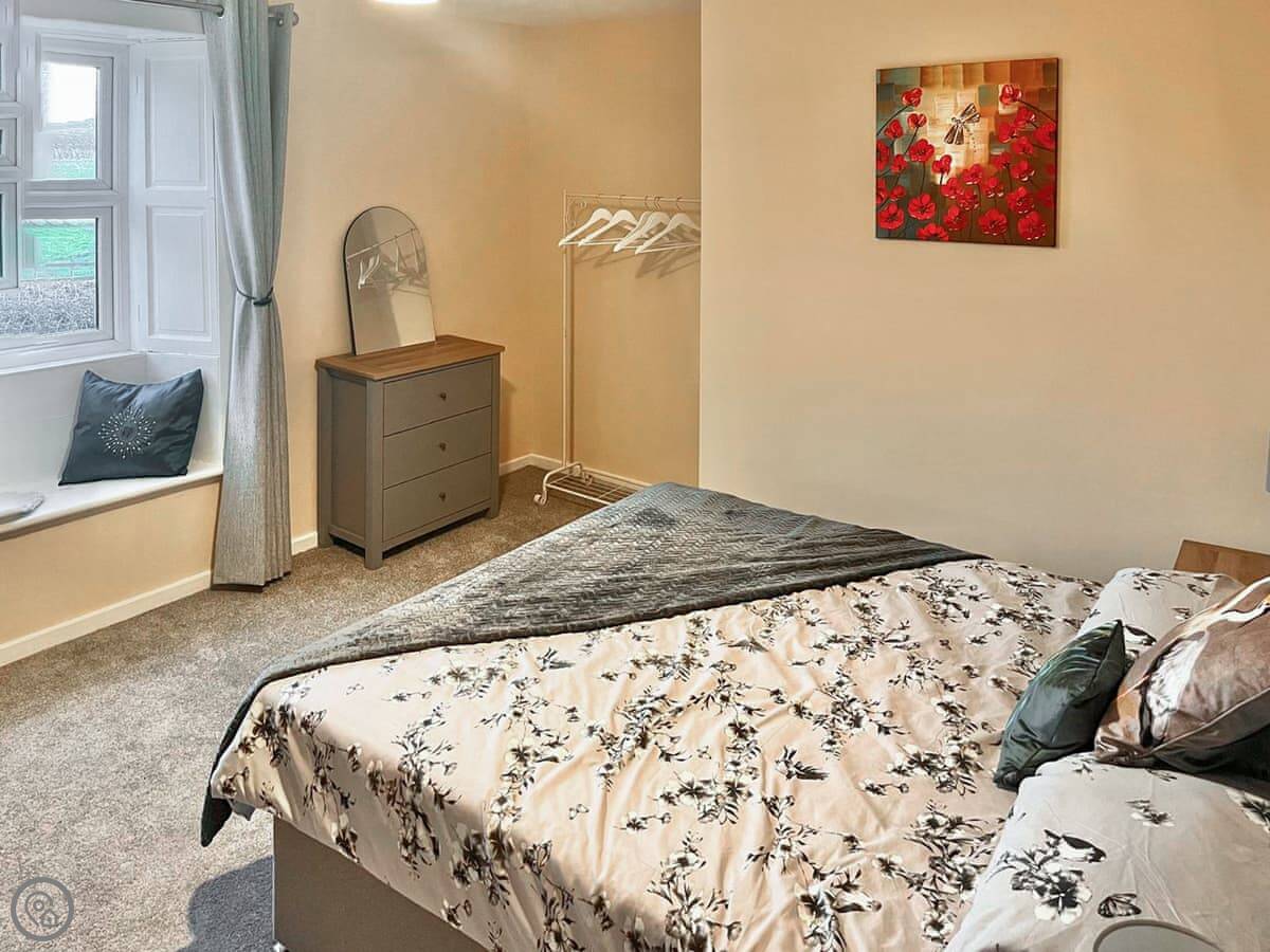 It sleeps six. There are three bedrooms upstairs and one family bathroom. It's got a 4 Star rating, which means it's comfortable and well equipped. The ceilings are high downstairs, but doorways are cottage-height, so watch your head. The stairs are farmhouse stairs, a bit steep.