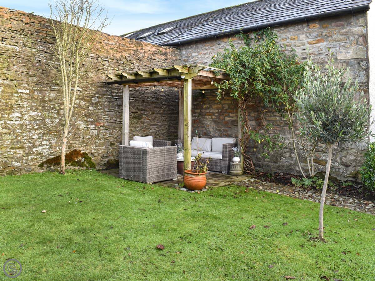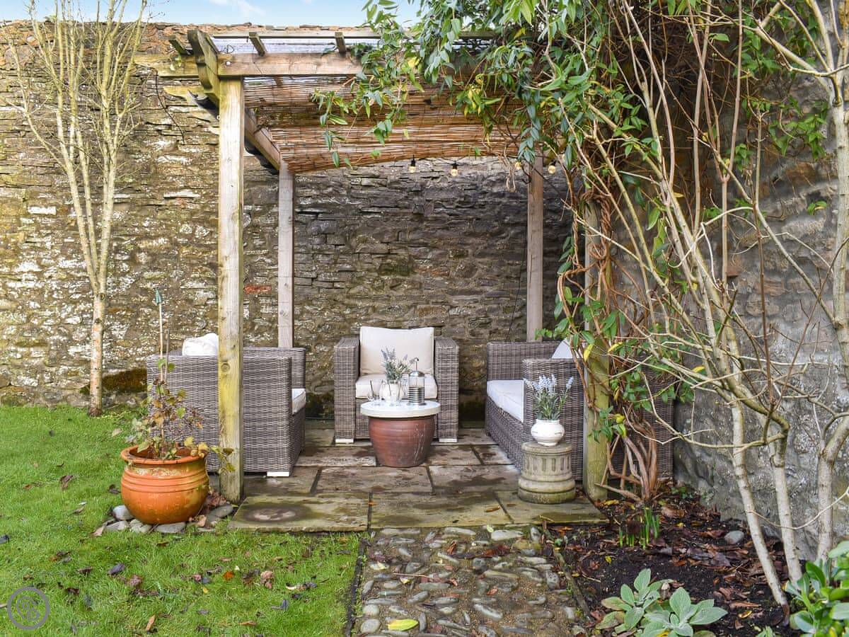 Downstairs, there's a kitchen with a table and a sitting room with a multi-fuel stove. The French doors open onto a patio with furniture, then there's a lawn. There's a little seating area under a pergola at the bottom of the garden, which is a nice spot.