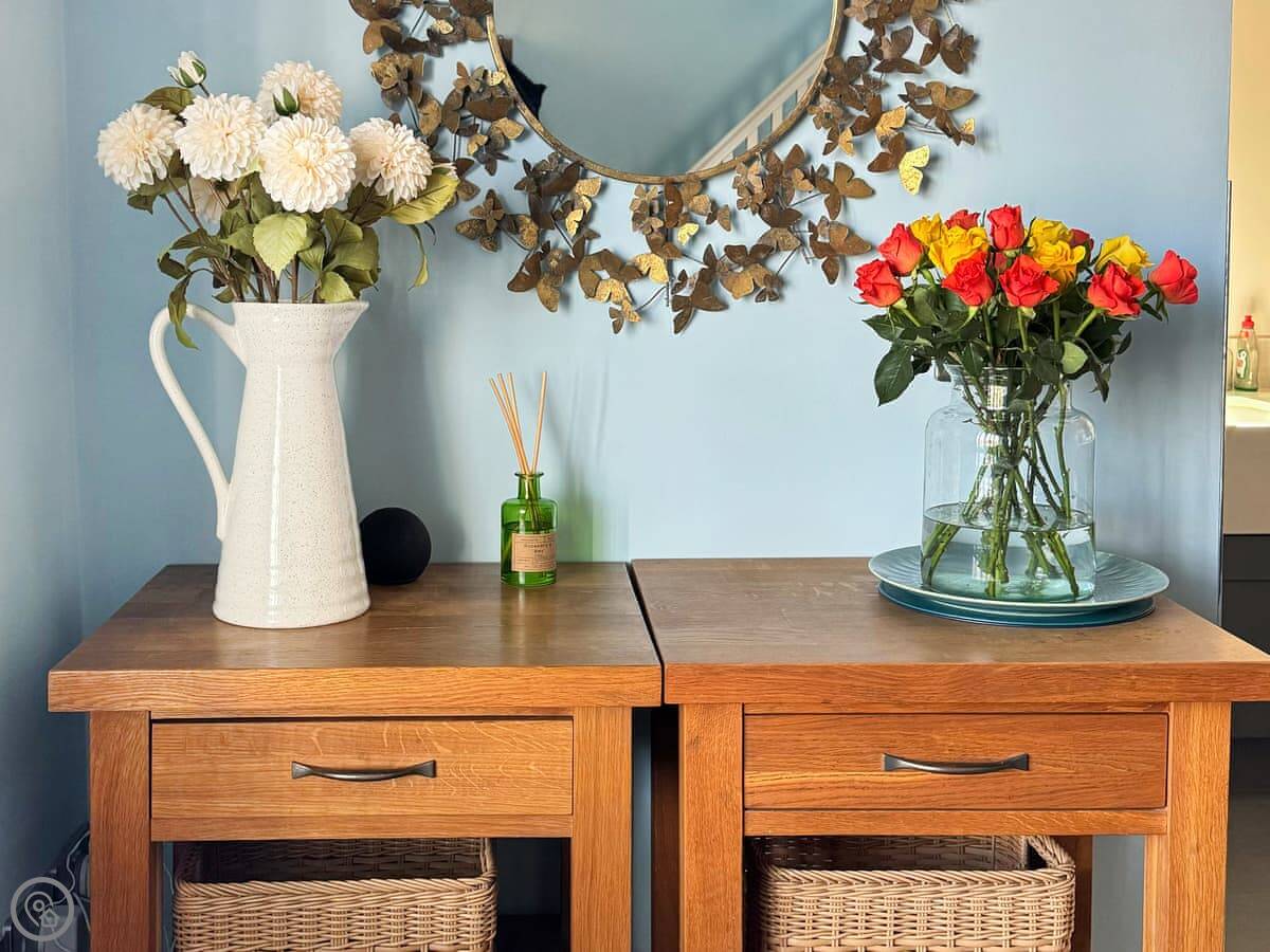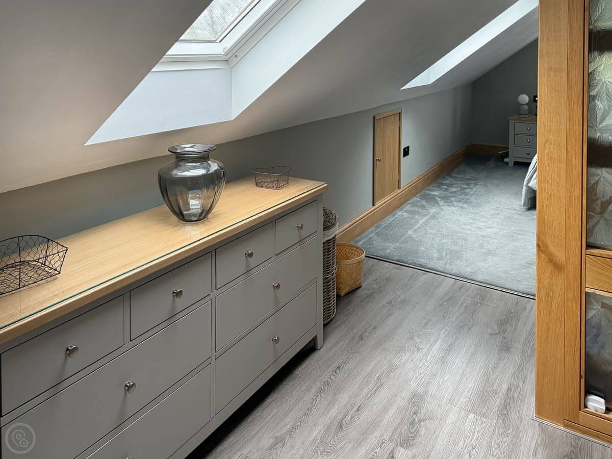 It's a single-storey layout so the internal stairs are just to the one upstairs bedroom. There's parking on the drive. You can bring one dog. Things like bedding, towels, the cot and highchair are all included.