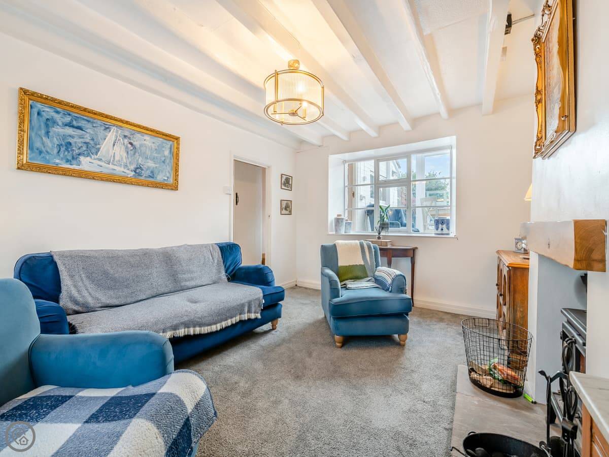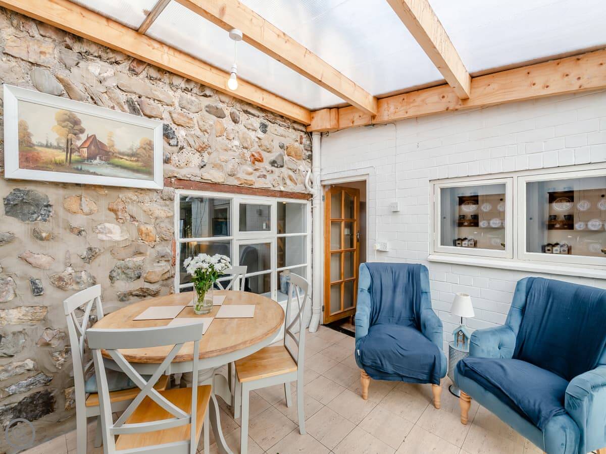 Downstairs, there's a living room with a wood burner. The beams are exposed. The kitchen has wooden worktops and a Belfast sink. There's a sunroom off the back with doors out to the garden.