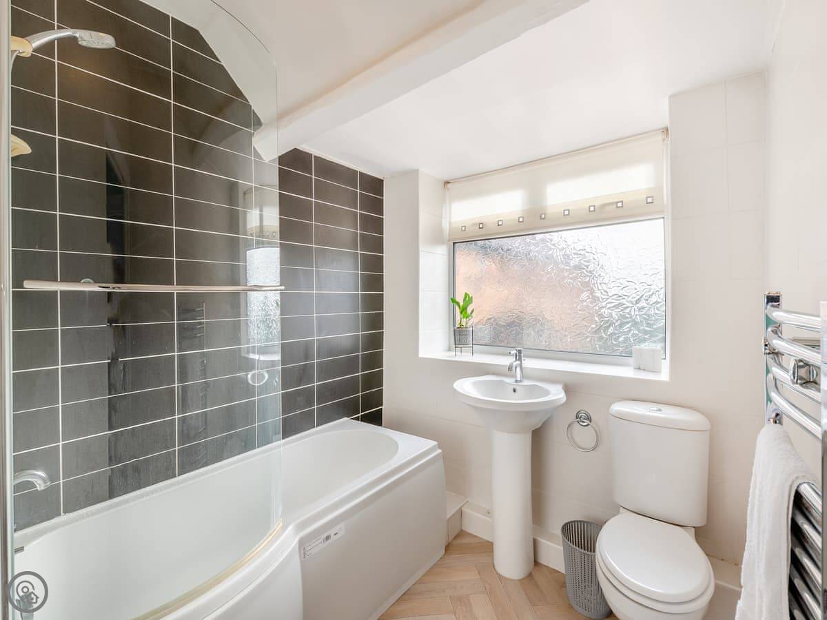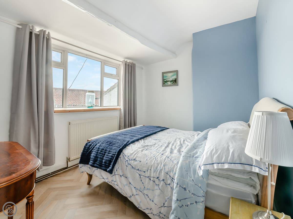 The bedroom is upstairs. You can see the sea from the window, between the rooftops. The bathroom has a bath with a shower over it.