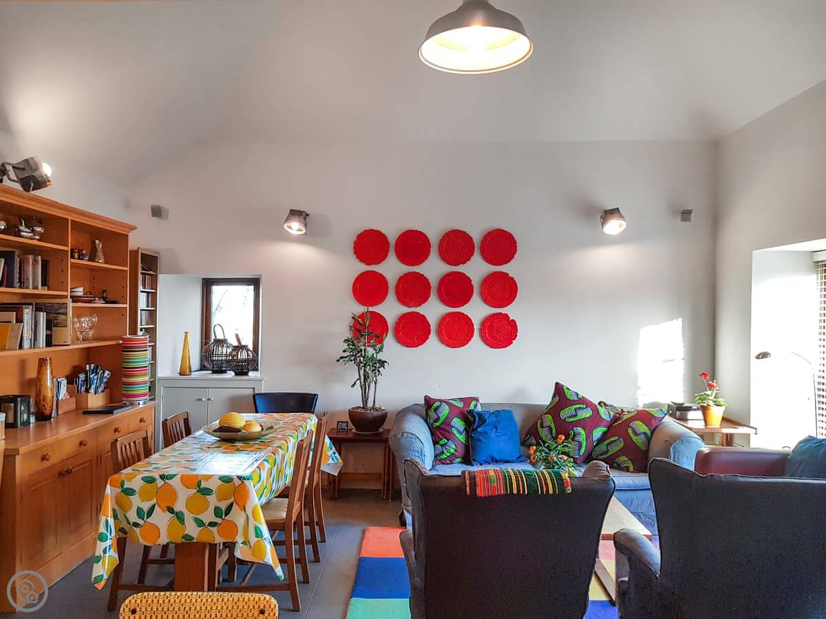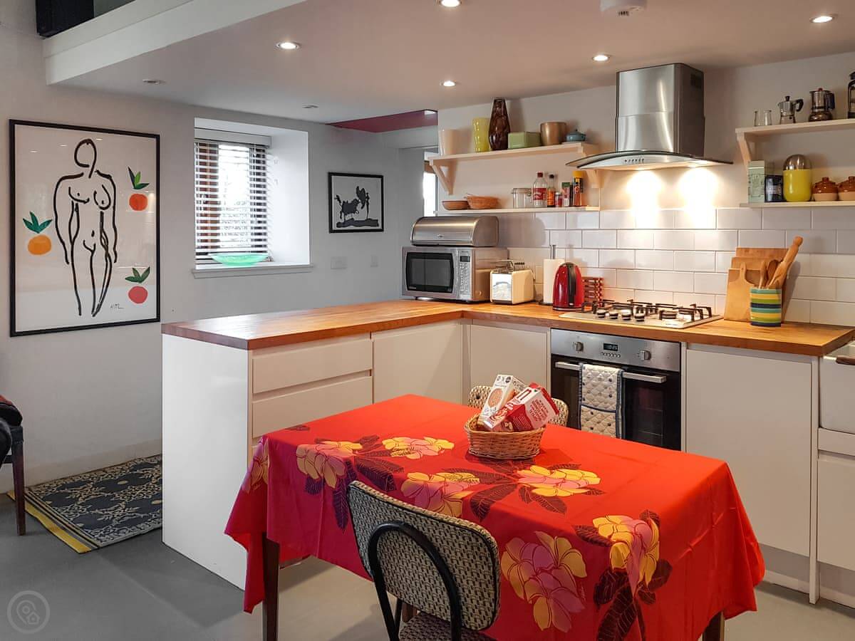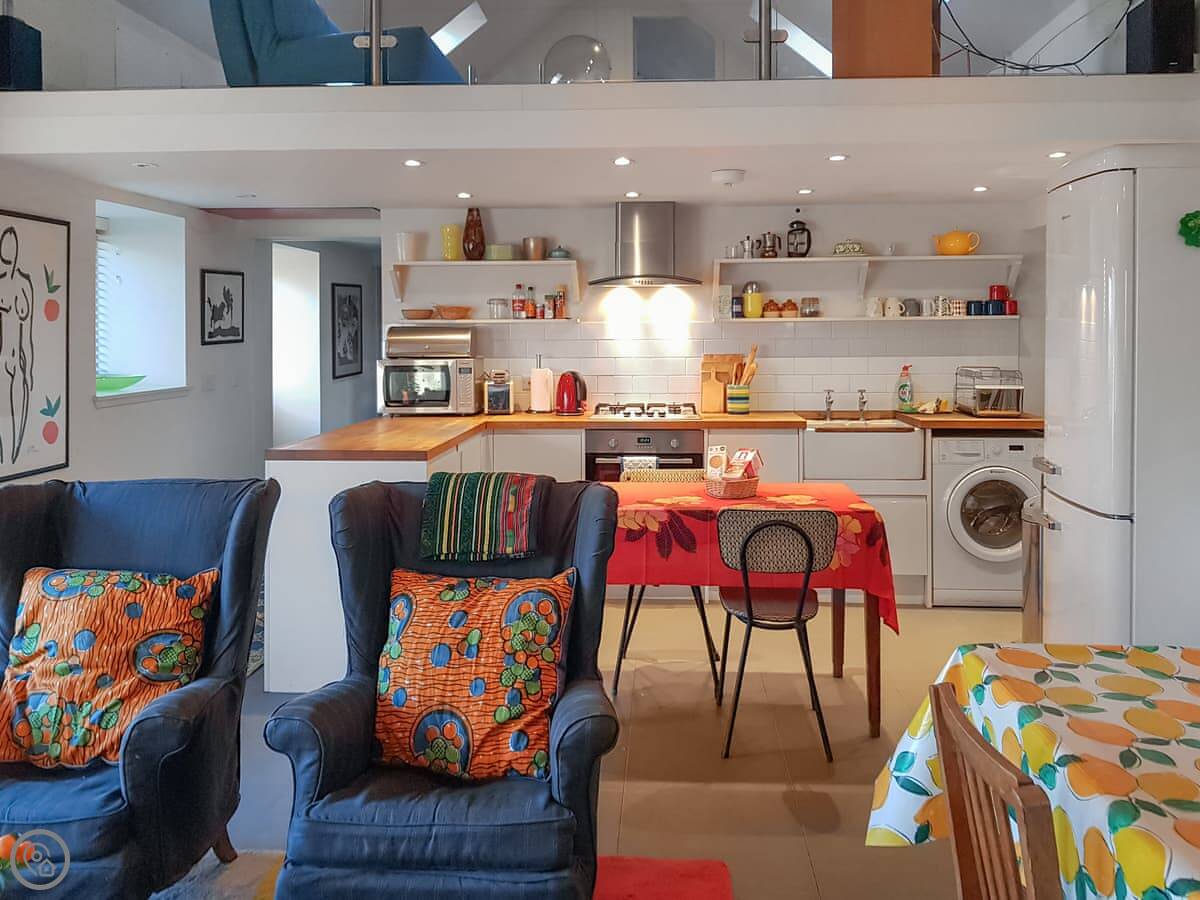 It's open plan downstairs. There's a double sofa bed in the living area if you need it. You've got your own garden. It's on a working farm, so you'll see and hear farm activity sometimes. Tractors going past, that sort of thing.