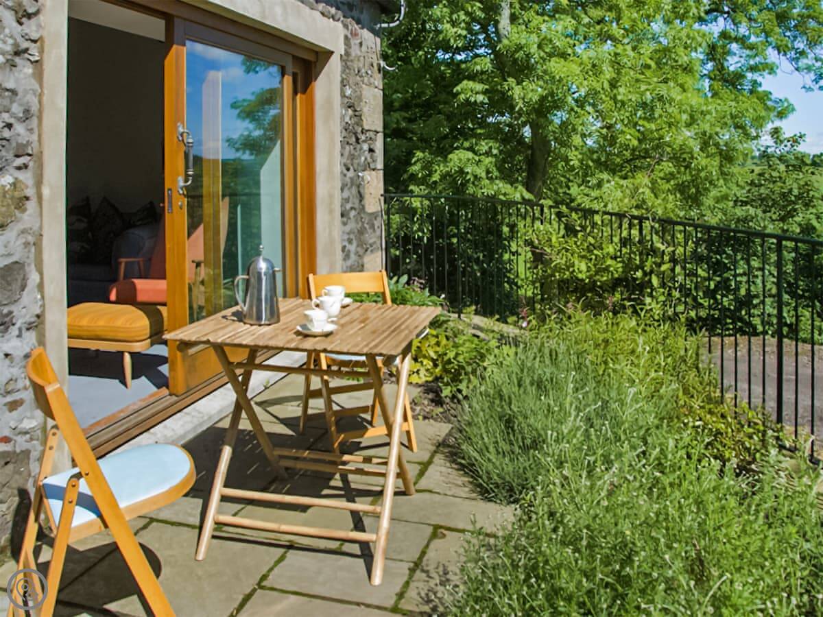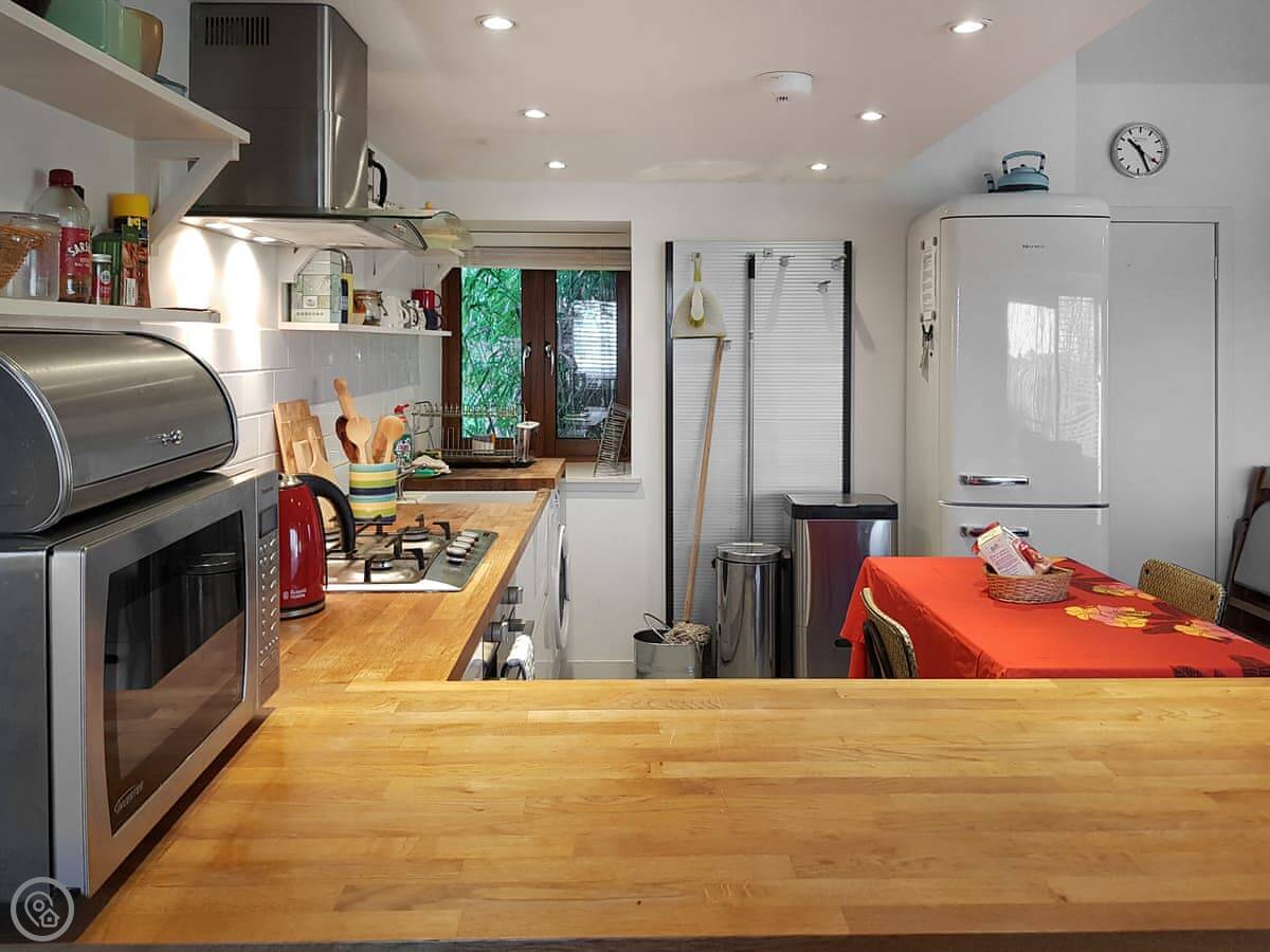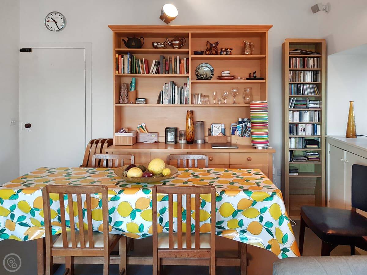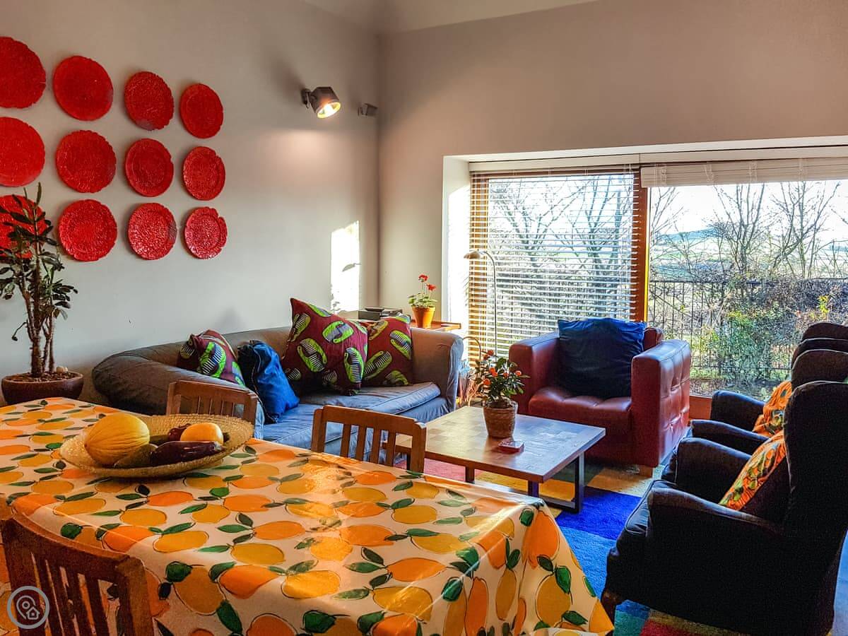 It's open plan downstairs. There's a double sofa bed in the living area if you need it. You've got your own garden. It's on a working farm, so you'll see and hear farm activity sometimes. Tractors going past, that sort of thing.