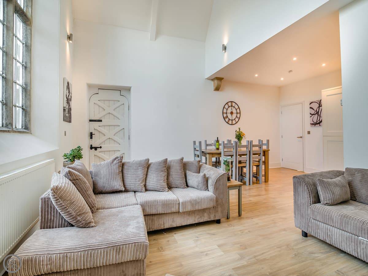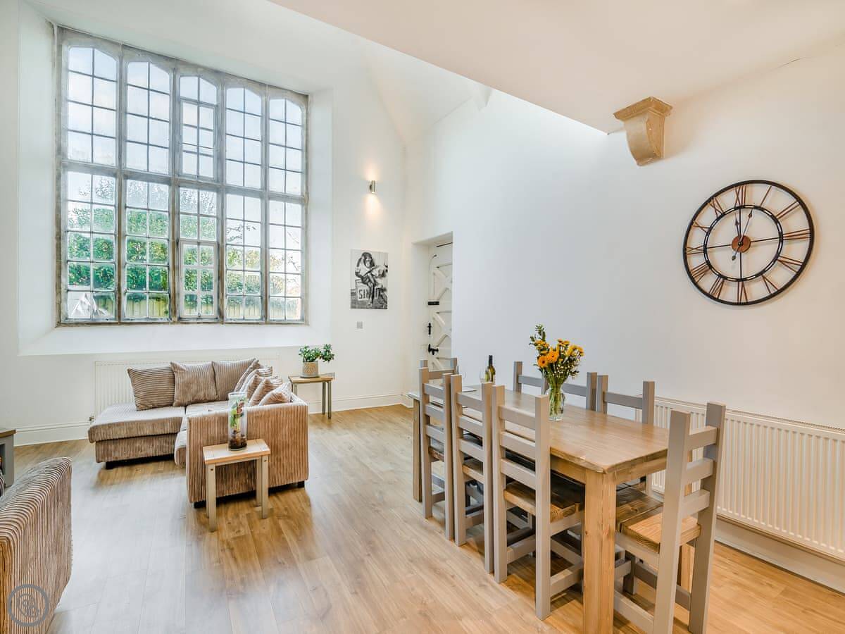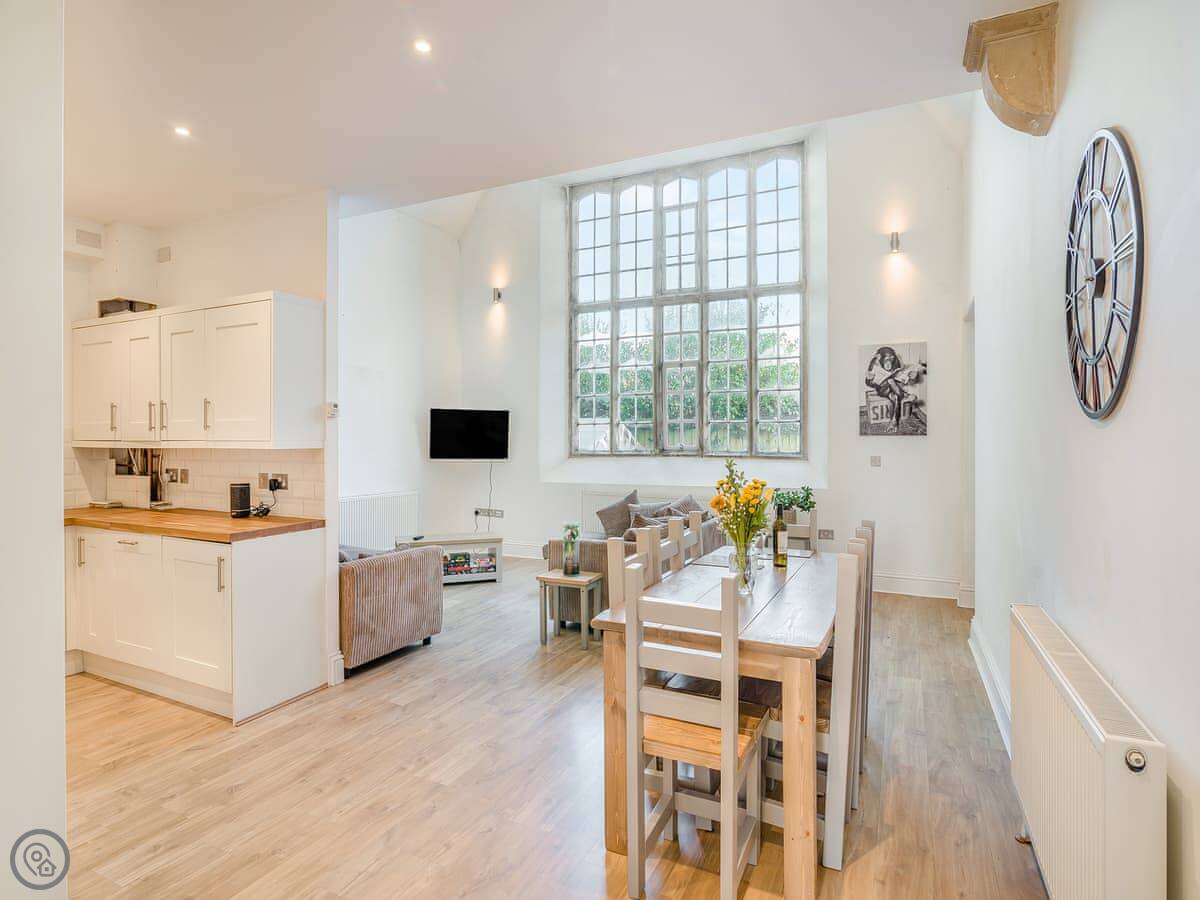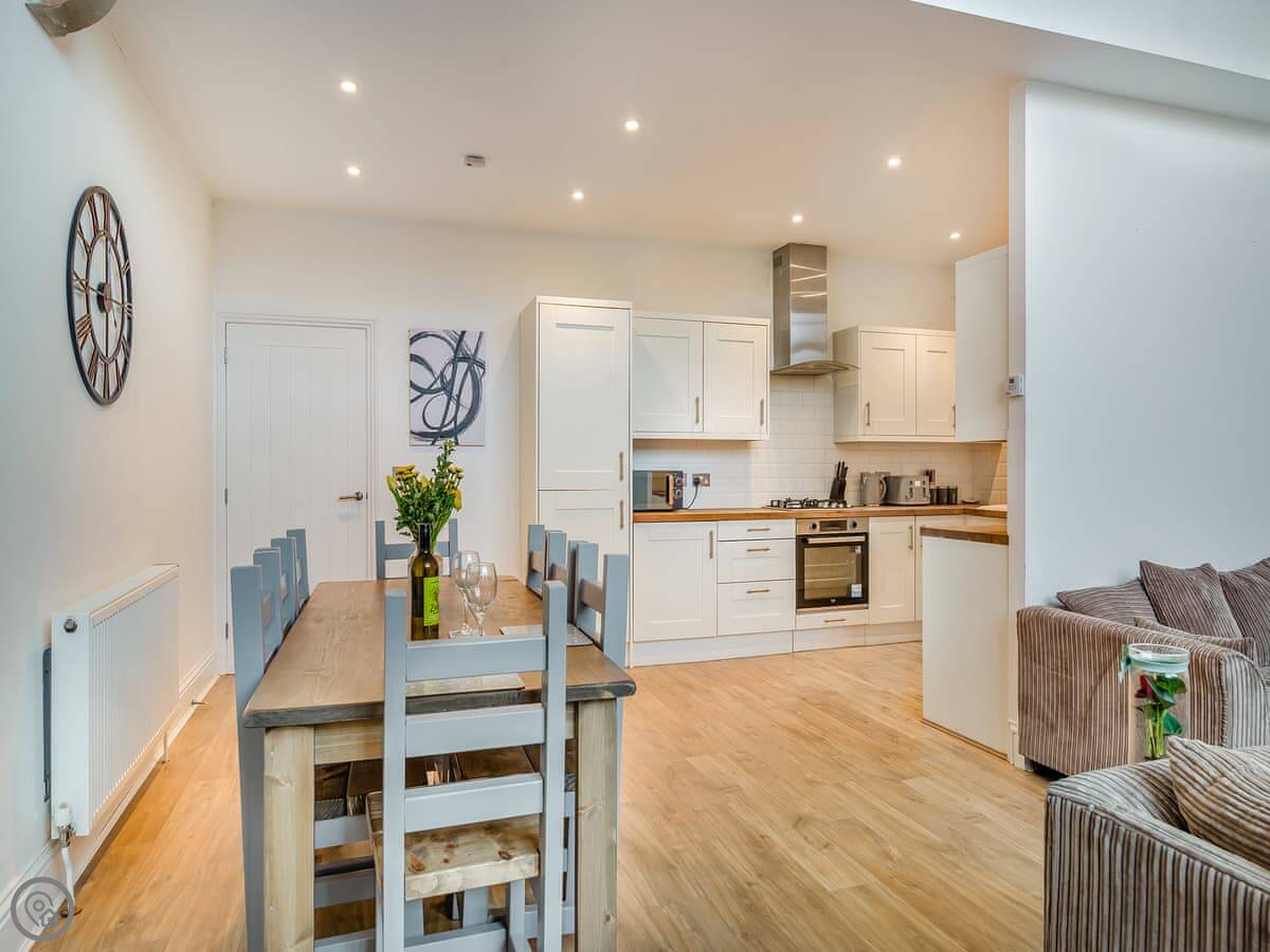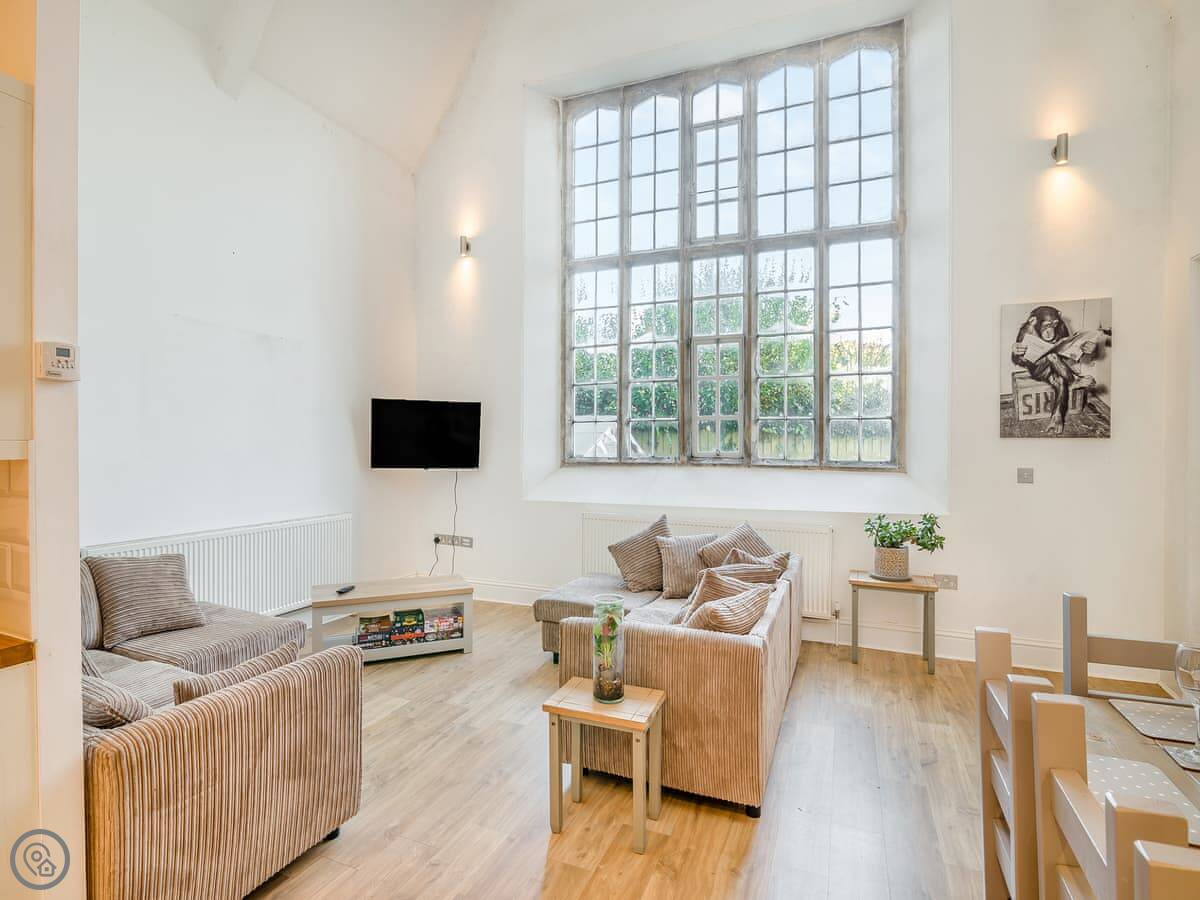 The main living space is open plan, kitchen and sitting area together, which is good for a group. The garden is enclosed at the back, with a patio and space for a BBQ. It's private.