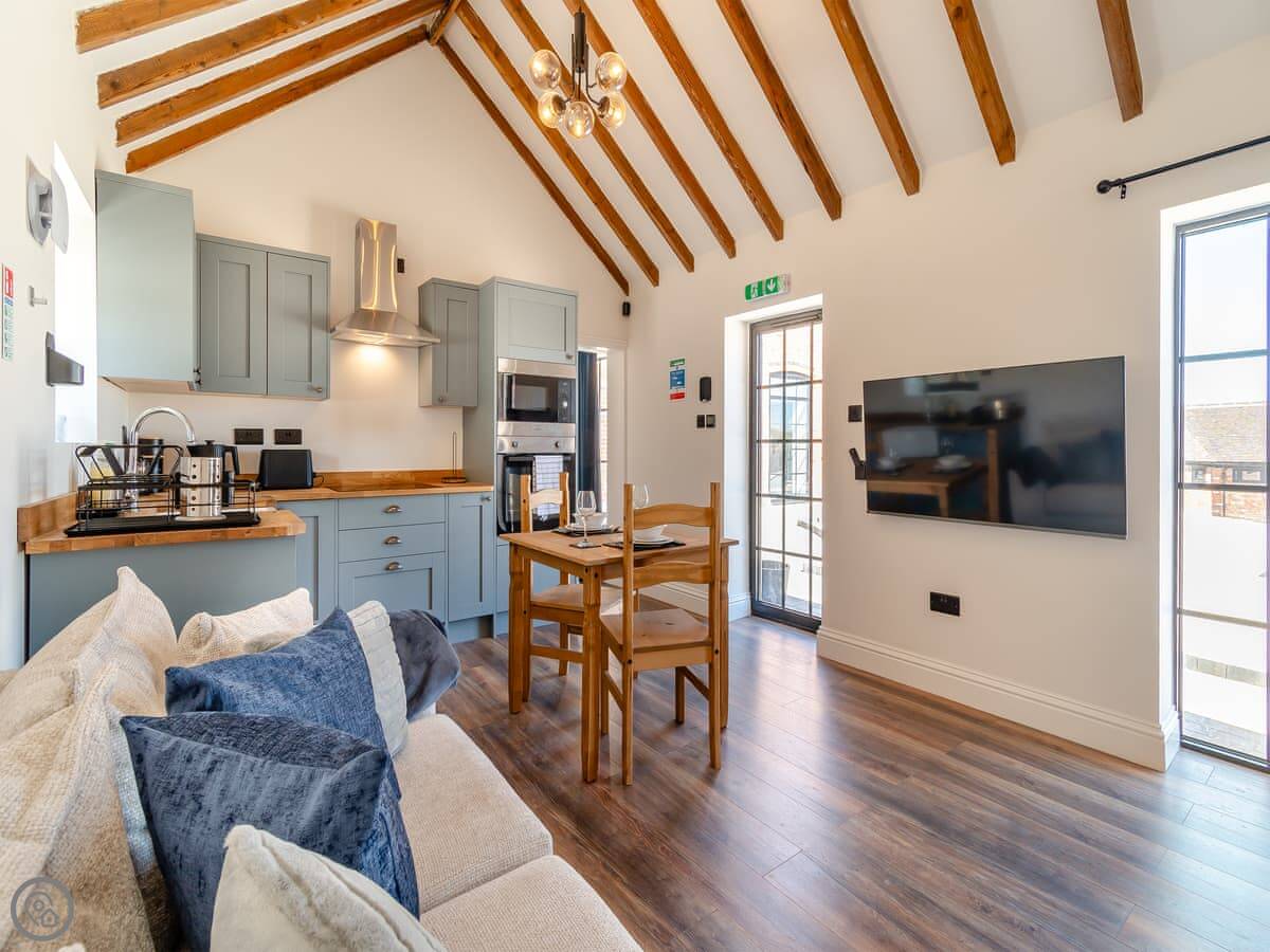 Fountain Front Barn is a new barn conversion for two people on a farm in Corley, Warwickshire. It’s one of three identical barns built side by side. There’s parking right outside your front door.