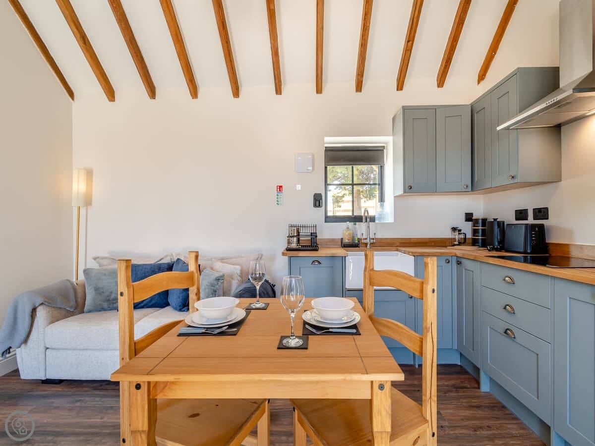 It’s all on one level. There’s an open plan room with the kitchen, dining and living area. The bedroom and shower room are separate. It’s got underfloor heating, which works well. You get your own patio with a table and chairs, and a private hot tub.