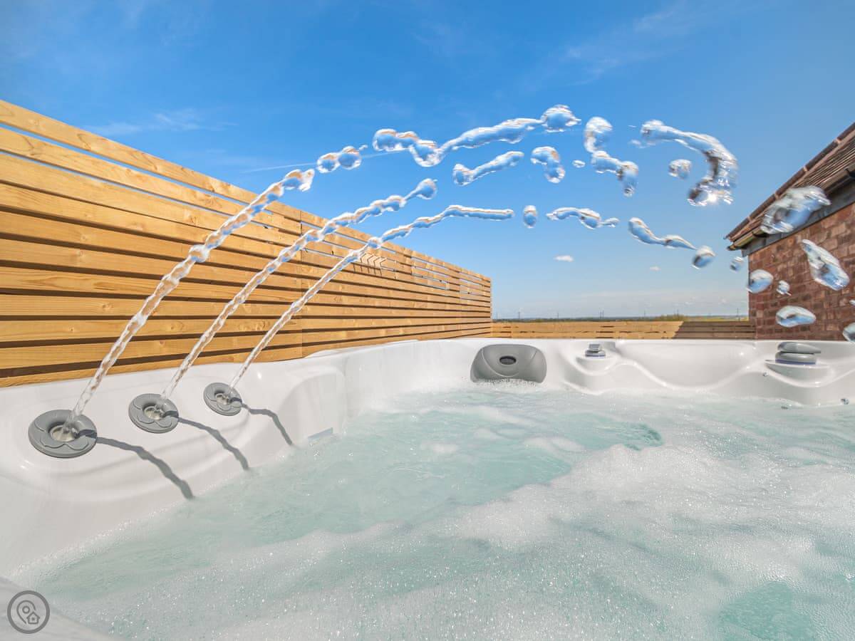The main room is open plan. Kitchen at one end, sitting area at the other. There's underfloor heating, which is nice on a cold morning. Outside, there's a private patio with a hot tub and a barbecue. The garden is enclosed.