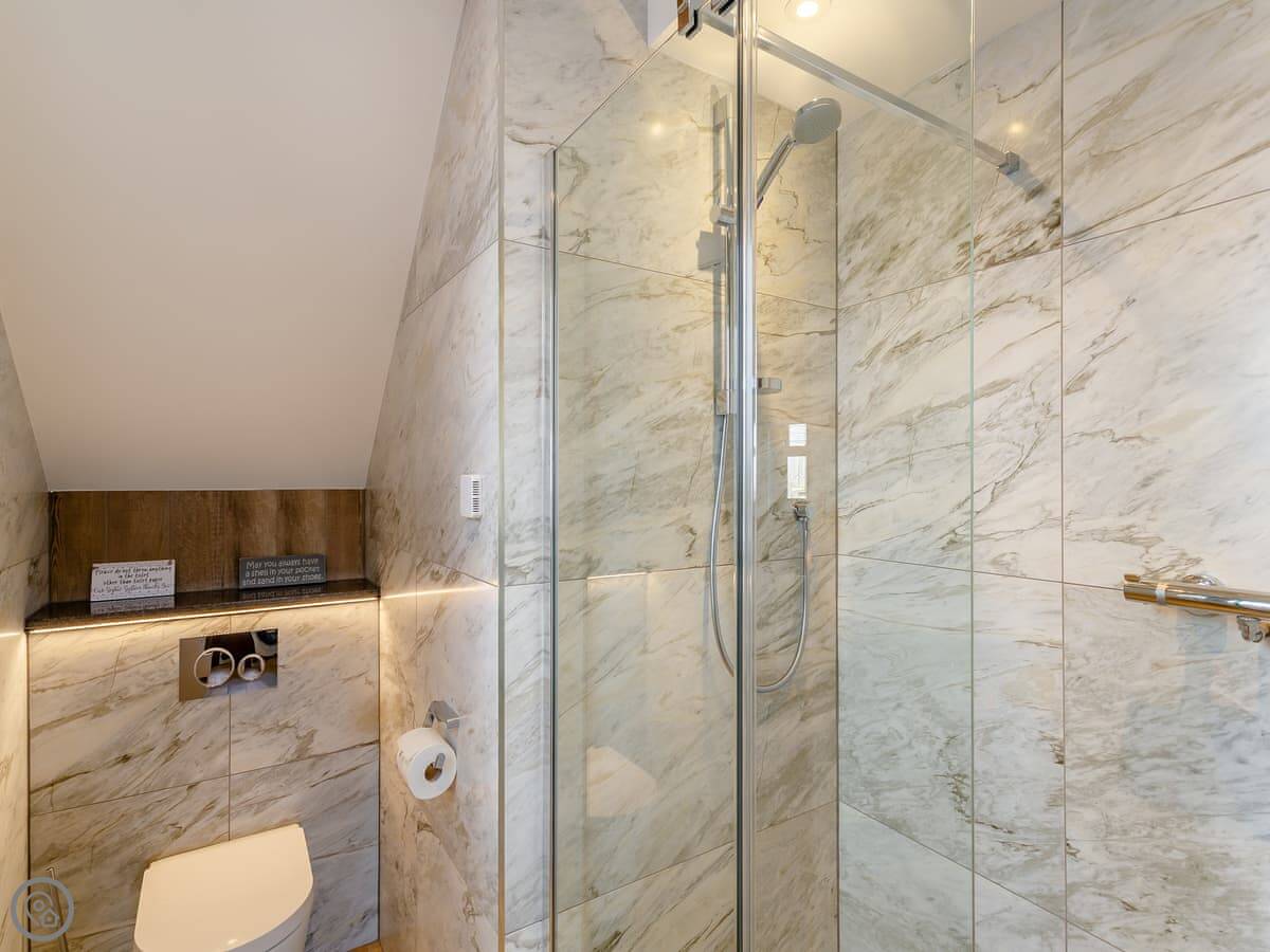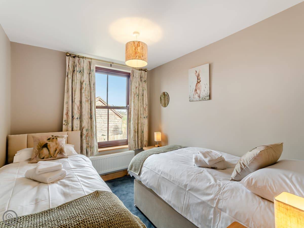 It sleeps six. There are three bedrooms upstairs, two with a double bed and one with two singles. Two bathrooms, one downstairs with a walk-in shower and one upstairs with a bath. It's a 4 Star place, which means it's comfortable and well-kept. The beds are good.