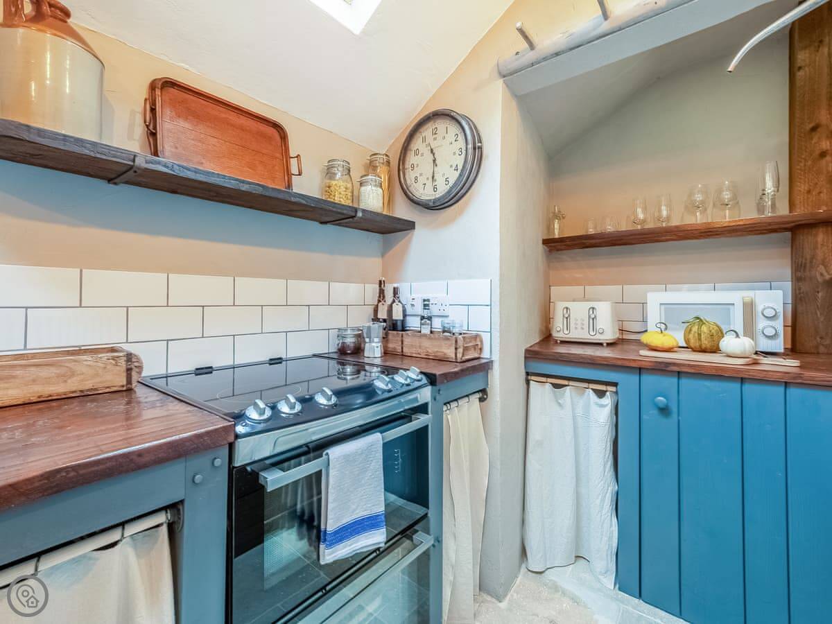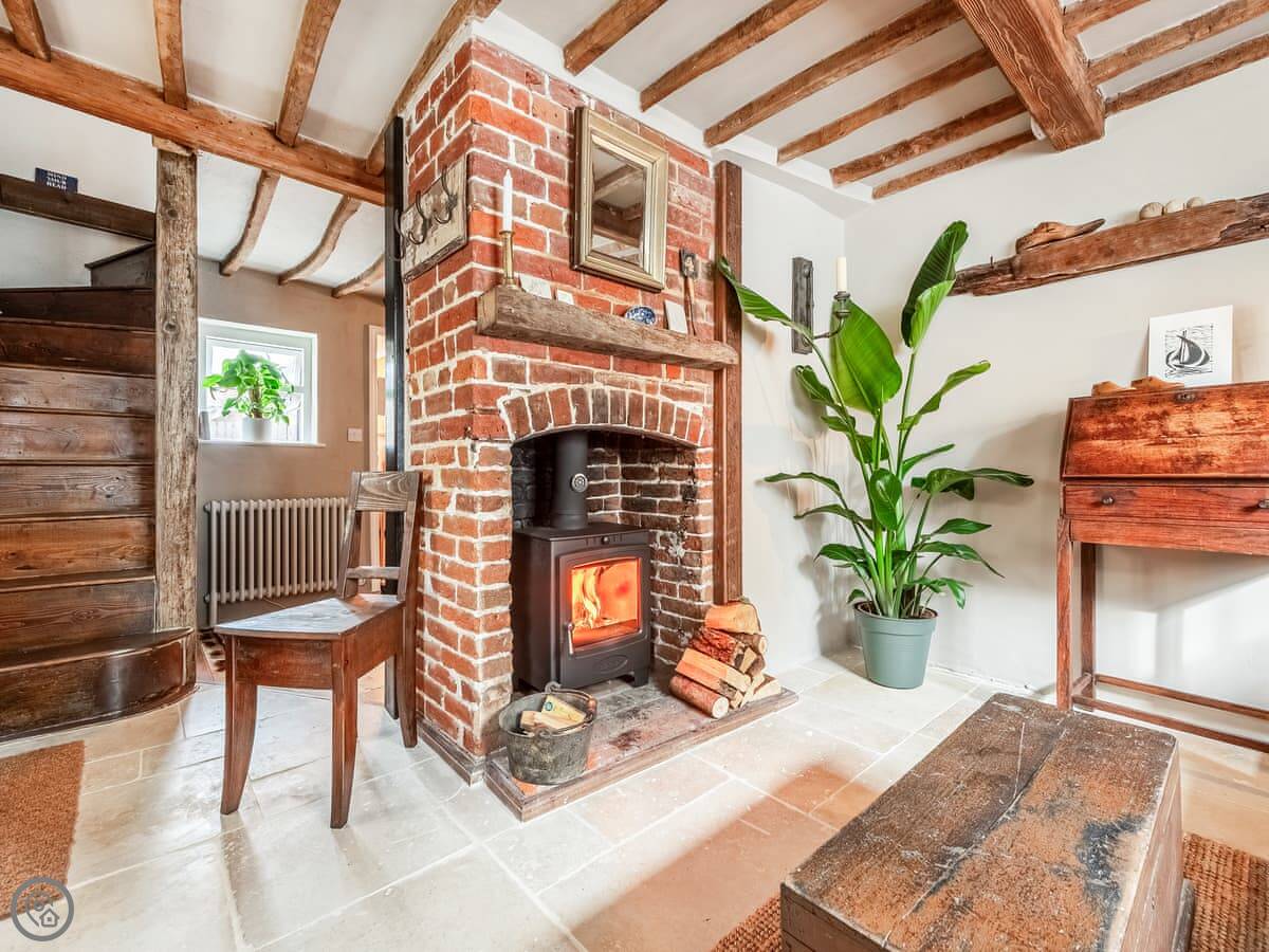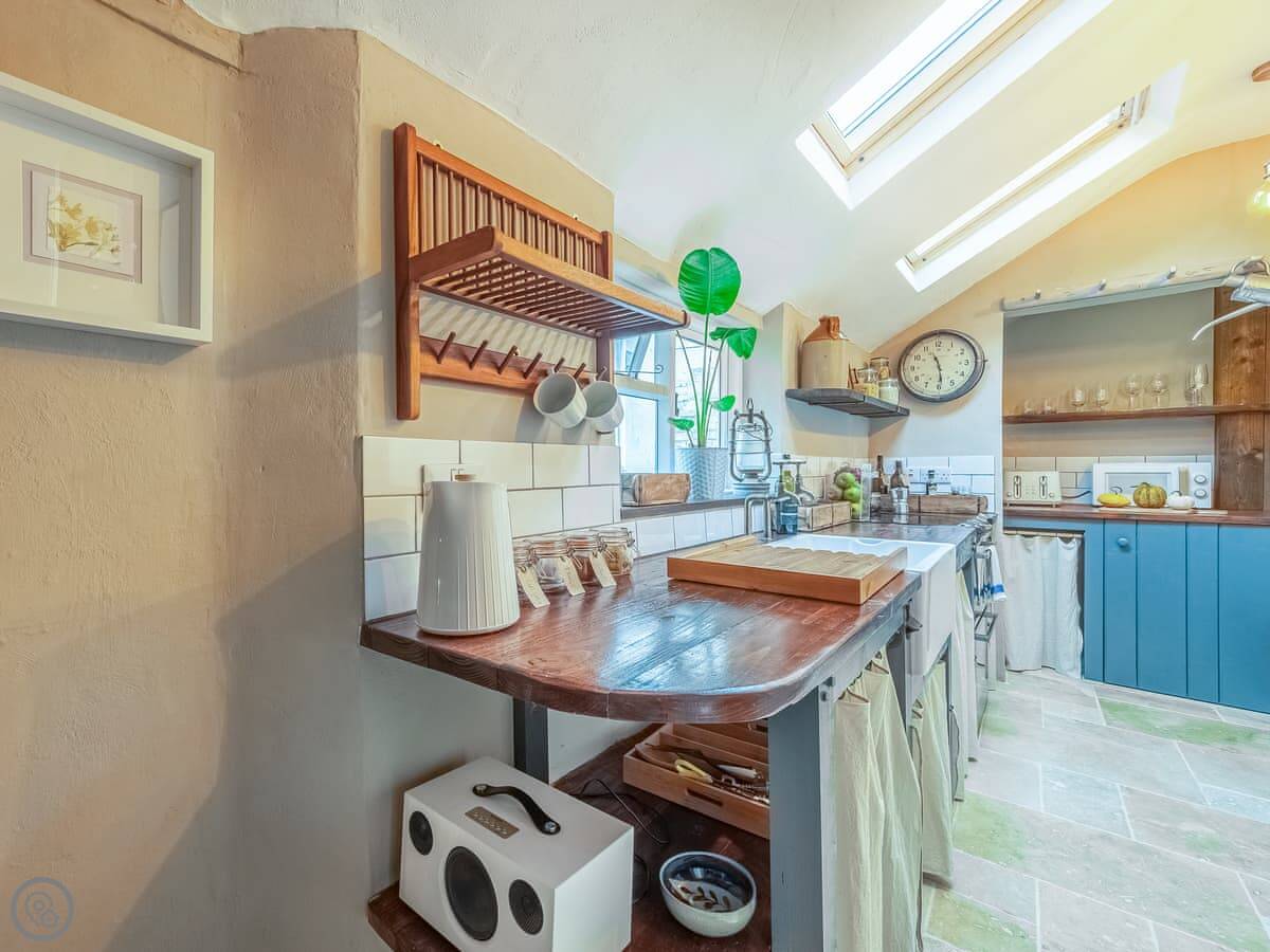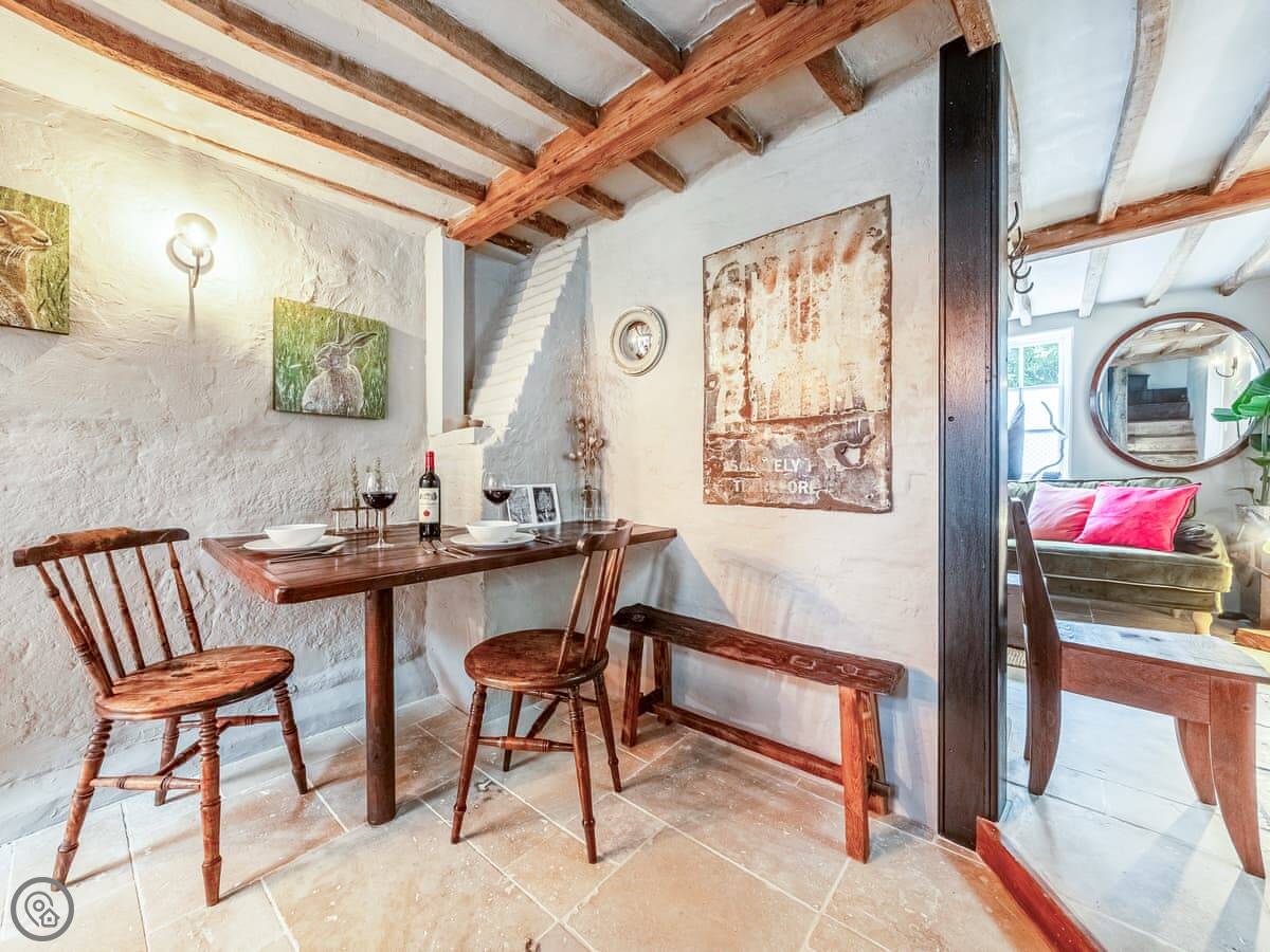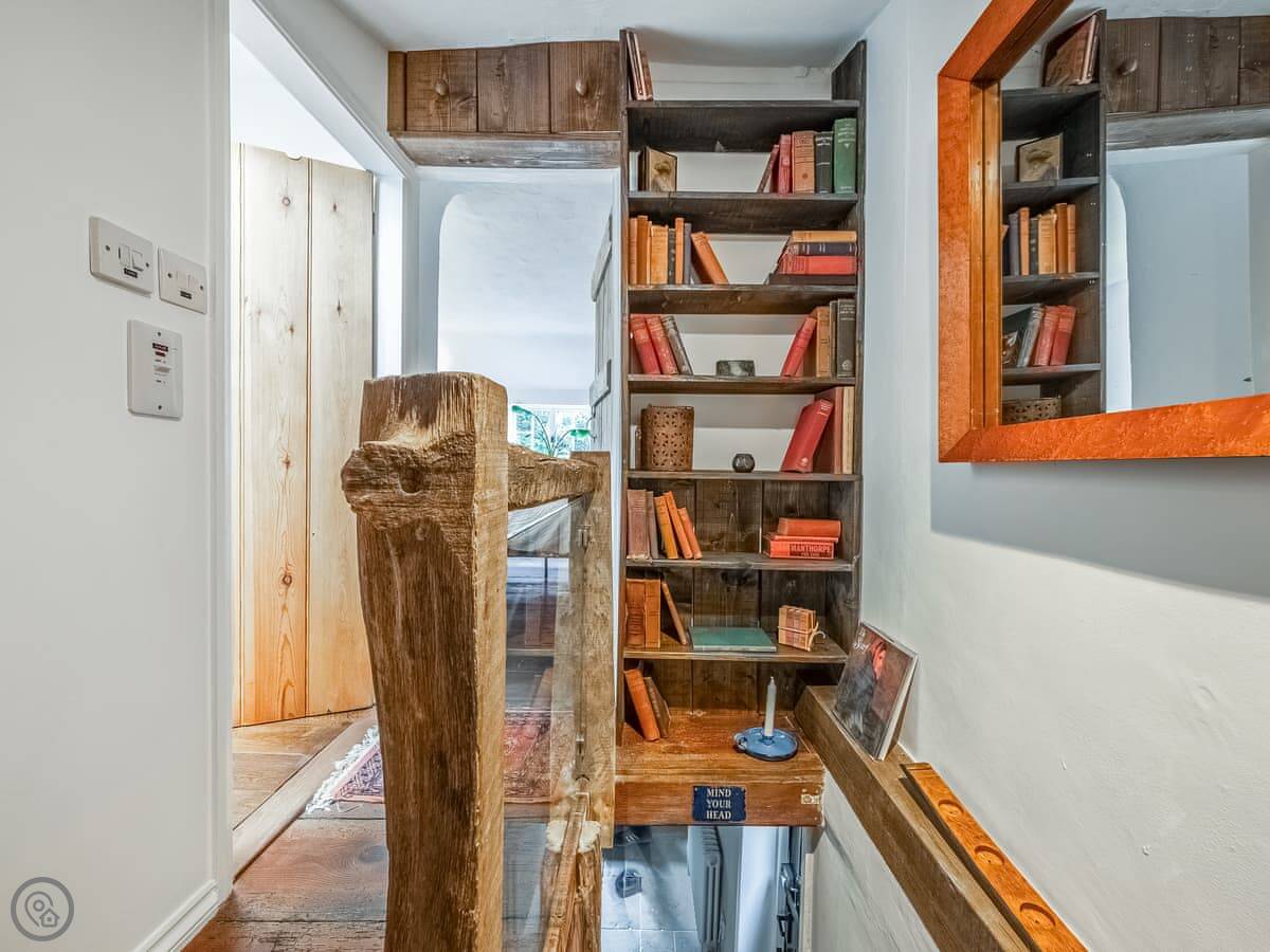 It has a 5 Star rating. We bought it when it was derelict and restored it properly. The main room is downstairs. There's a sofa by the wood burner, which works well and heats the whole place. The stairs go up from there to the bedroom. They're steep and narrow, typical for a cottage this old.