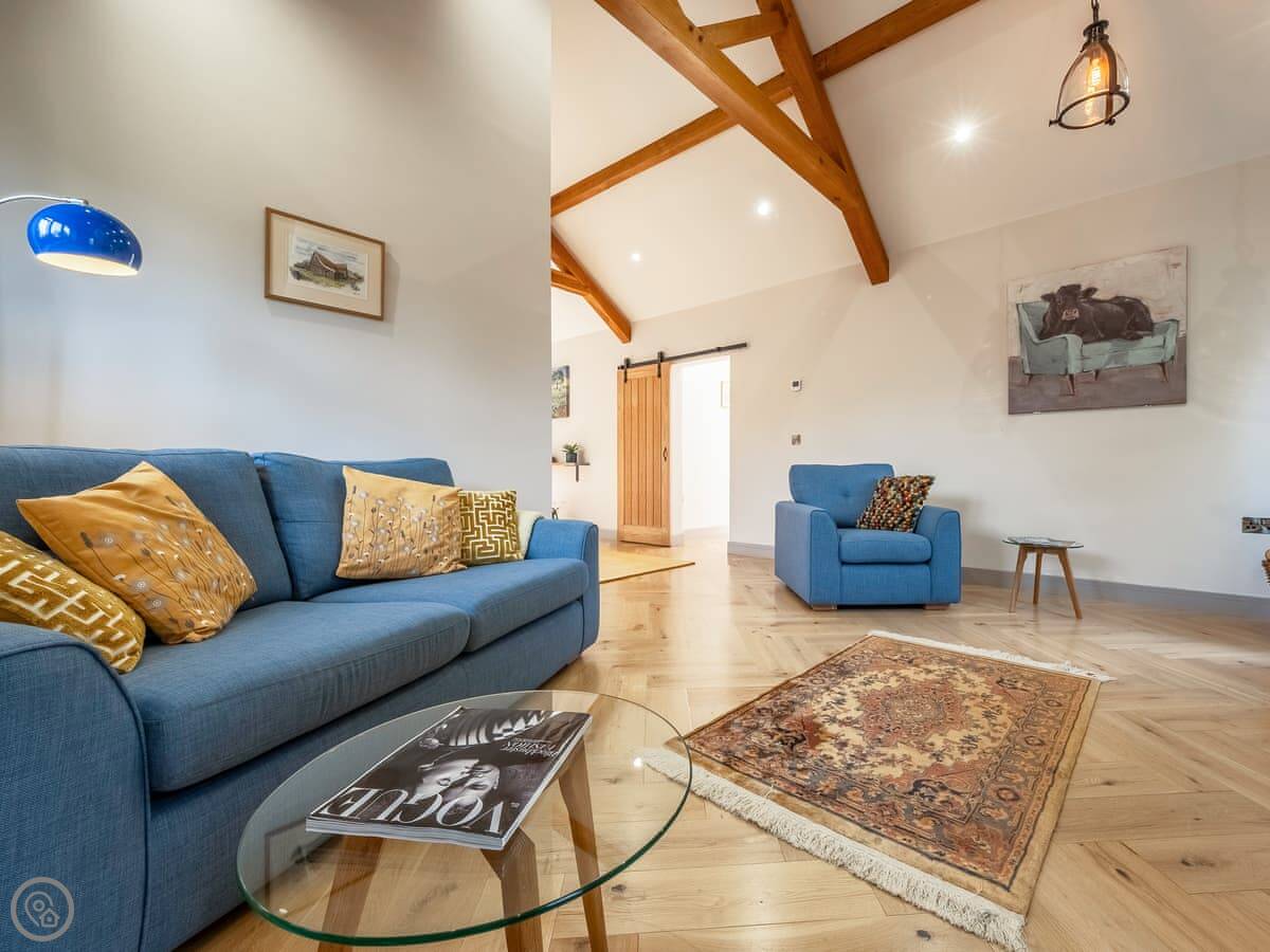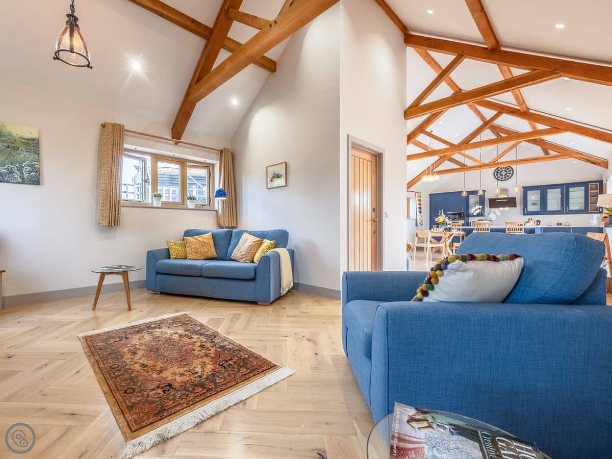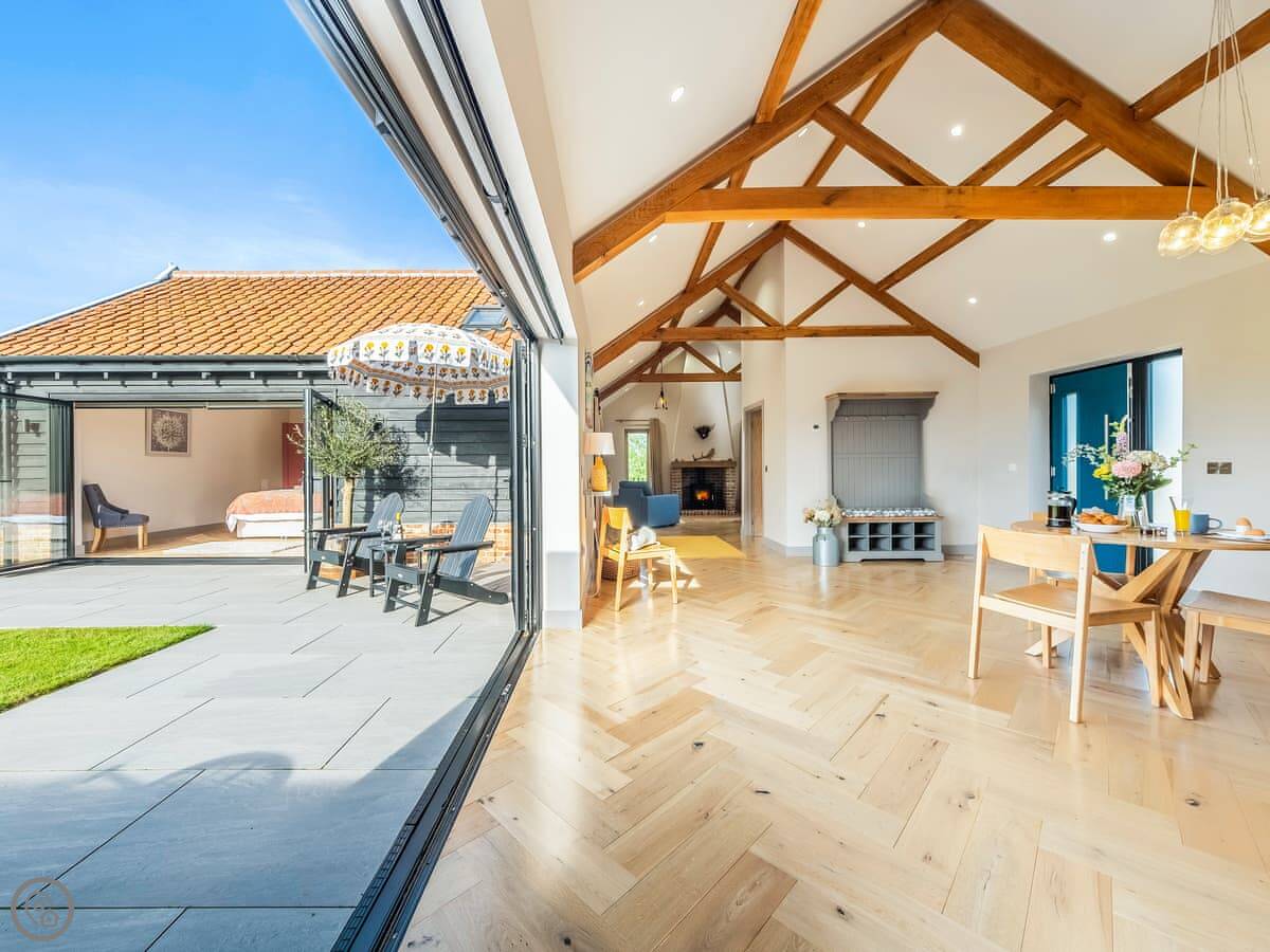 It's a 5 Star place, which means it's been done up to a high standard. Very clean, very tidy. The main room has a high beamed ceiling and oak floors. There are big bifold doors that open out from both the living area and the bedroom straight into your garden.