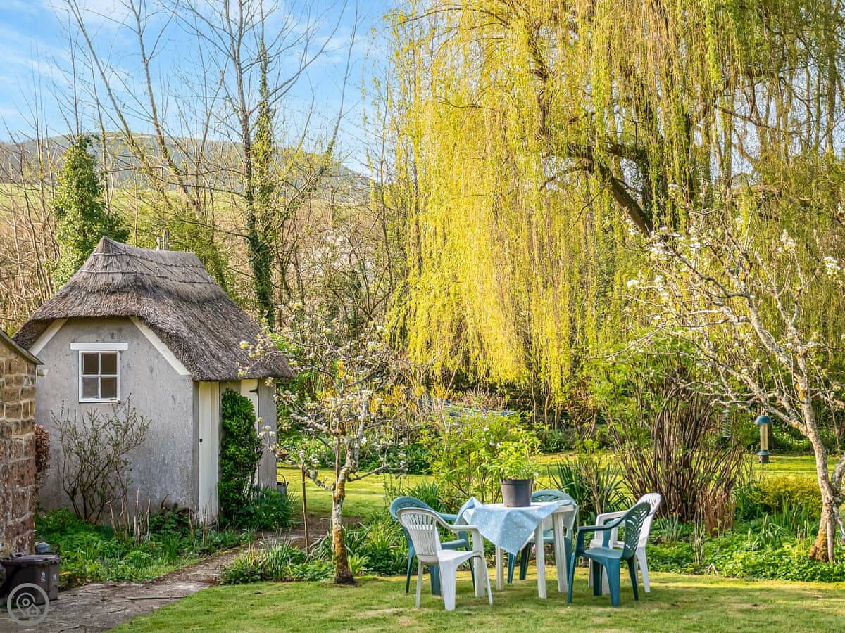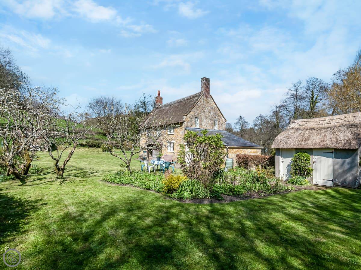 Gore Cottage is in West Milton. It's a thatched cottage, detached. You're right in the village but it feels quiet. The garden is enclosed, mostly lawn with some shrubs.