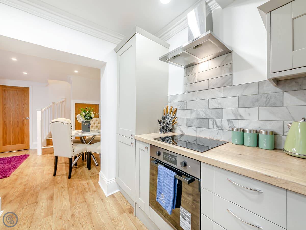 The cottage has been renovated to a high standard. It's open plan downstairs with the kitchen, living and dining area. There's a smart TV. The kitchen is modern and has a dishwasher.