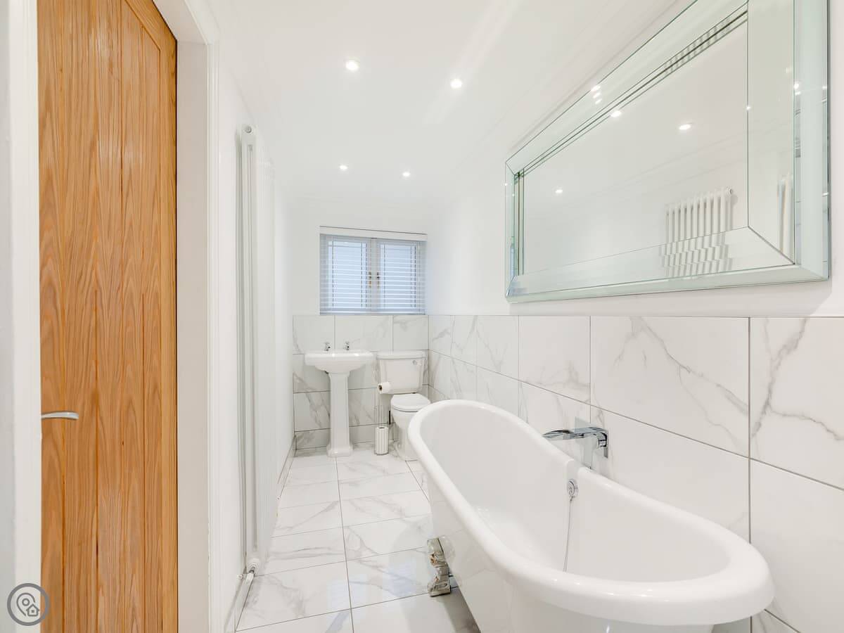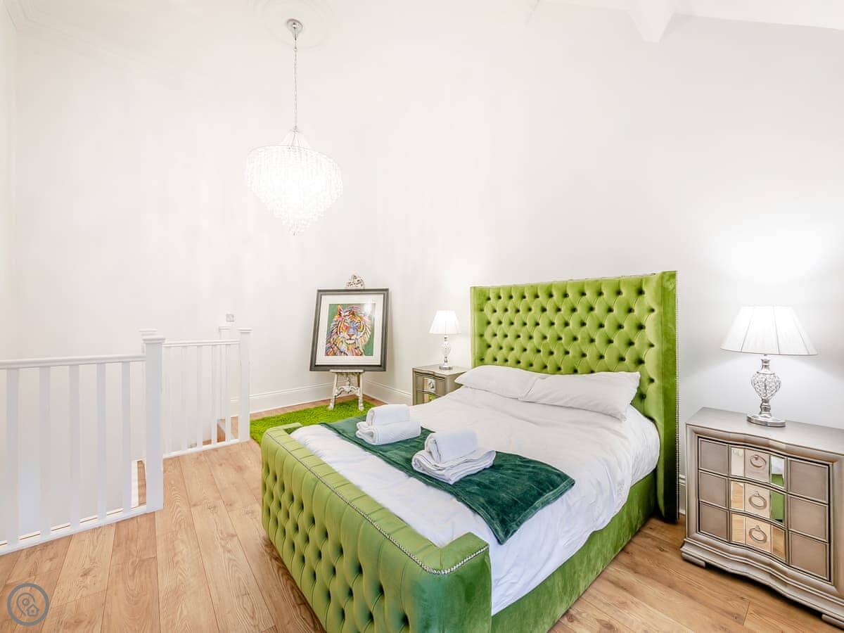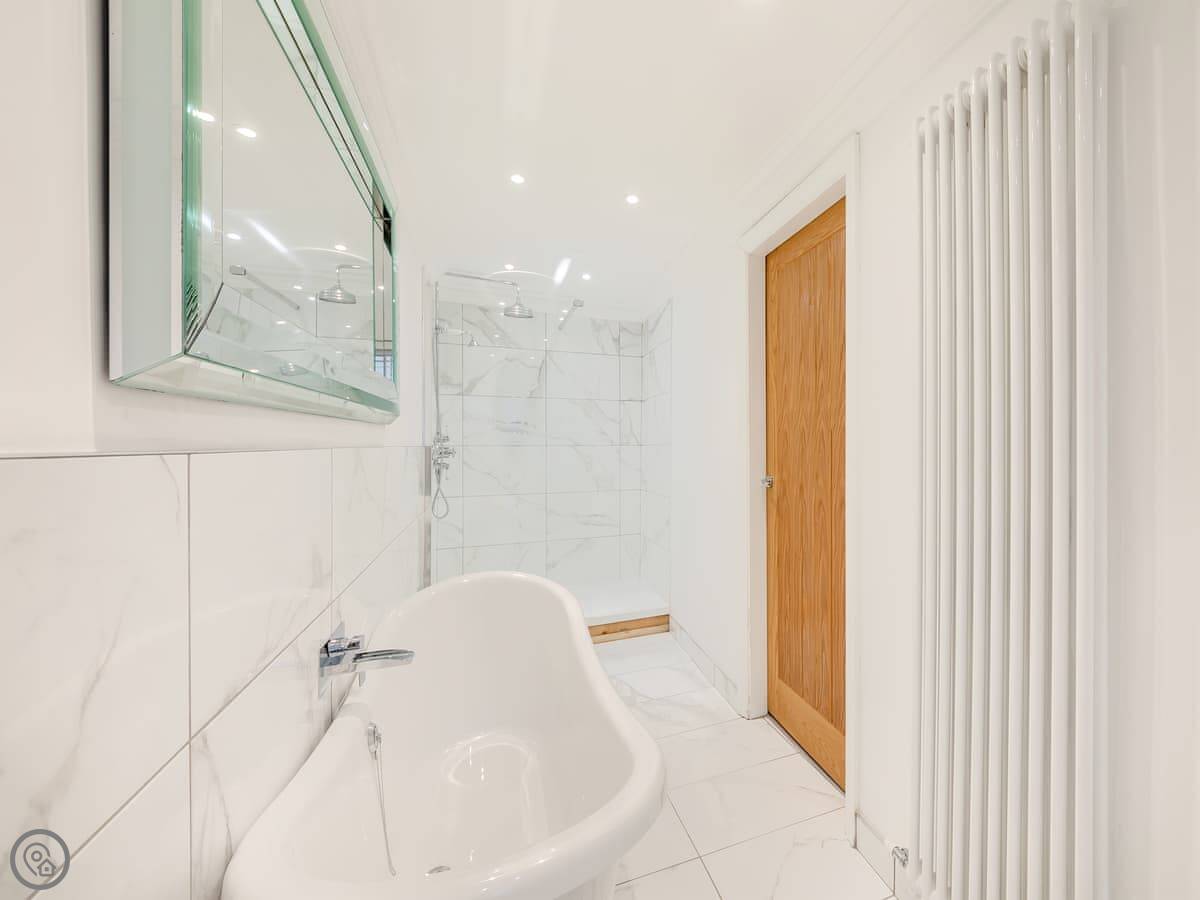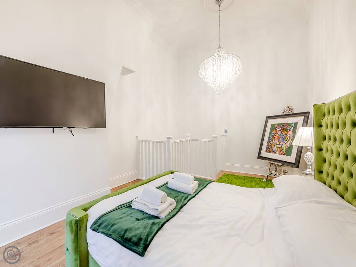 Upstairs is the bedroom with a double bed and a TV. There's also a dressing table. The bathroom has both a free-standing bath and a separate shower cubicle.