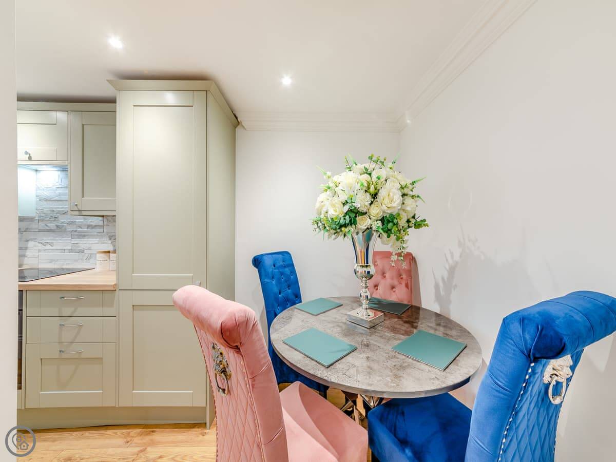 You open the front door straight into the main room. It's open plan, with the kitchen, lounge, and a dining table all in one space. Everything is new. There's a smart TV on the wall. The kitchen has a dishwasher.