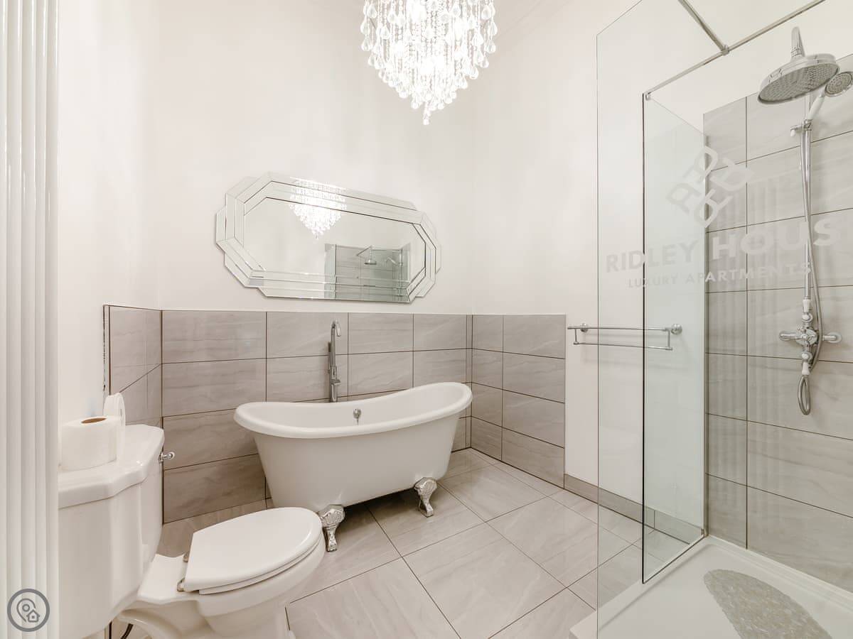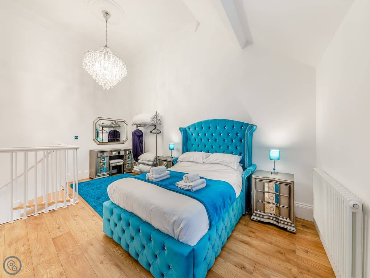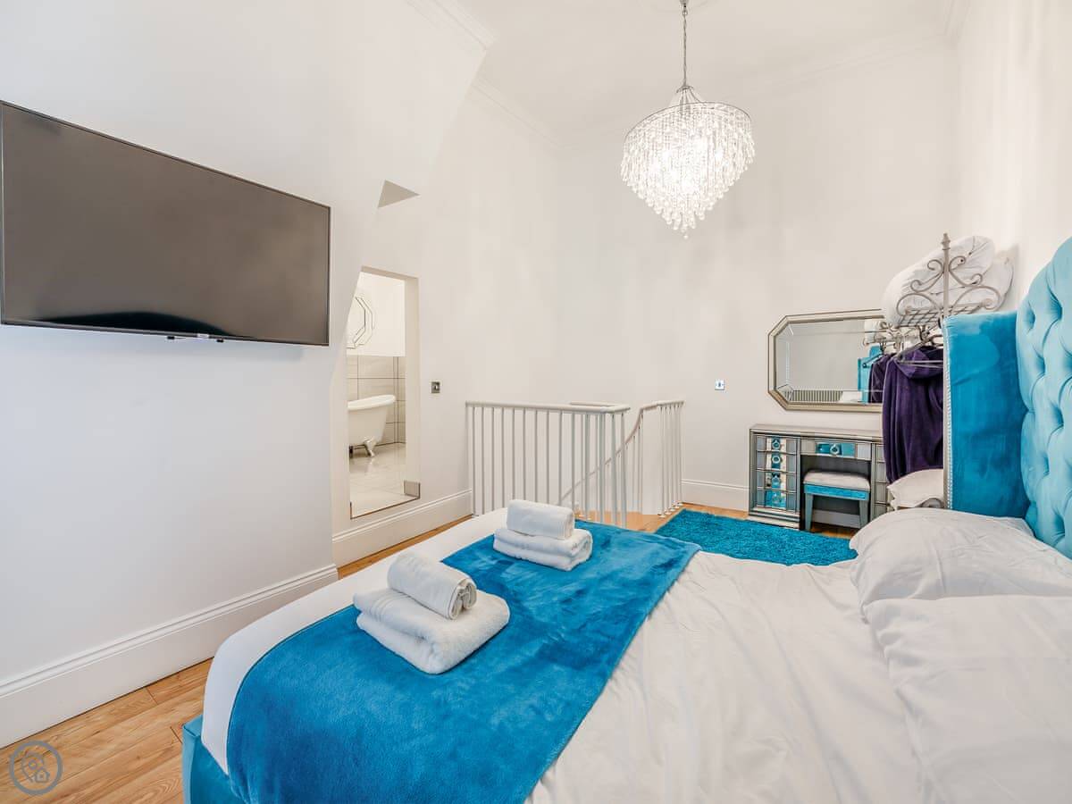 Upstairs is the bedroom. It's got a double bed, another TV, and a dressing table. The bathroom is up there too. It has both a separate shower cubicle and a free-standing bath.