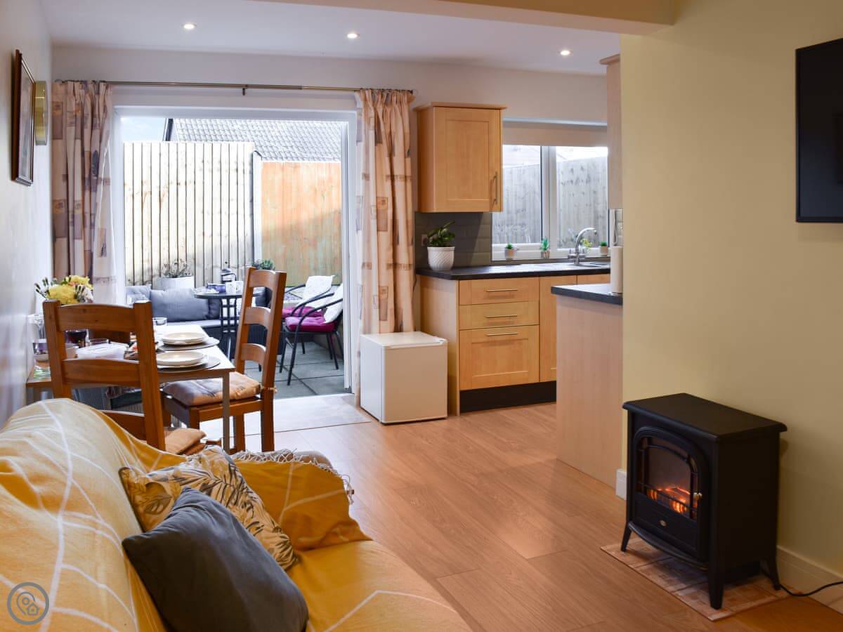 The living space is open plan. The kitchen's at one end. French doors open out to the back courtyard. It's enclosed, gets the sun, and it's private. You can sit out there.