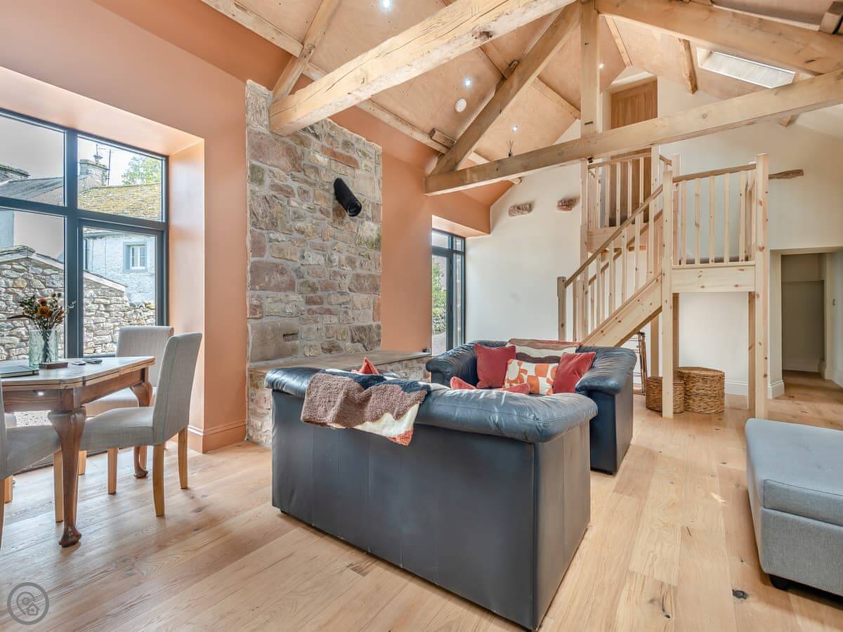 Upstairs is all open plan. Living room, kitchen, dining area. There's a wood burner and a smart TV. The stairs are a typical cottage staircase, so they turn a corner and are a bit steep.