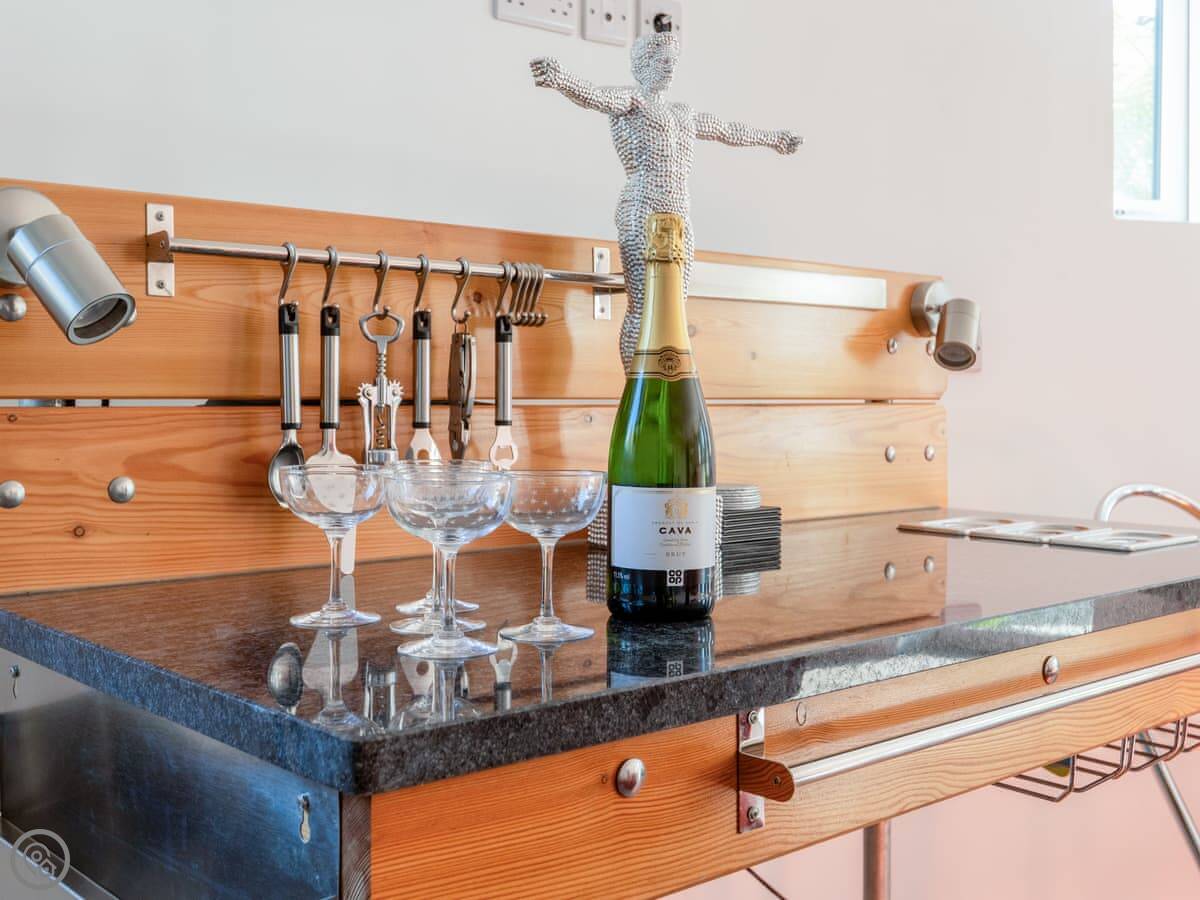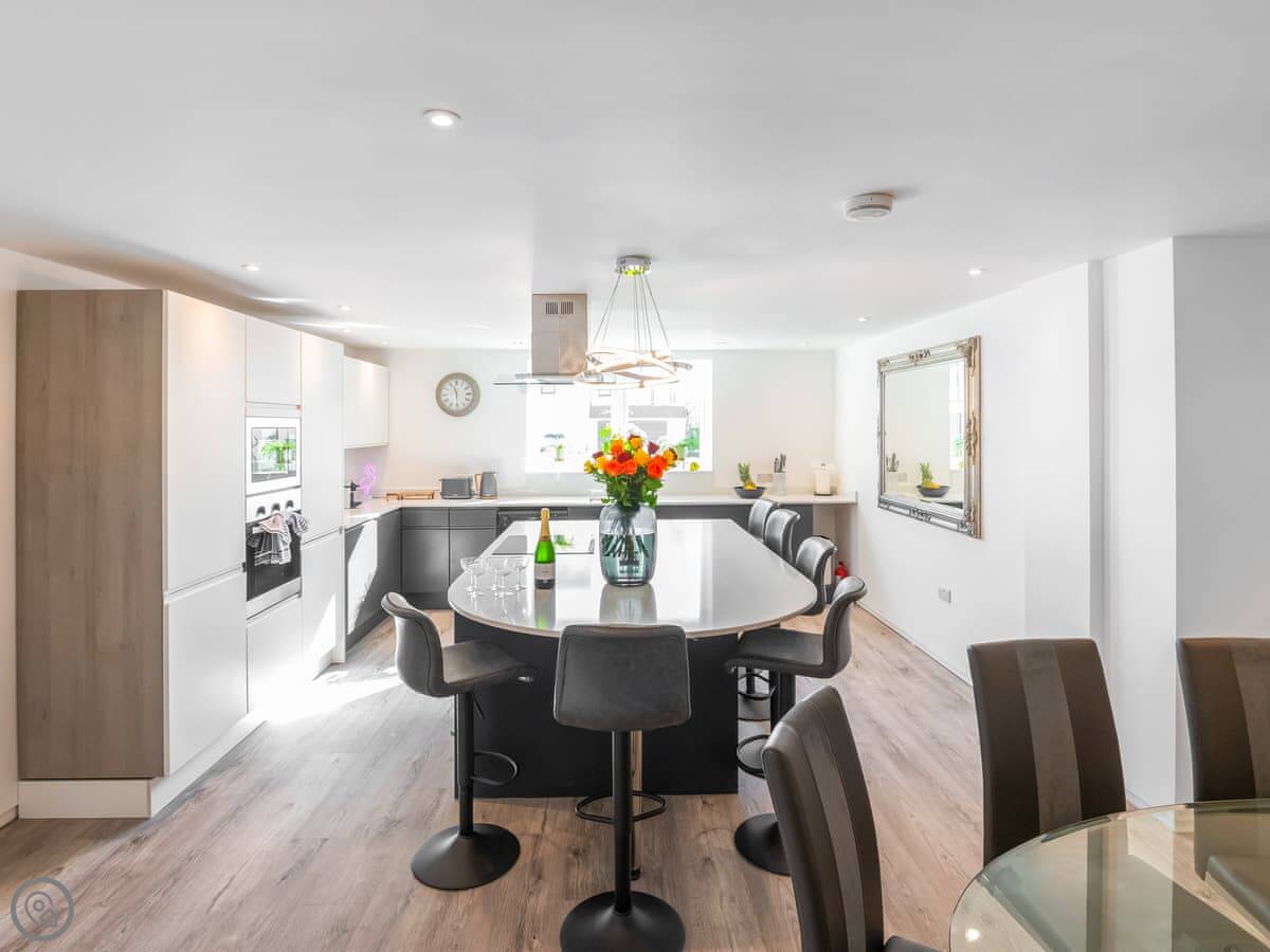 The main thing is the space. There's a big kitchen and dining area with an island. The table expands. Then there's a separate round room – they call it The Turret – with sofas, a sofa bed, a little bar area, and table football. It's a good room if some want to watch telly and others want to play a game.