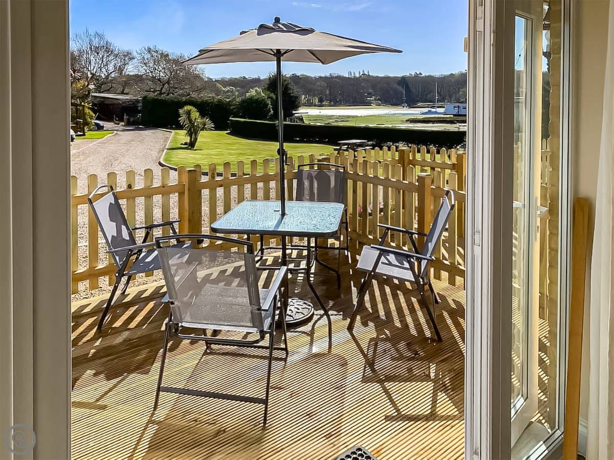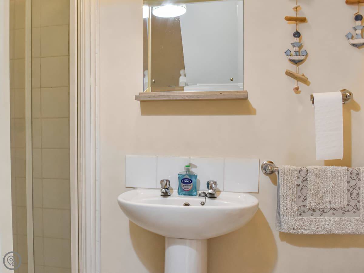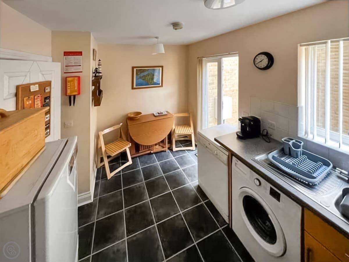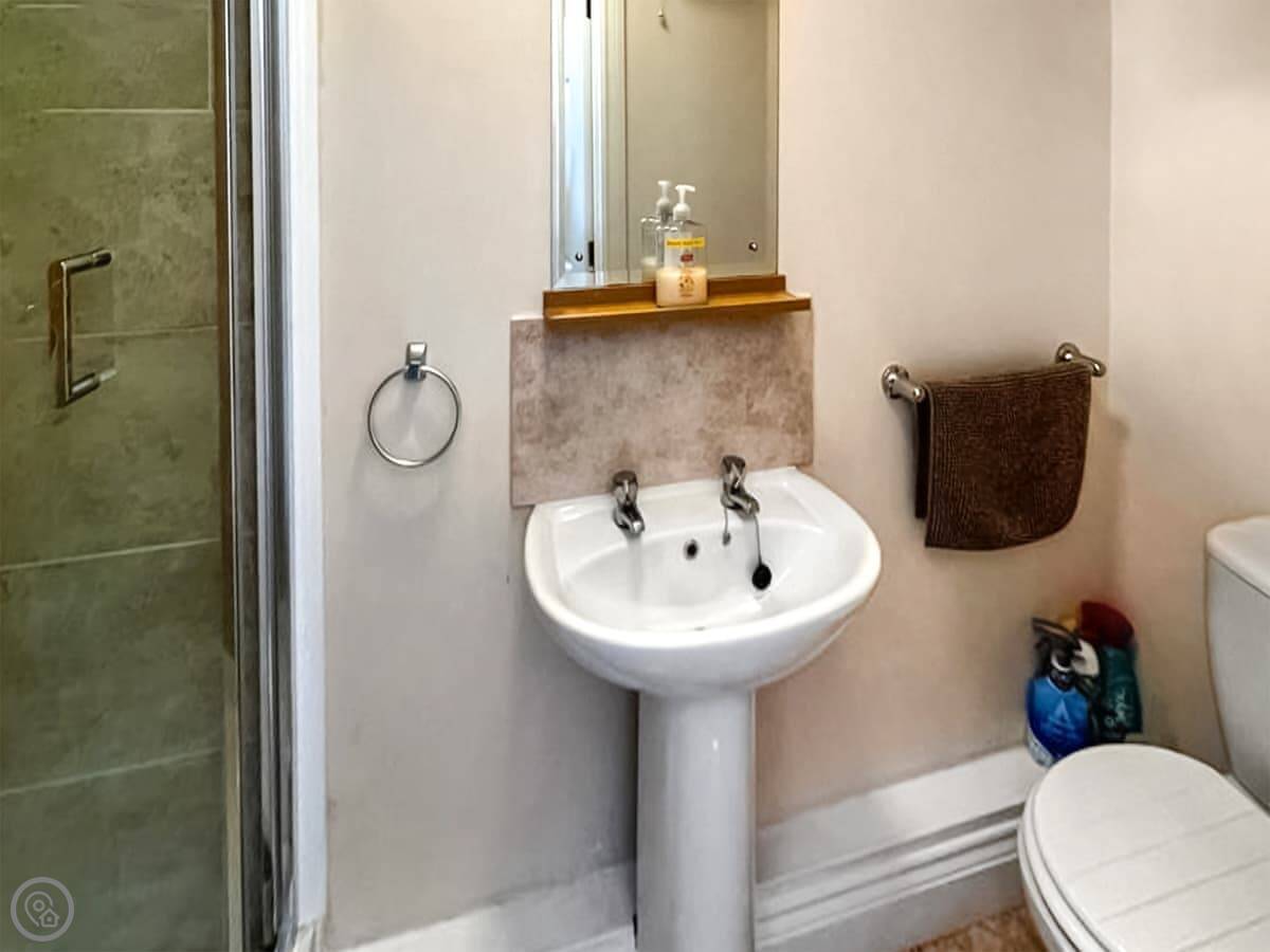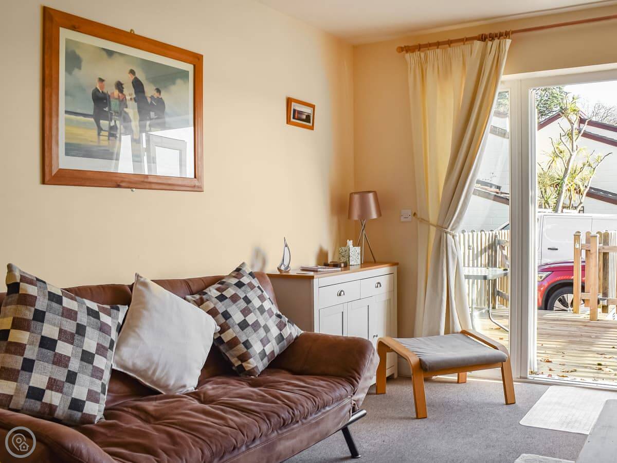 It sleeps four. Two bedrooms, both upstairs, and they each have their own bathroom. There's another shower room downstairs too, which is handy. The kitchen has a table and doors out to a shared garden. At the front there's a decked area with a table and chairs if you want to sit outside.