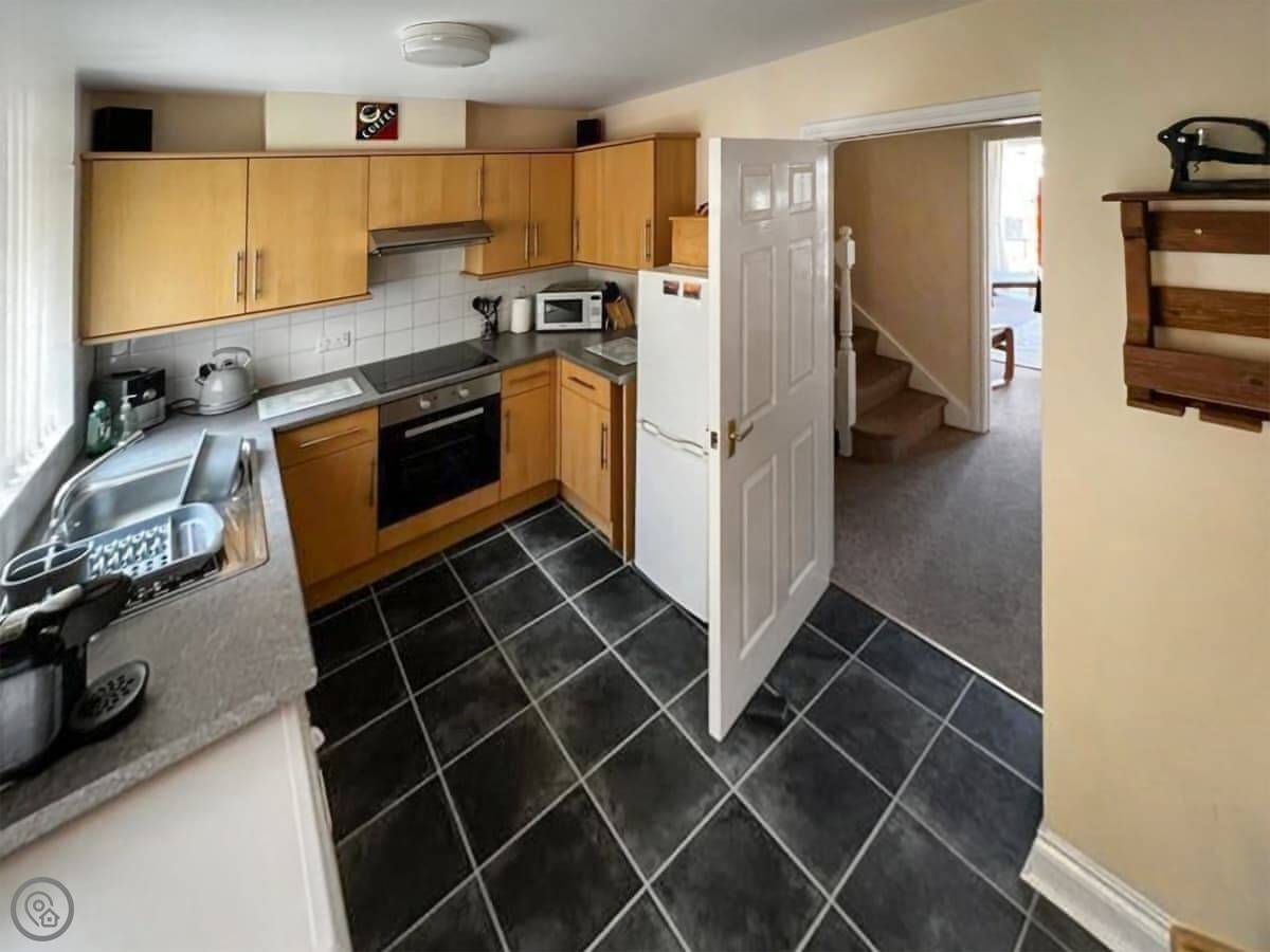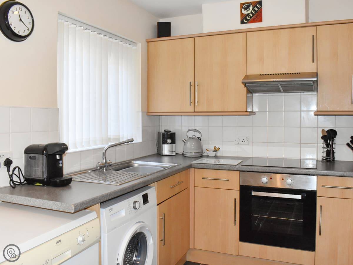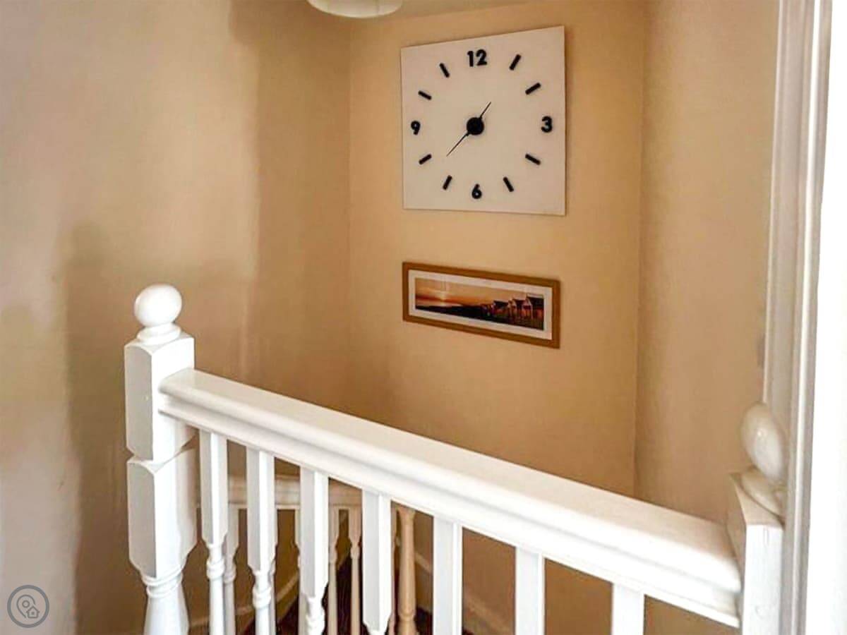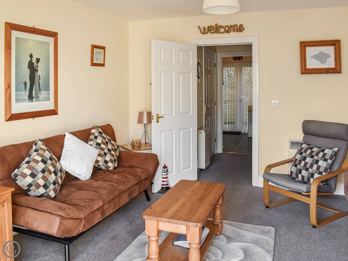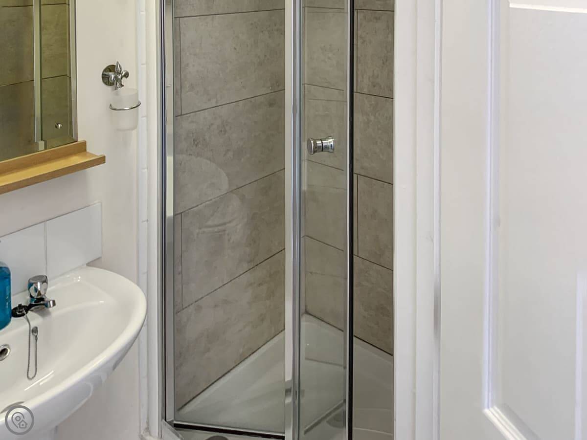 It sleeps four. Two bedrooms, both upstairs, and they each have their own bathroom. There's another shower room downstairs too, which is handy. The kitchen has a table and doors out to a shared garden. At the front there's a decked area with a table and chairs if you want to sit outside.