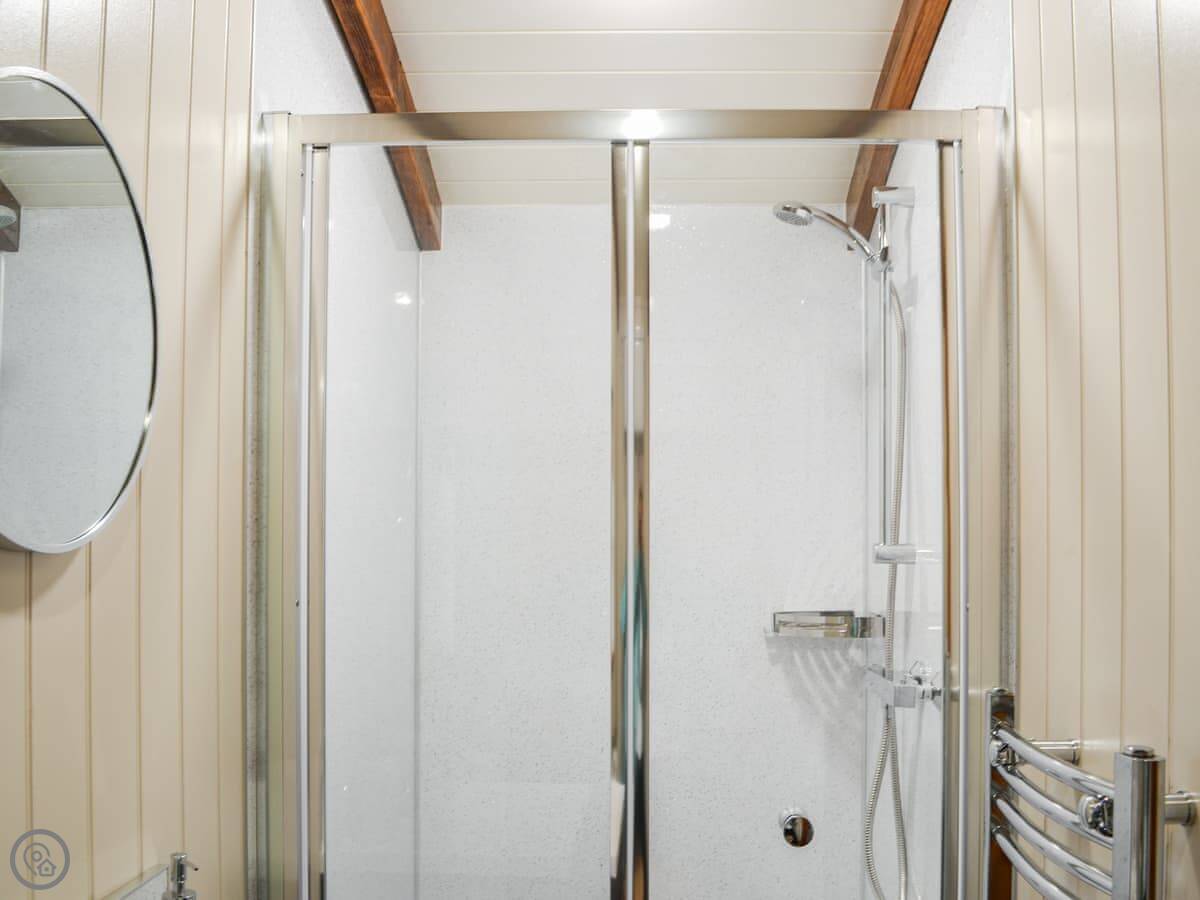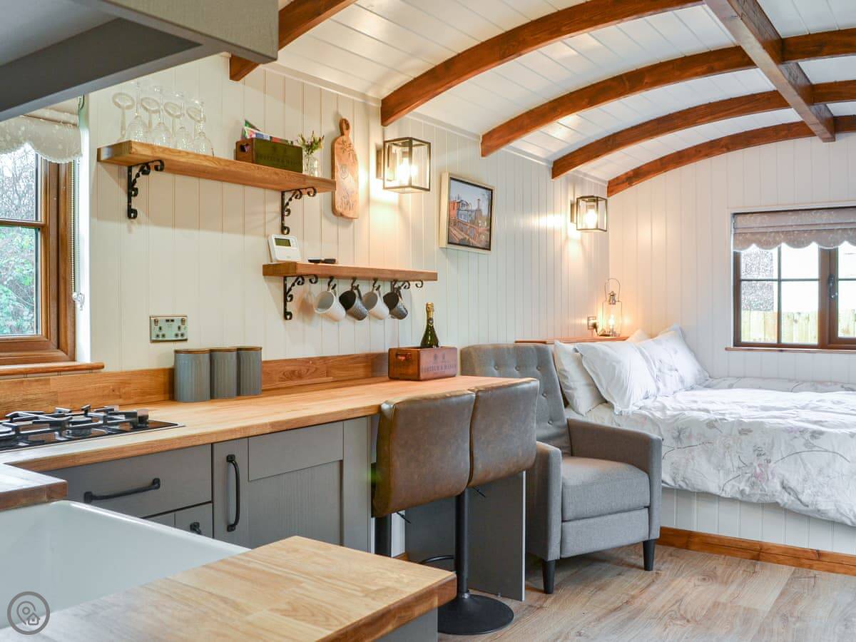 It's for two people. One room, one shower room. It's got a 4 Star rating. It's done up nicely inside, everything's clean and works. It's glamping, so it's compact, but it's got what you need. The bed is in the main living space.