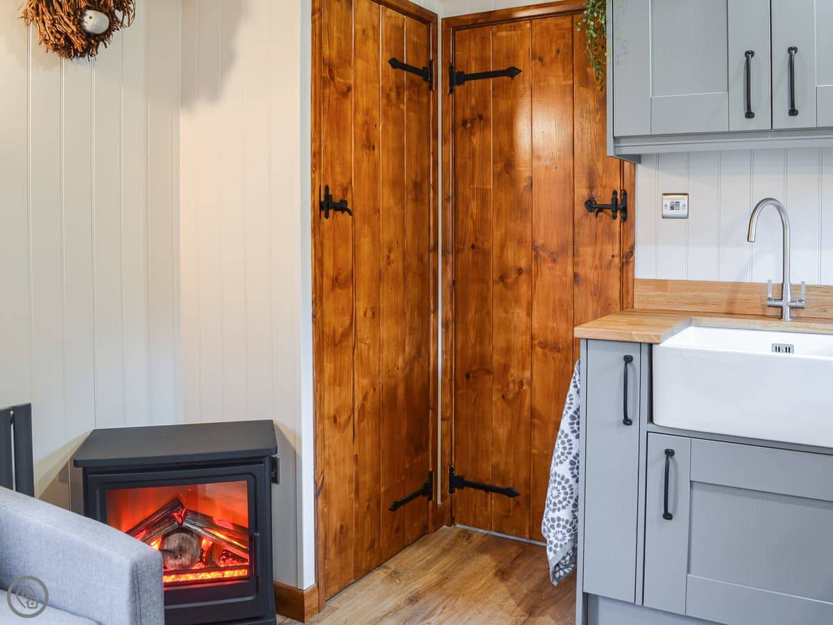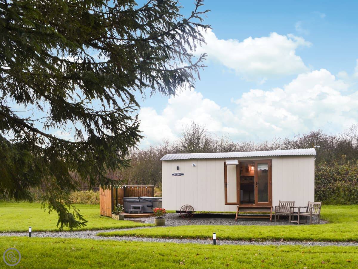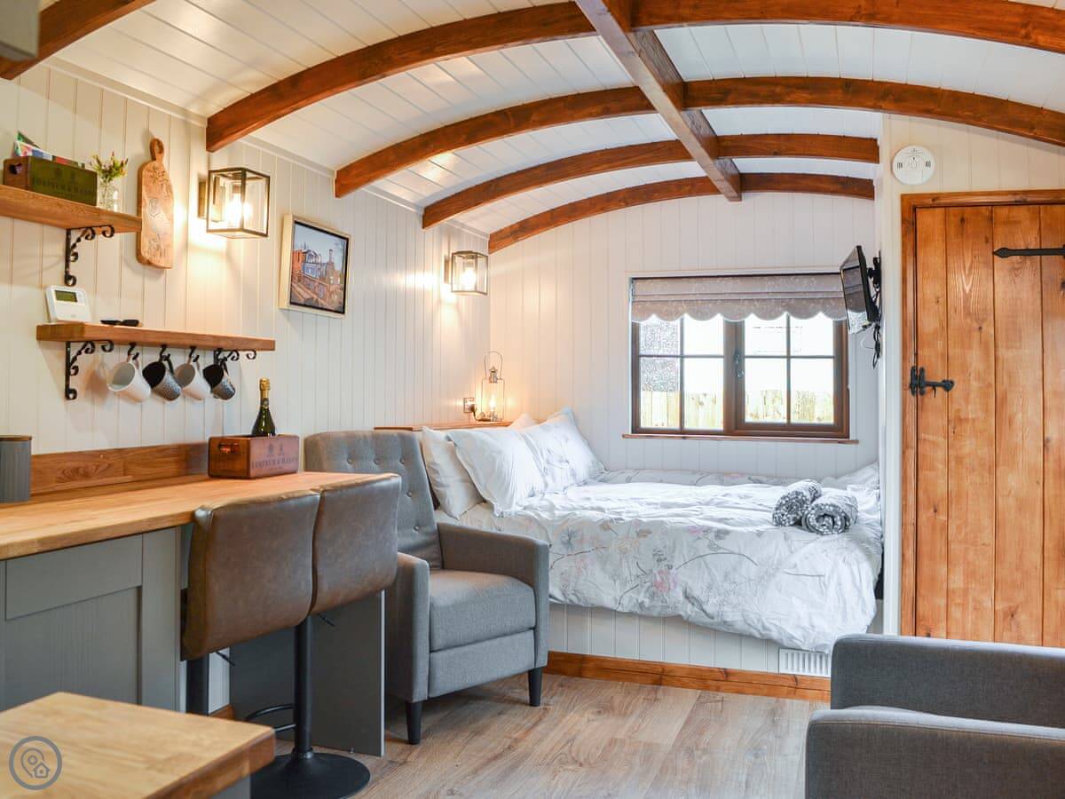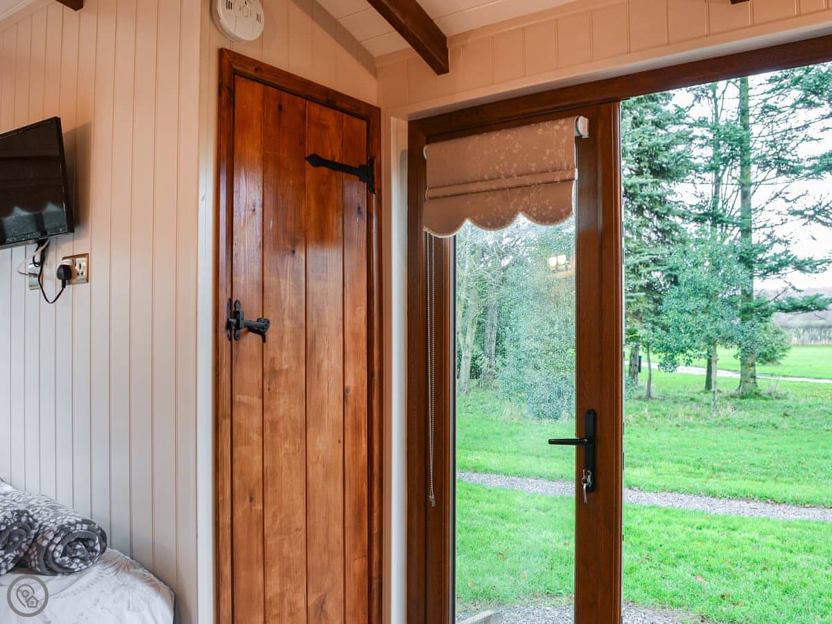 The Blue Bell is one of two shepherd's huts on our working farm here near Pocklington. It's a detached hut, so you're on your own out there. The view is just fields.