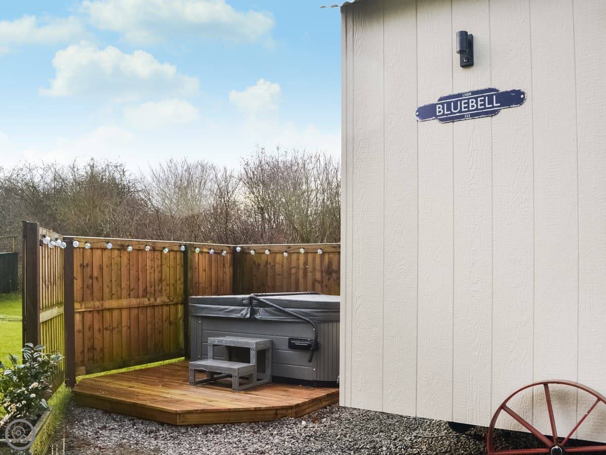 You've got French doors that open out onto your own patio area with seating and a BBQ. The hot tub is next to the hut, for your use. It's set to one side so it's private.