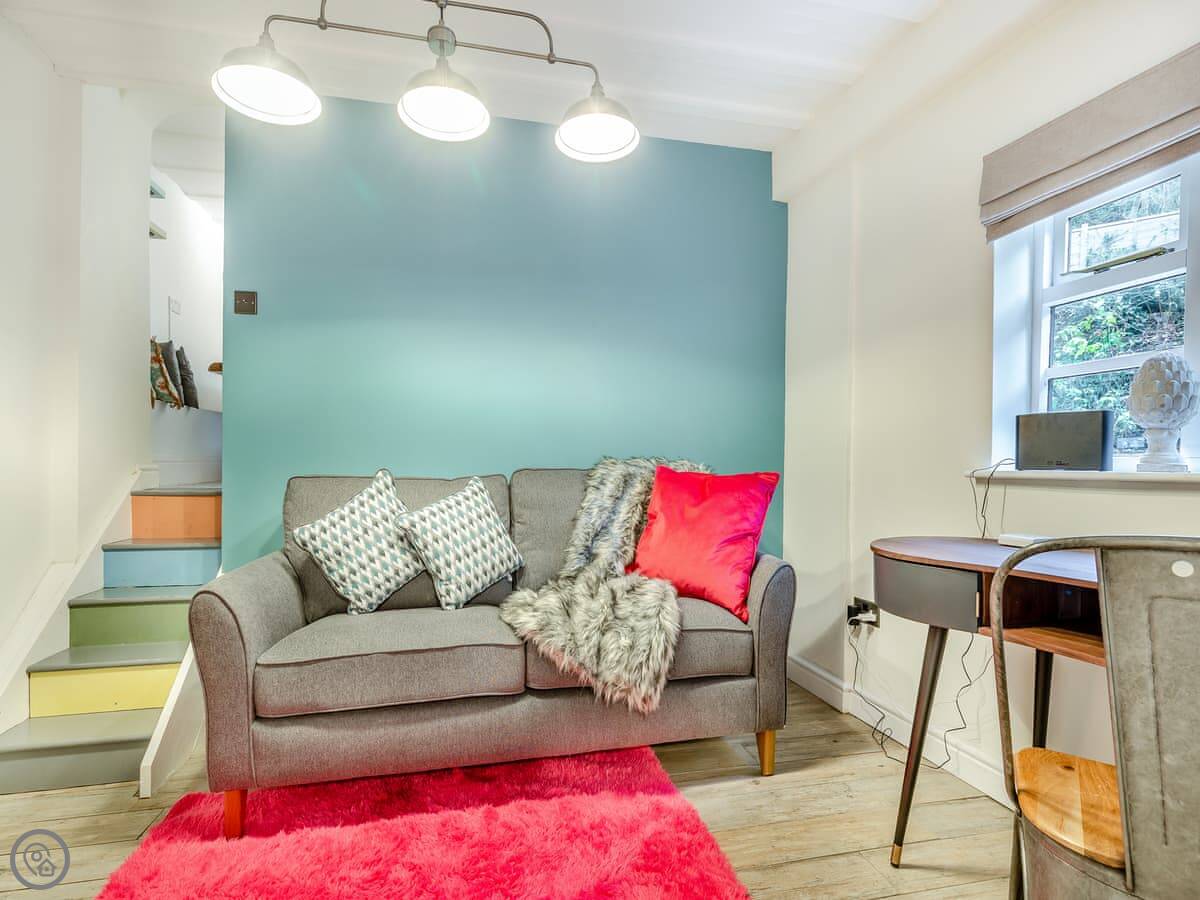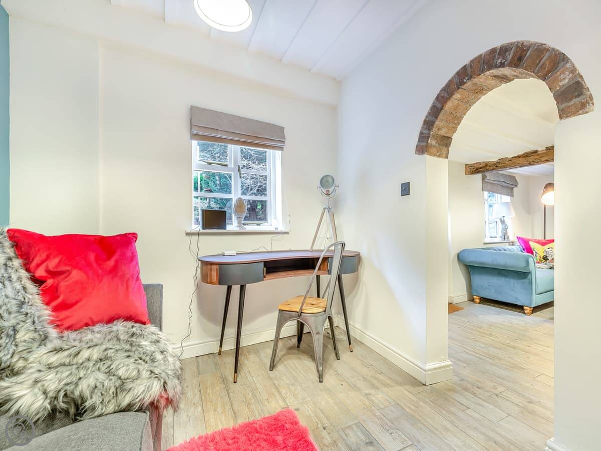 Inside, it's got period features like the fireplaces. The living room is a good size for everyone to sit together. There's a desk in the corner if you need to work.