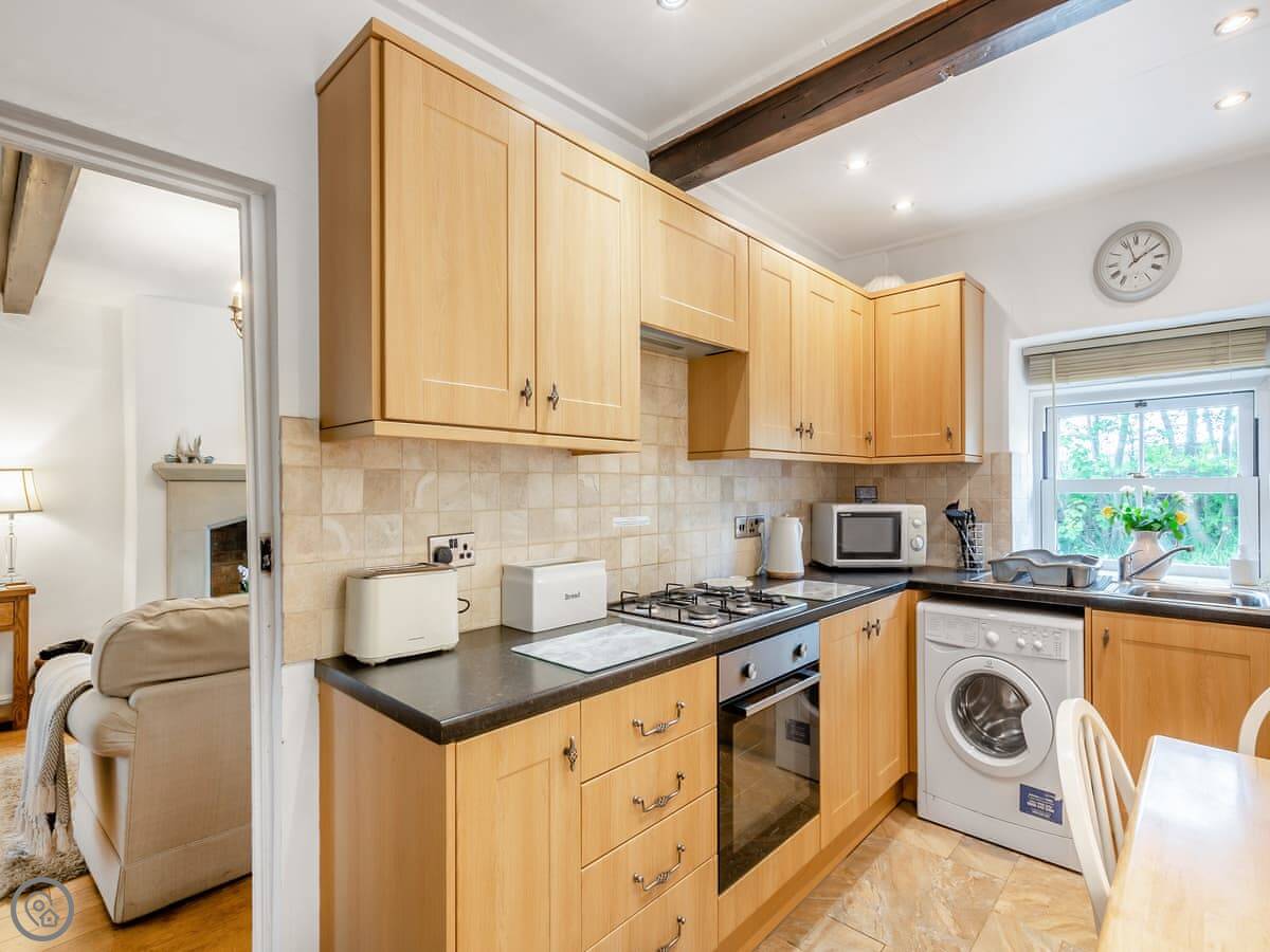 On the facilities, you've got a wood burner in the sitting room, a washing machine, WiFi, and parking. Bedding and towels are included. There's a cot and a highchair if you need them. No pets.
